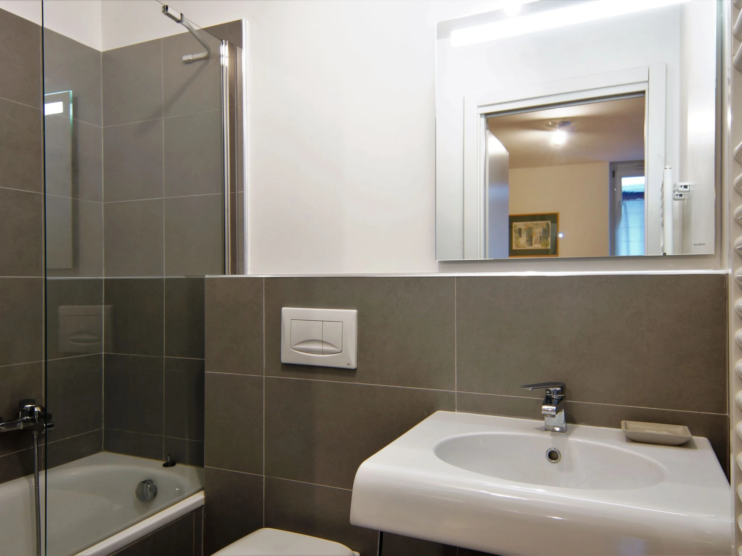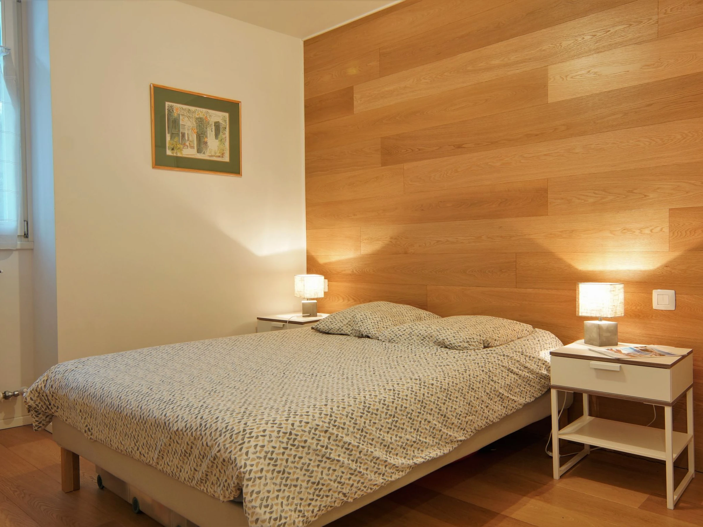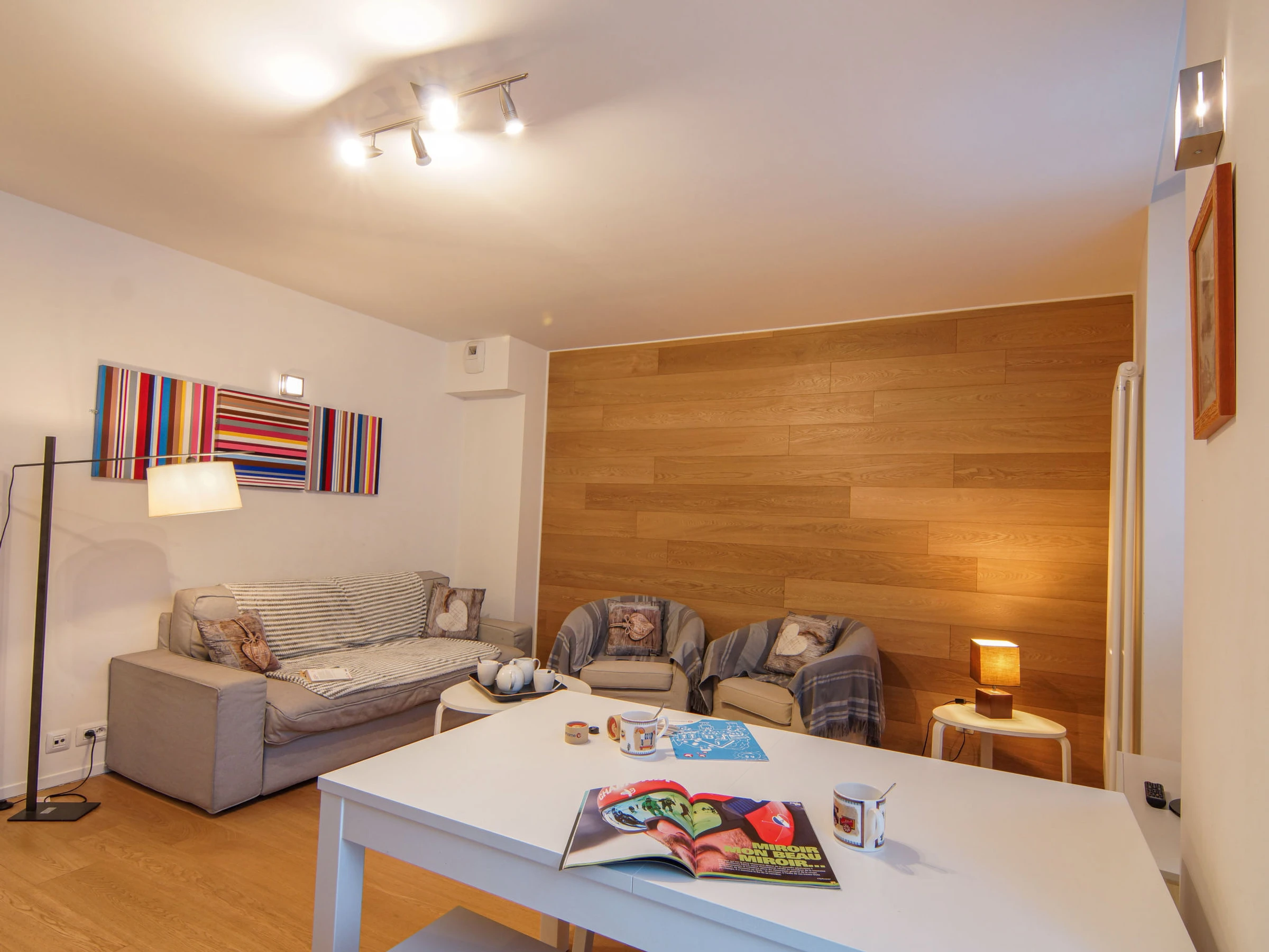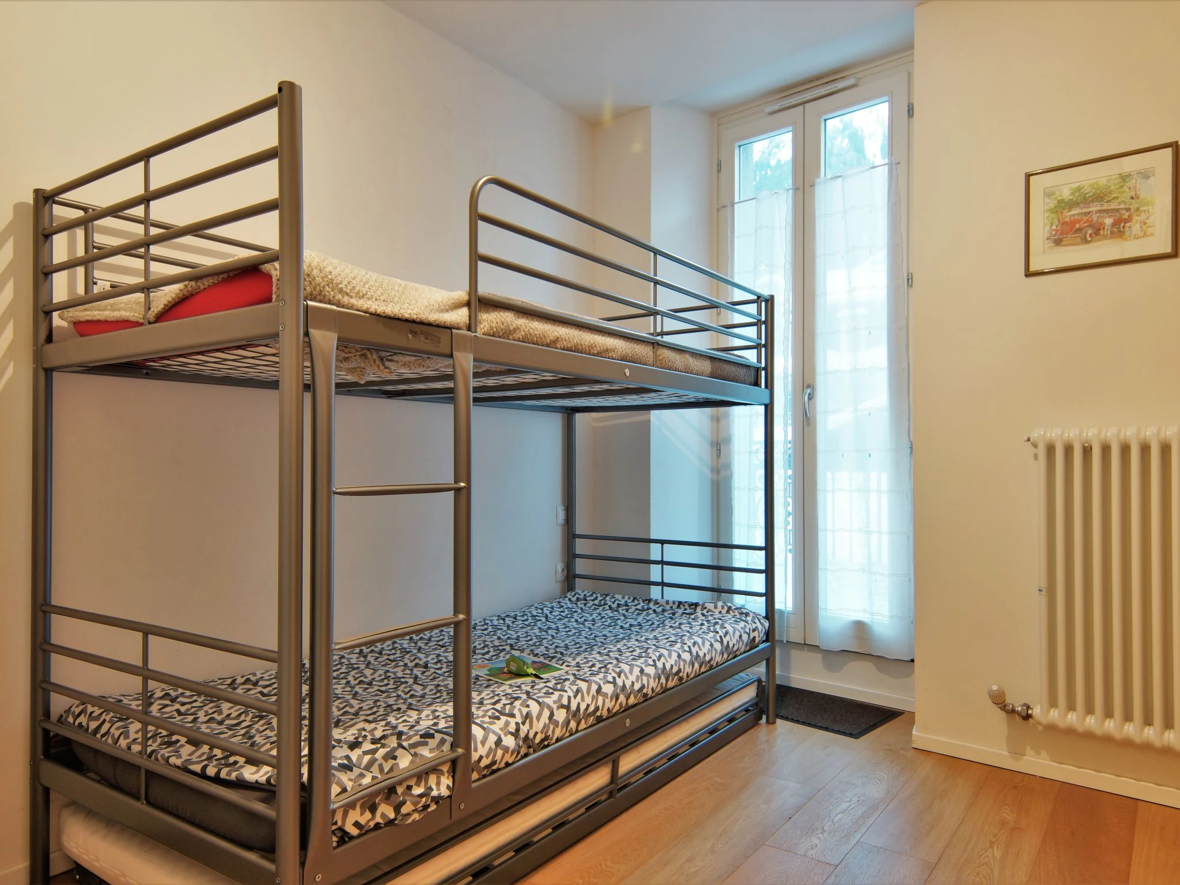 3-room apartment 48 m2 on 2nd floor. Living/dining room with TV (flat screen). Exit to the balcony. 1 large room with 1 french bed (140 cm, length 190 cm), bathroom. 1 room with 1 x 2 bunk beds (90 cm, length 190 cm). Exit to the balcony. Open kitchen (oven, dishwasher, 4 induction hot plates, toaster, microwave, electric coffee machine). Shower, sep. WC. Balcony 5 m2, north-west facing position. Beautiful view of the mountains. Facilities: Internet (WiFi, extra). Parking space n 1 en sous-sol at 500 m. Please note: non-smokers only. TV only FR. Smoke alarm. [hidden]