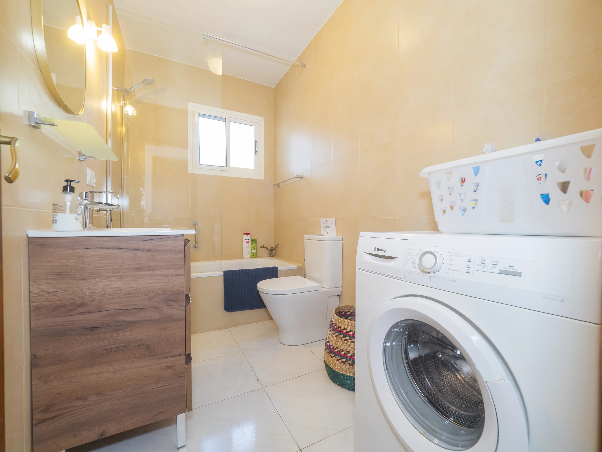 The house has two bedrooms, both exterior and with space to store luggage neatly. One has a double bed and an en-suite bathroom with a shower tray, while the second offers two single beds. In the hallway connecting the rooms, there is a second bathroom, also equipped with a washing machine for greater comfort during your stay. 🛏️🚿