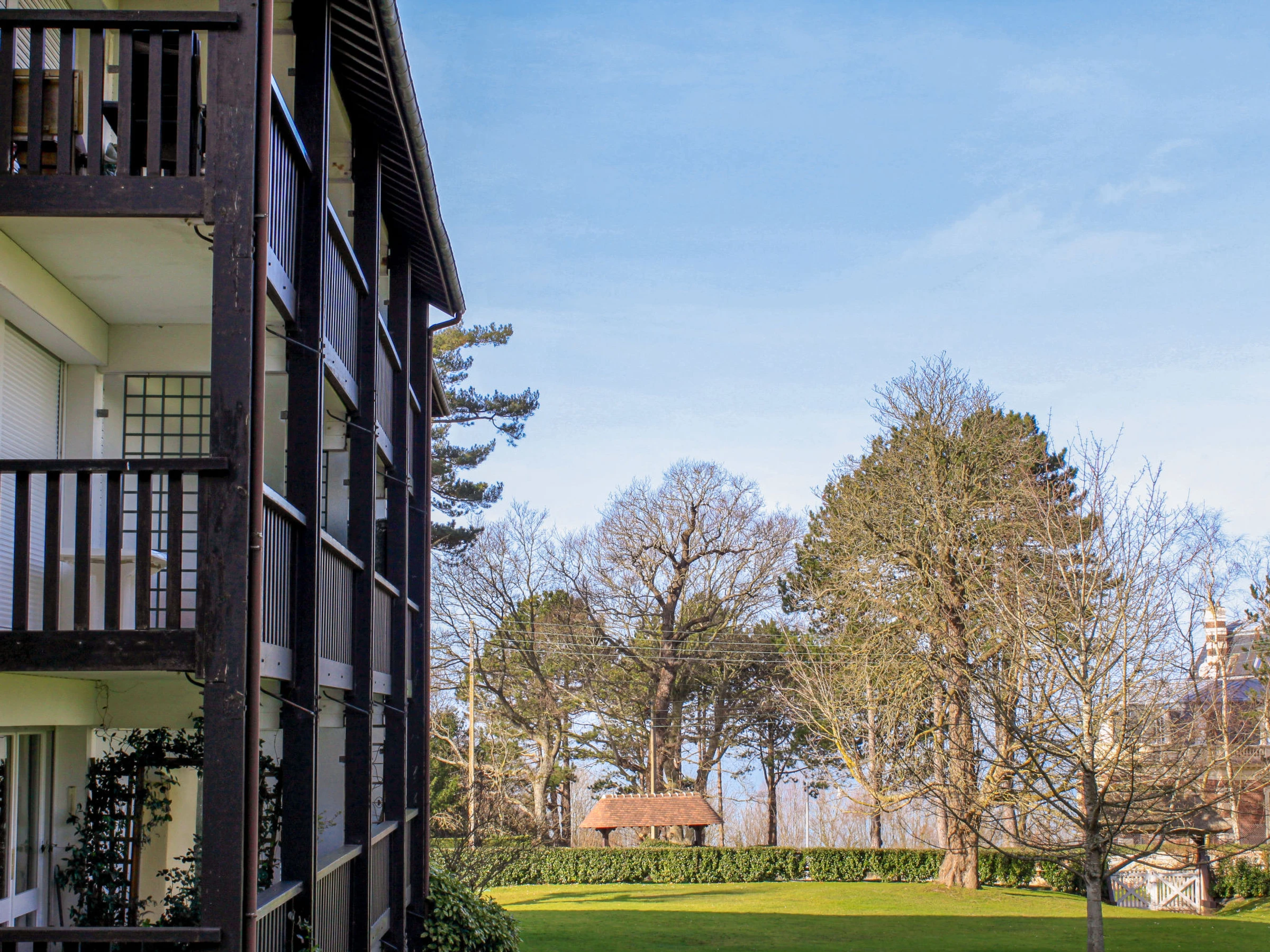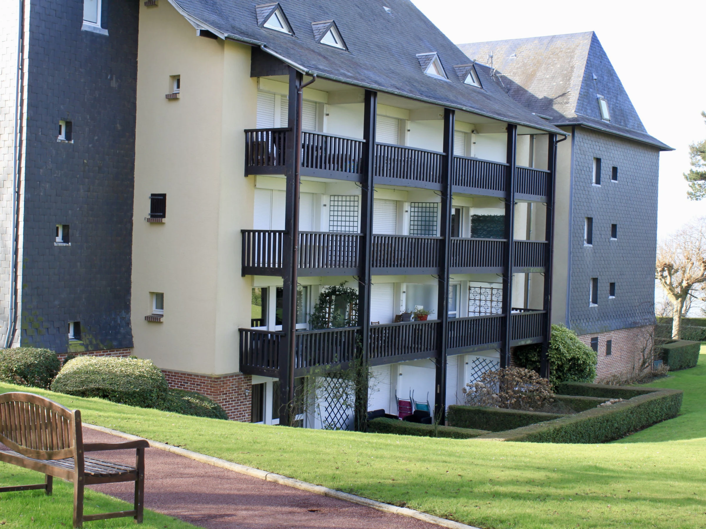 Trouville-sur-Mer 1 km from Deauville: Residence "Le Parc de la Chaumière", 4 storeys. 1.5 km from the centre of Trouville-sur-Mer, on top of a hill, 850 m from the sea. For shared use: park, beautiful garden to relax, pond. In the complex: lift. Shop 1.5 km, grocery 1.8 km, supermarket 4.2 km, restaurant 1.5 km, bus stop "Prémanoir" 100 m, railway station "Deauville-Trouville" 2.4 km, sandy beach 850 m, indoor swimming pool 4.1 km, thermal baths "cures marines Trouville sur mer" 1.9 km. Golf course (18 hole) 6.2 km. Nearby attractions: Casino de Trouville sur Mer 1.8 km, Hippodrome Deauville La Touques 3.6 km, Honfleur, village typique 14 km, Memorial de Caen 57 km, Plages du débarquement d'Arromanches 75 km. The keys‘ handover takes place by the agency in Deauville.