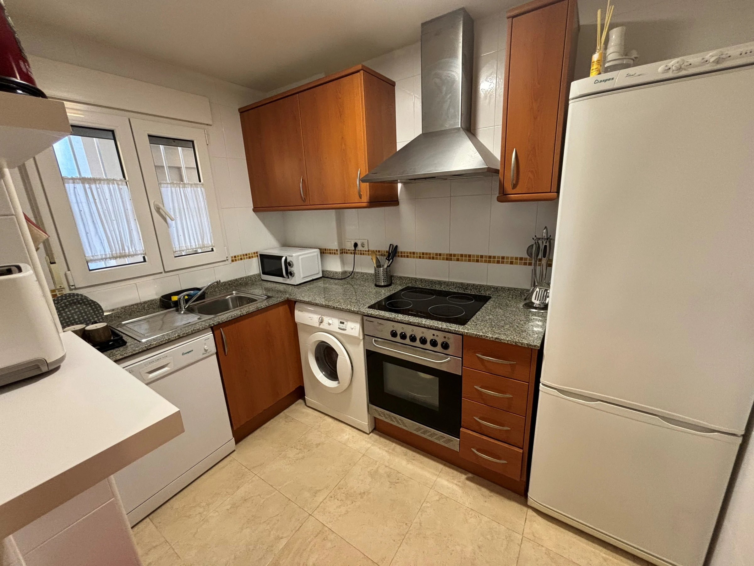 The independent kitchen is fully equipped with a ceramic hob, refrigerator, microwave, oven, dishwasher, dishes/cutlery, kitchen utensils, coffee maker and toaster.