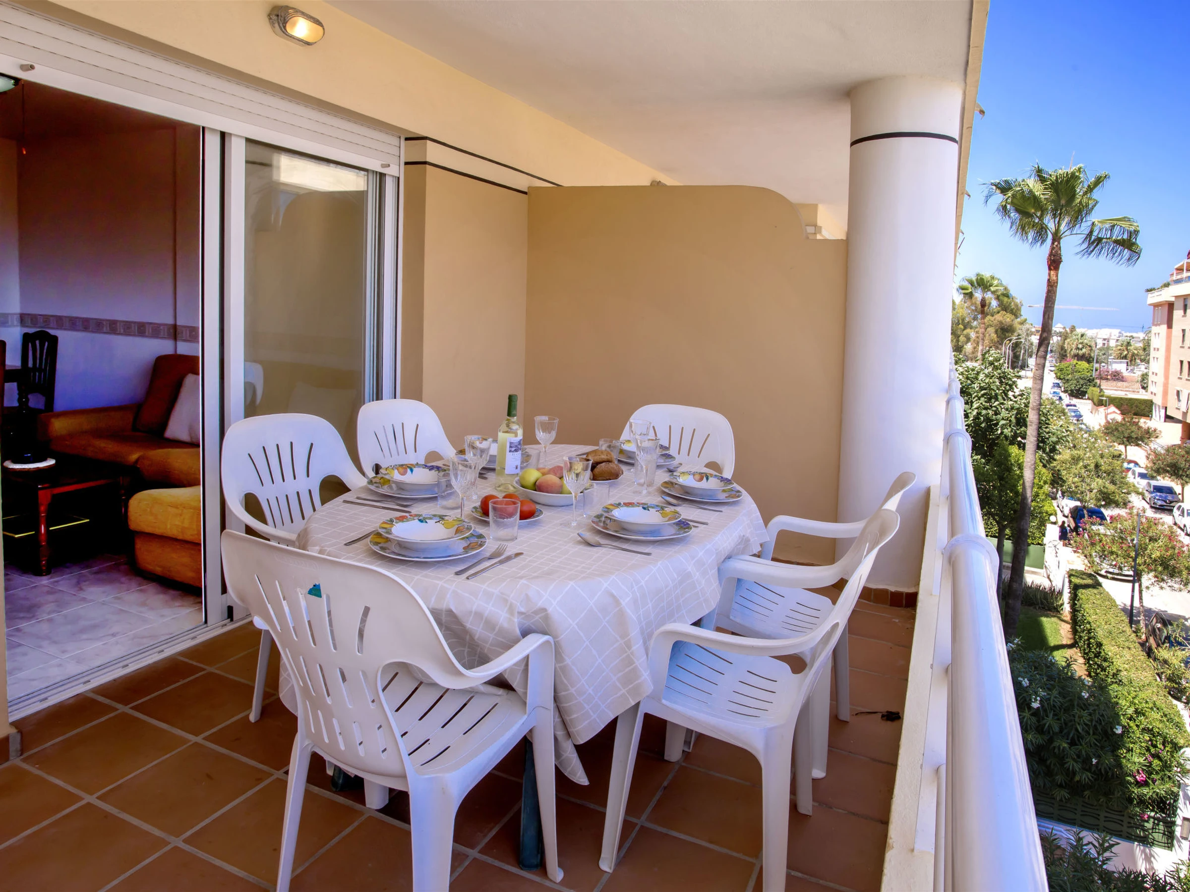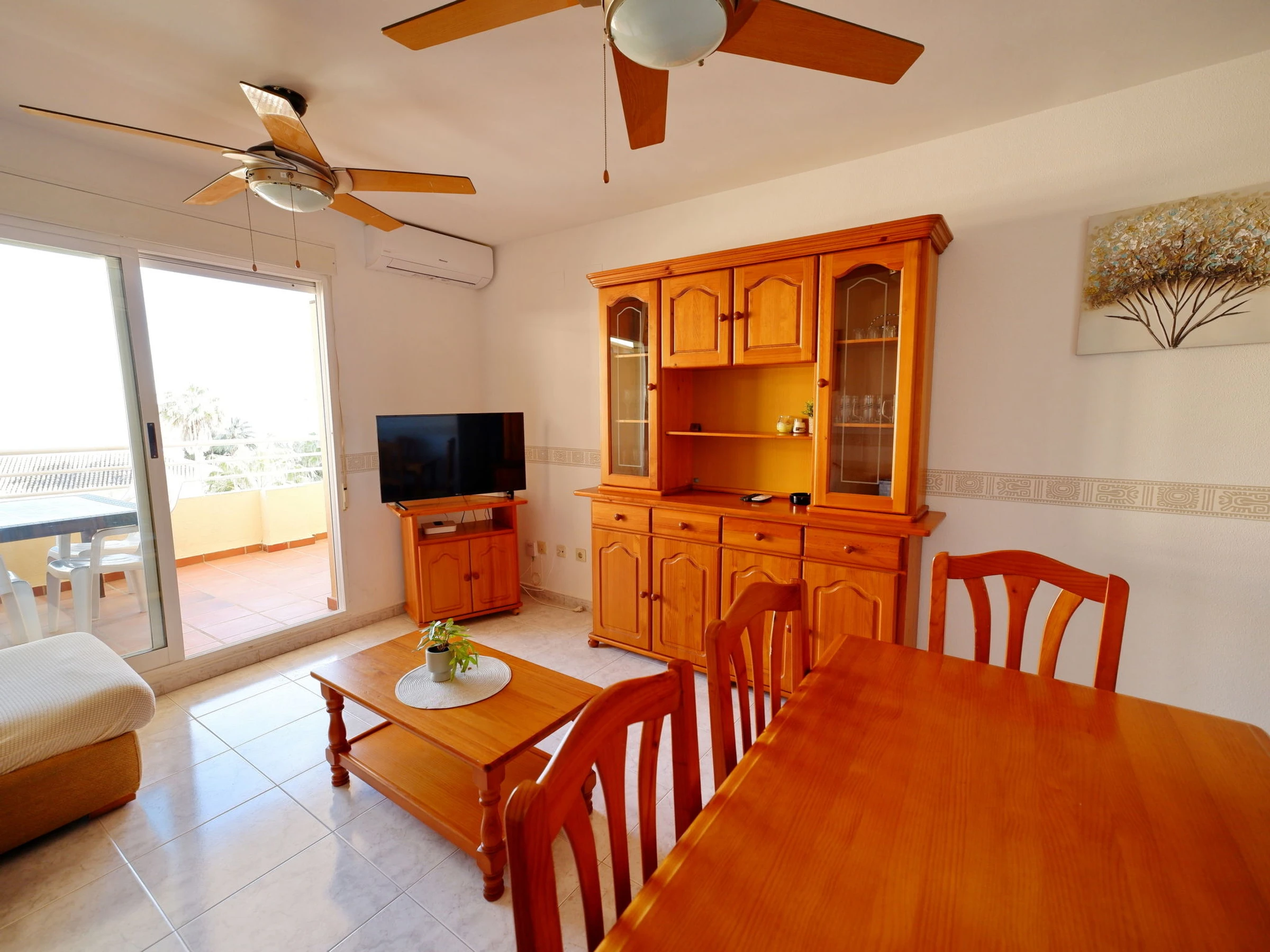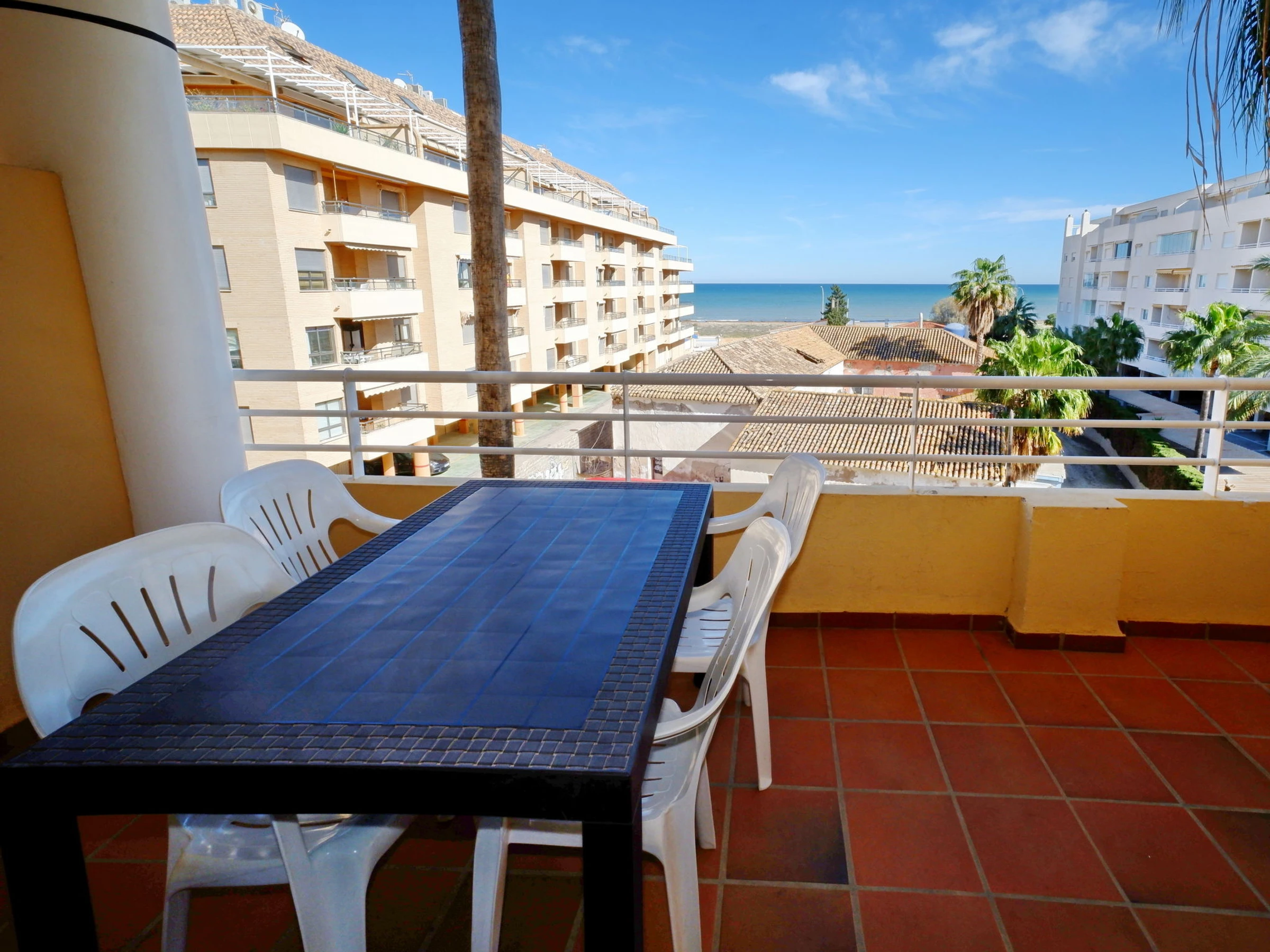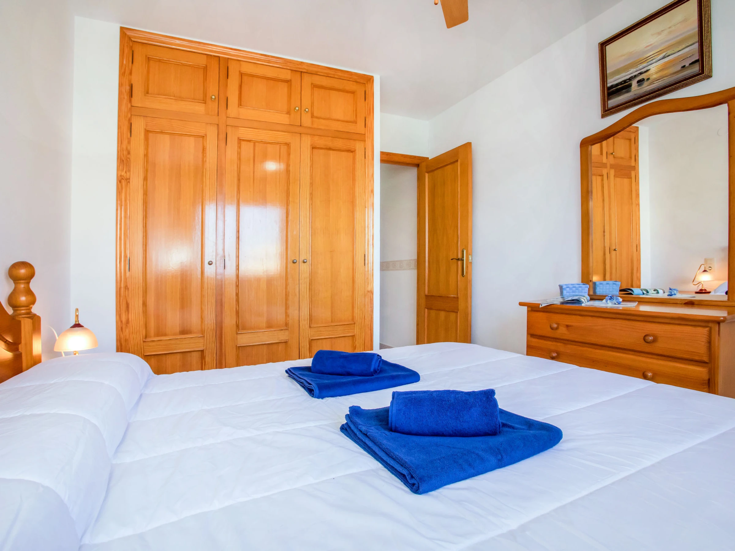 "Dainium", 3-room apartment 70 m2. Spacious, comfortable and cosy furnishings: living/dining room with digital TV, air conditioning, fan and forced-air heating. Exit to the terrace. 1 room with 1 french bed (150 cm, length 200 cm), digital TV, air conditioning, fan and forced-air heating. 1 room with 1 bed (90 cm, length 190 cm), 1 french bed (135 cm, length 190 cm), fan. Kitchen (oven, 4 ceramic glass hob hotplates, toaster, microwave, freezer, electric coffee machine). Bath/bidet/WC, sep. WC. Large terrace. Terrace furniture. View of the sea. Facilities: washing machine, iron, hair dryer. Internet (WiFi, free). Parking space n 32 (roofed). Please note: TV only ES. [hidden] // Reg. Nr.: ESFCTU00000304500046903400000000000000000[hidden]7