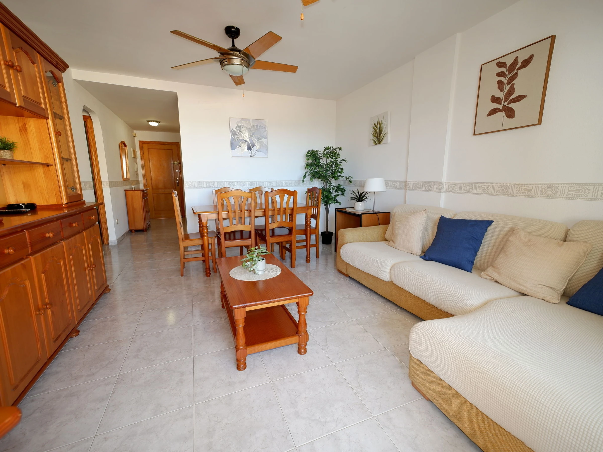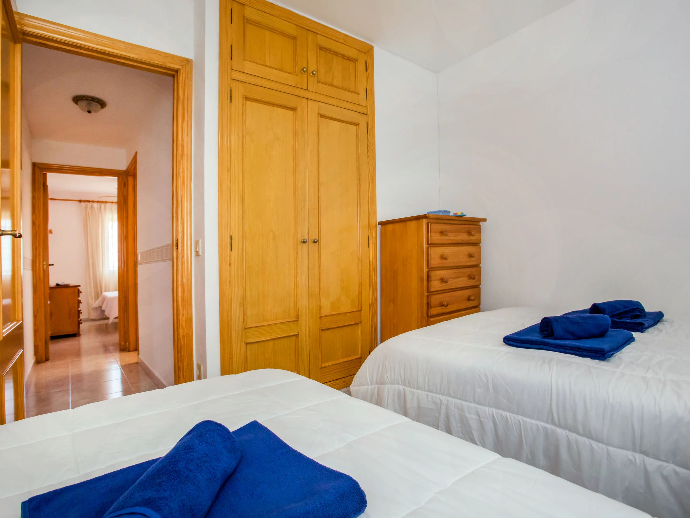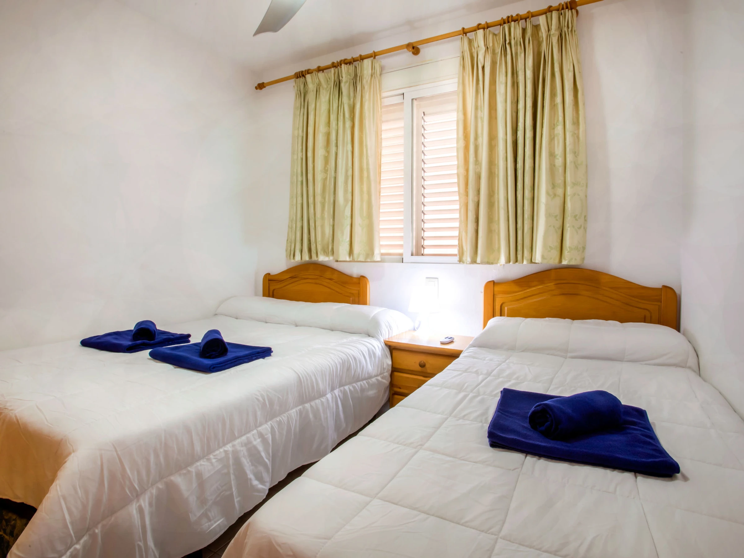 "Dainium", 3-room apartment 70 m2. Spacious, comfortable and cosy furnishings: living/dining room with digital TV, air conditioning, fan and forced-air heating. Exit to the terrace. 1 room with 1 french bed (150 cm, length 200 cm), digital TV, air conditioning, fan and forced-air heating. 1 room with 1 bed (90 cm, length 190 cm), 1 french bed (135 cm, length 190 cm), fan. Kitchen (oven, 4 ceramic glass hob hotplates, toaster, microwave, freezer, electric coffee machine). Bath/bidet/WC, sep. WC. Large terrace. Terrace furniture. View of the sea. Facilities: washing machine, iron, hair dryer. Internet (WiFi, free). Parking space n 32 (roofed). Please note: TV only ES. [hidden] // Reg. Nr.: ESFCTU00000304500046903400000000000000000[hidden]7
