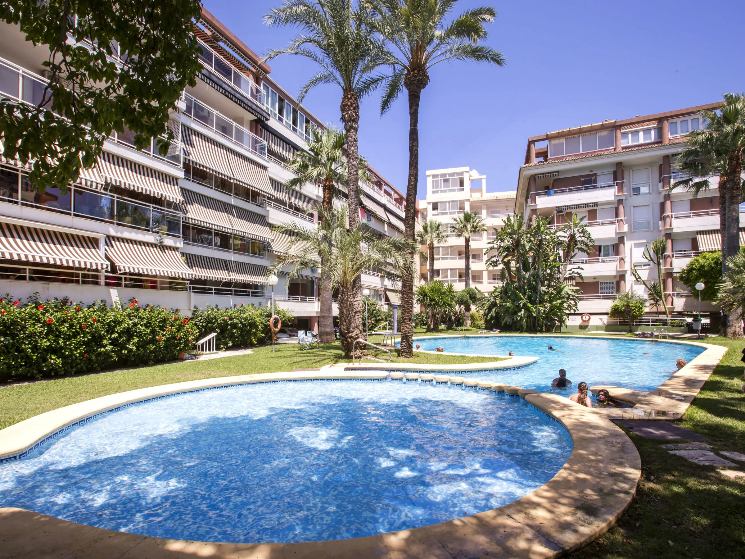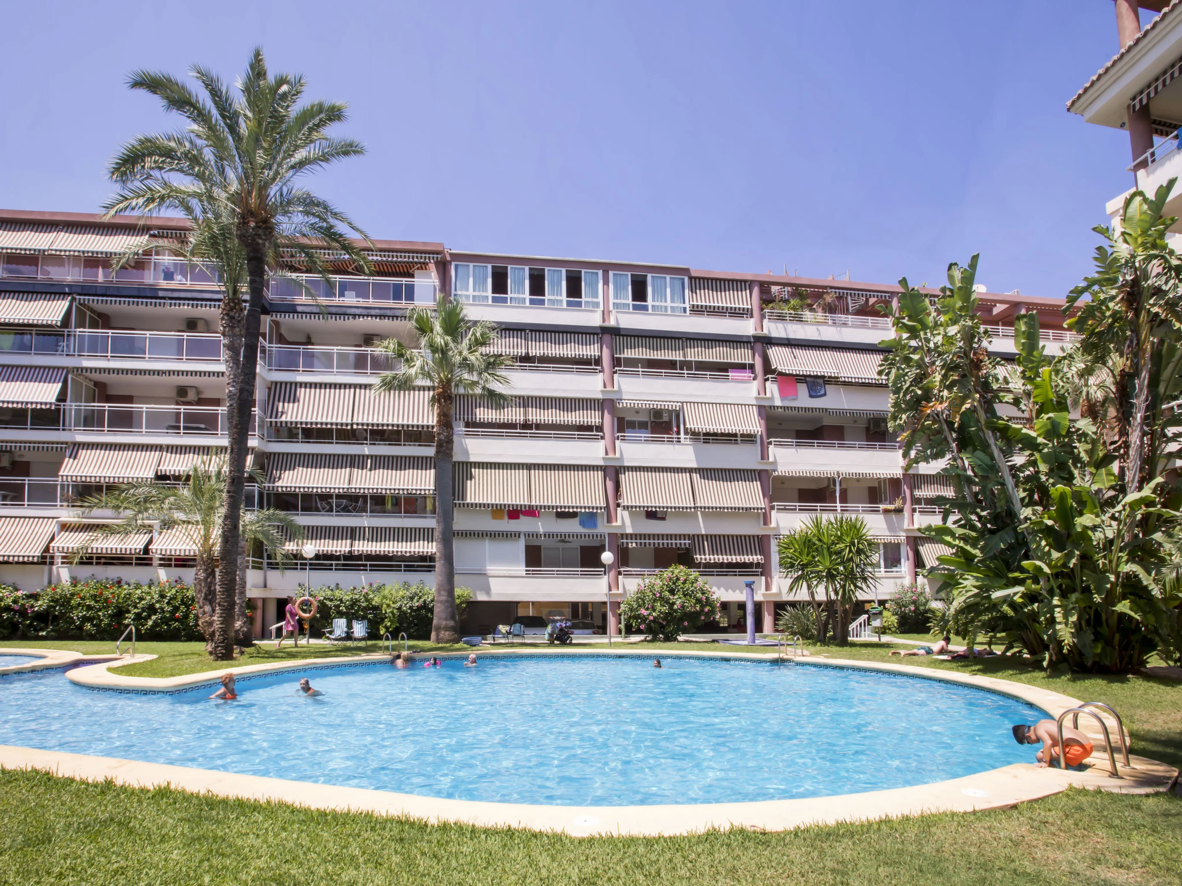 Cosy, comfortable apartment block "Dianium". In the resort 200 m from the centre of Dénia, in a central, quiet position, 200 m from the sea, 200 m from the beach. For shared use: garden with lawn and trees, swimming pool kidney-shaped (20 x 15 m, depth 40 - 210 cm, seasonal availability: [hidden] - [hidden] with internal staircase. Children's pool, outdoor shower. In the house: lift. Shop, grocery 80 m, supermarket 350 m, restaurant, bar, café 100 m, bus stop 300 m, railway station 1.5 km, ferry 800 m, sandy beach "Les Marines" 200 m. Sports harbour, surf school, sailing school 400 m. The owner does not accept any youth groups.