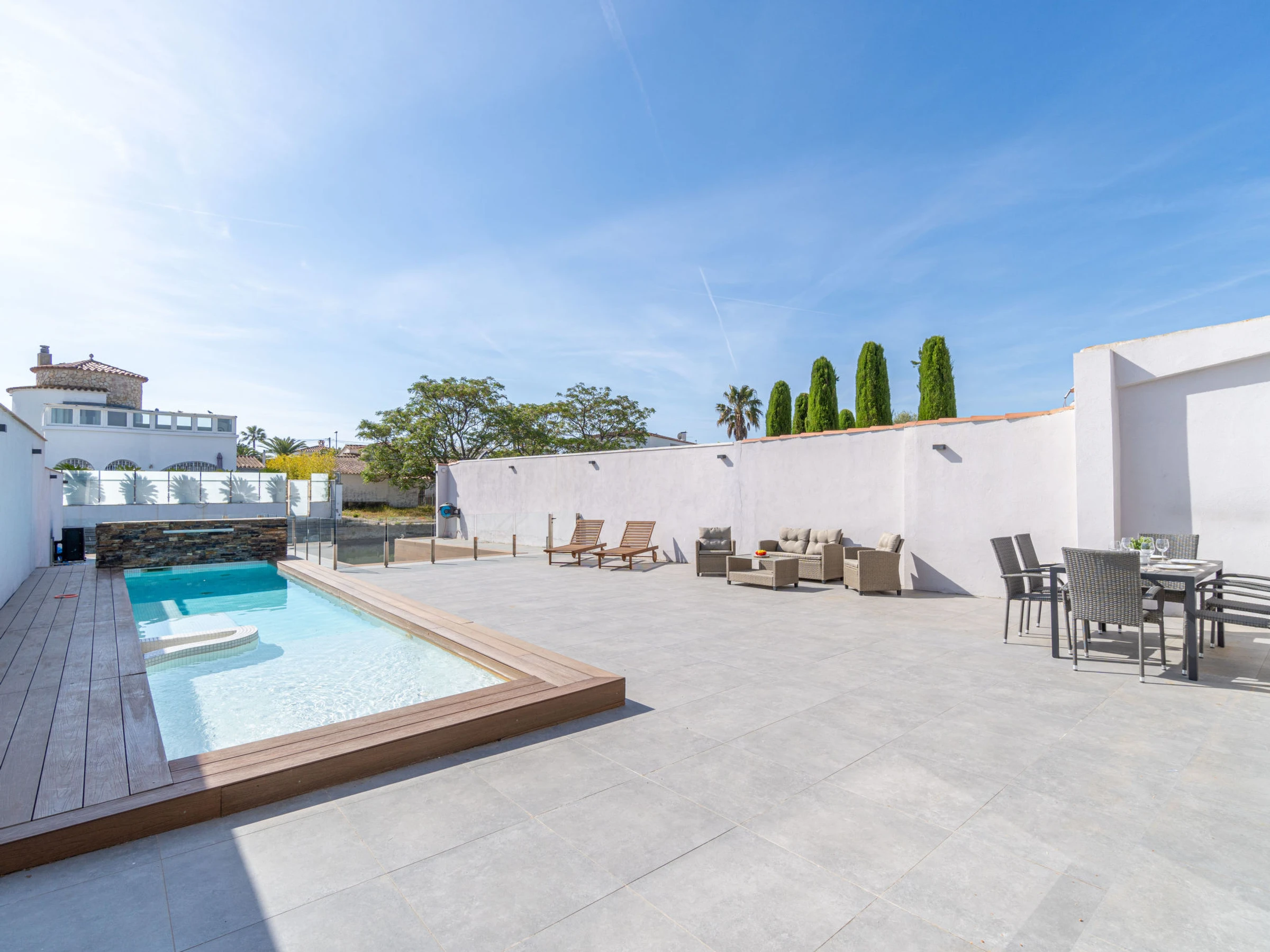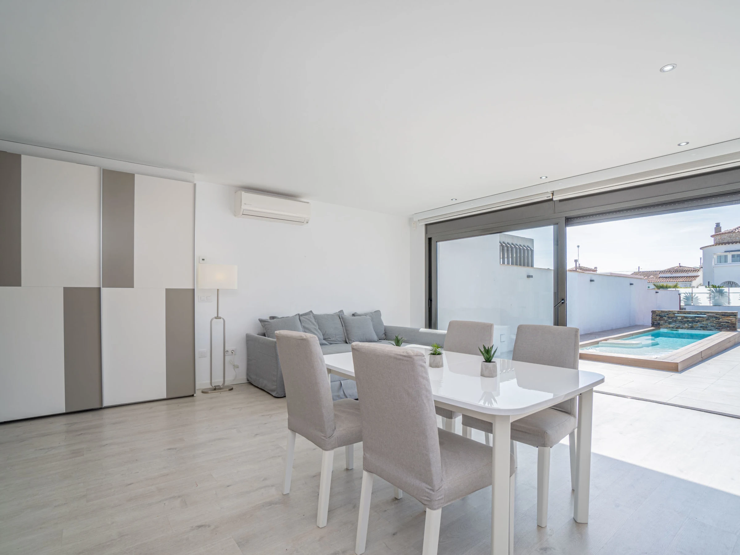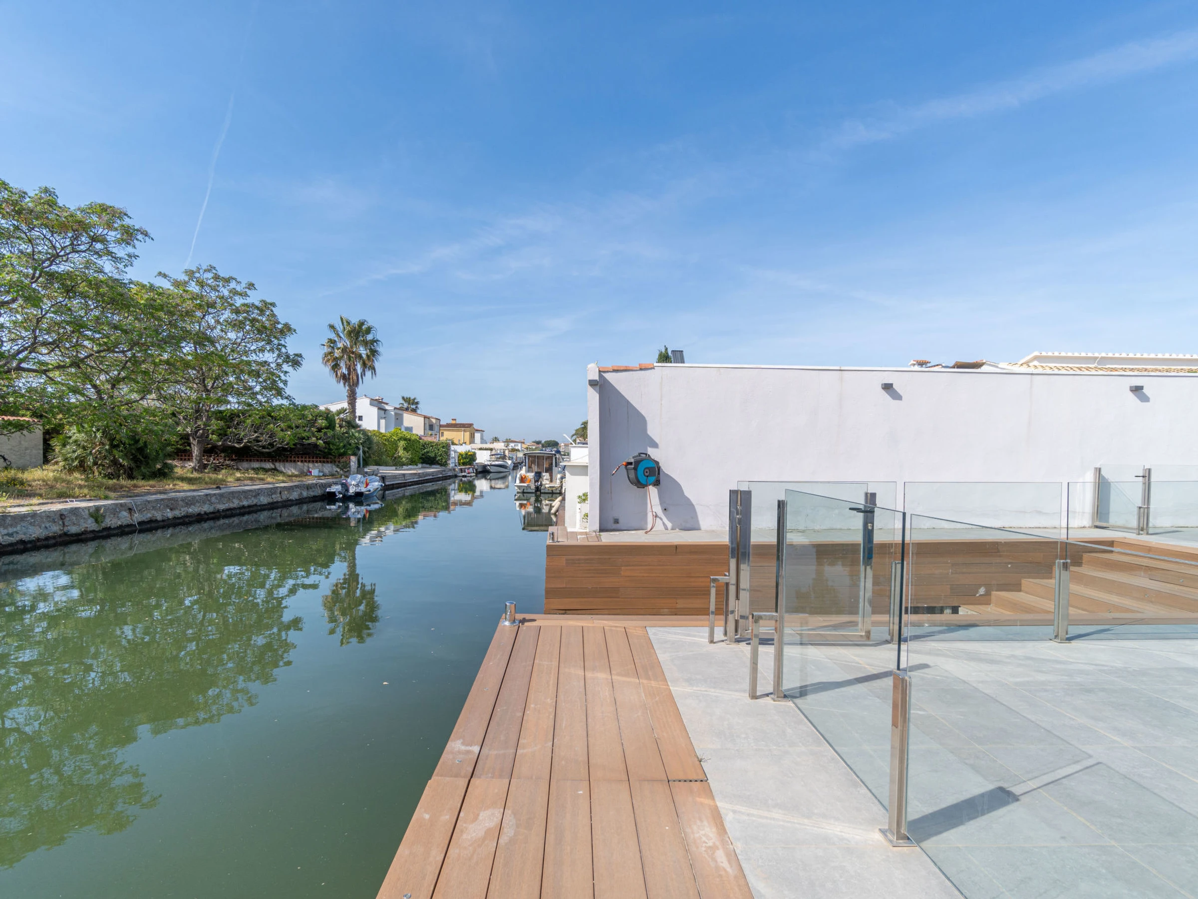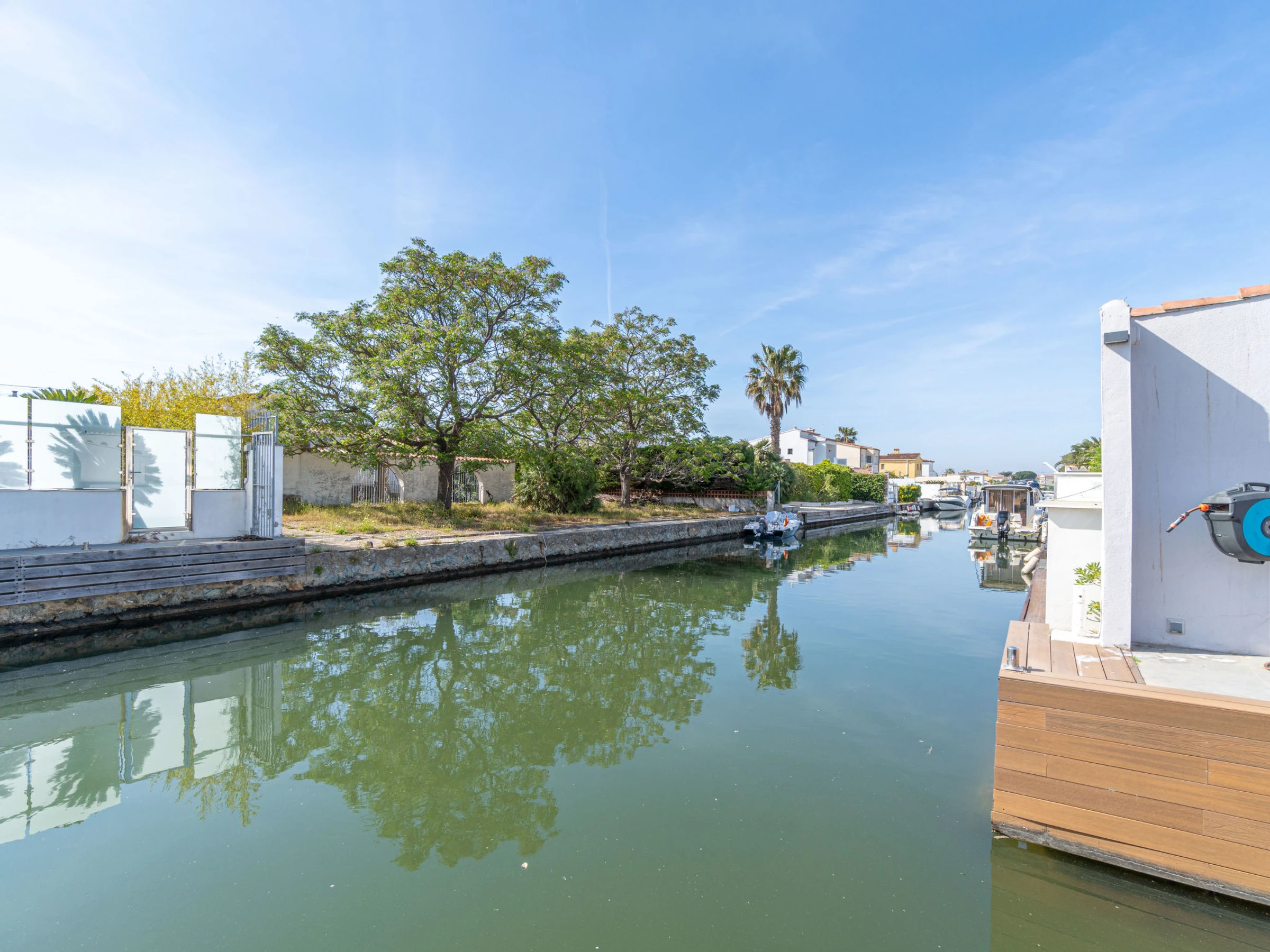 Casa al canal: Modern, comfortable single-family house "Medes". In the district of Medes 1 km from the centre of Empuriabrava, in a quiet, sunny position residential area (villas), traffic calmed area, 900 m from the sea, directly by the canal, in a cul-de-sac. Private: property (fenced), swimming pool (8 x 2 m, depth 50 - 140 cm, seasonal availability: [hidden] - [hidden] with salt-electrolysis pool-cleaning system. Unconventional pool shape. Terrace, garden furniture. In the house: air conditioning. Parking (for 3 cars) on the premises. Supermarket 1 km, restaurant 400 m, internet café 3 km, bus stop "Empuriabrava Cruïlla" 2.8 km, railway station "Figueres Renfe Adif" 15 km, sandy beach "La Rubina / Empuriabrava" 900 m. Sports harbour 2 km, golf course (18 hole) 15 km, surf school 1.5 km, sailing school 1.5 km, tennis 1.5 km, minigolf 900 m, riding stable 800 m, sports centre 1 km, walking paths from the house 100 m, cycle lane 100 m. Nearby attractions: Parque Acuático Roses 5 km, Museo Dalí Figueres 12 km, Ruinas de Empuries 20 km, Castillo y Festival de Perelada 12 km, Centro de Paracaidismo y Túnel de viento 1 km, Cadaqués y Cap de Creus 23 km. Please note: groups of teenagers on request only. Private mooring, on request. The keys‘ handover takes place by the agency in Empuriabrava.