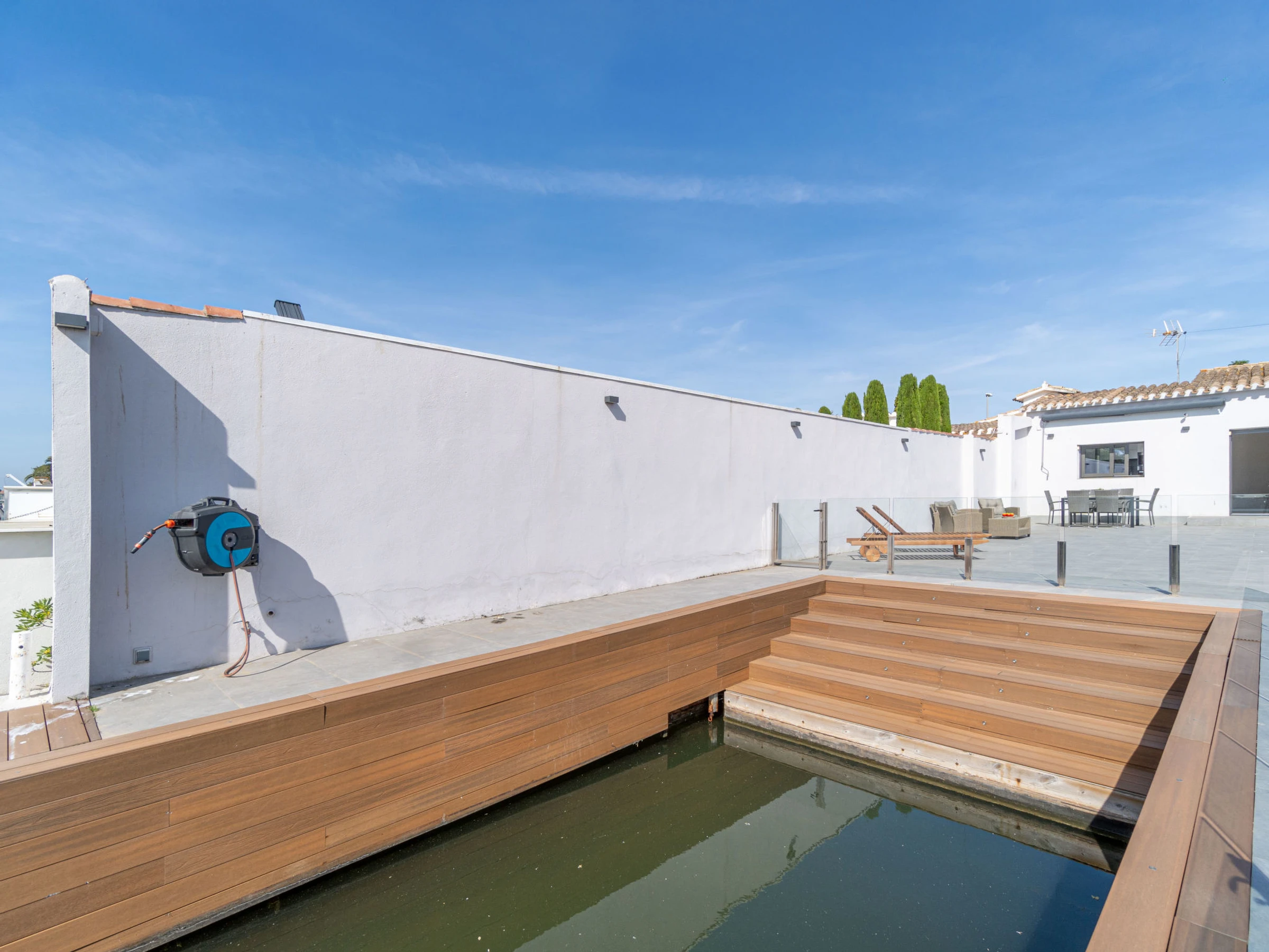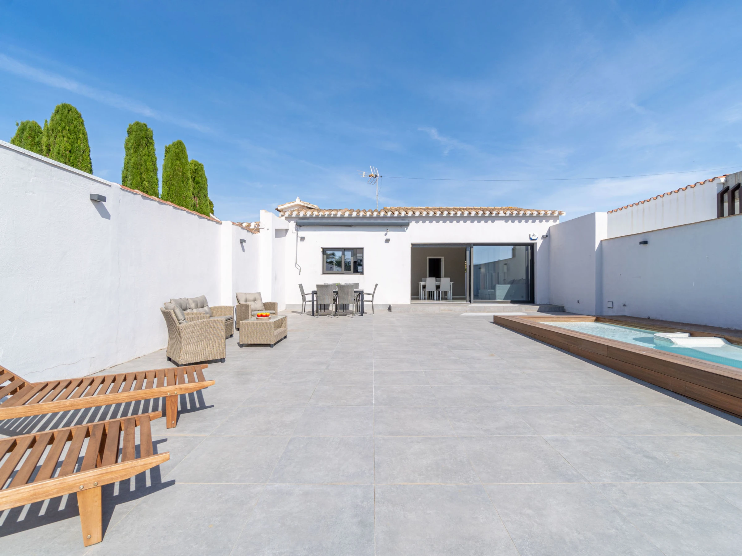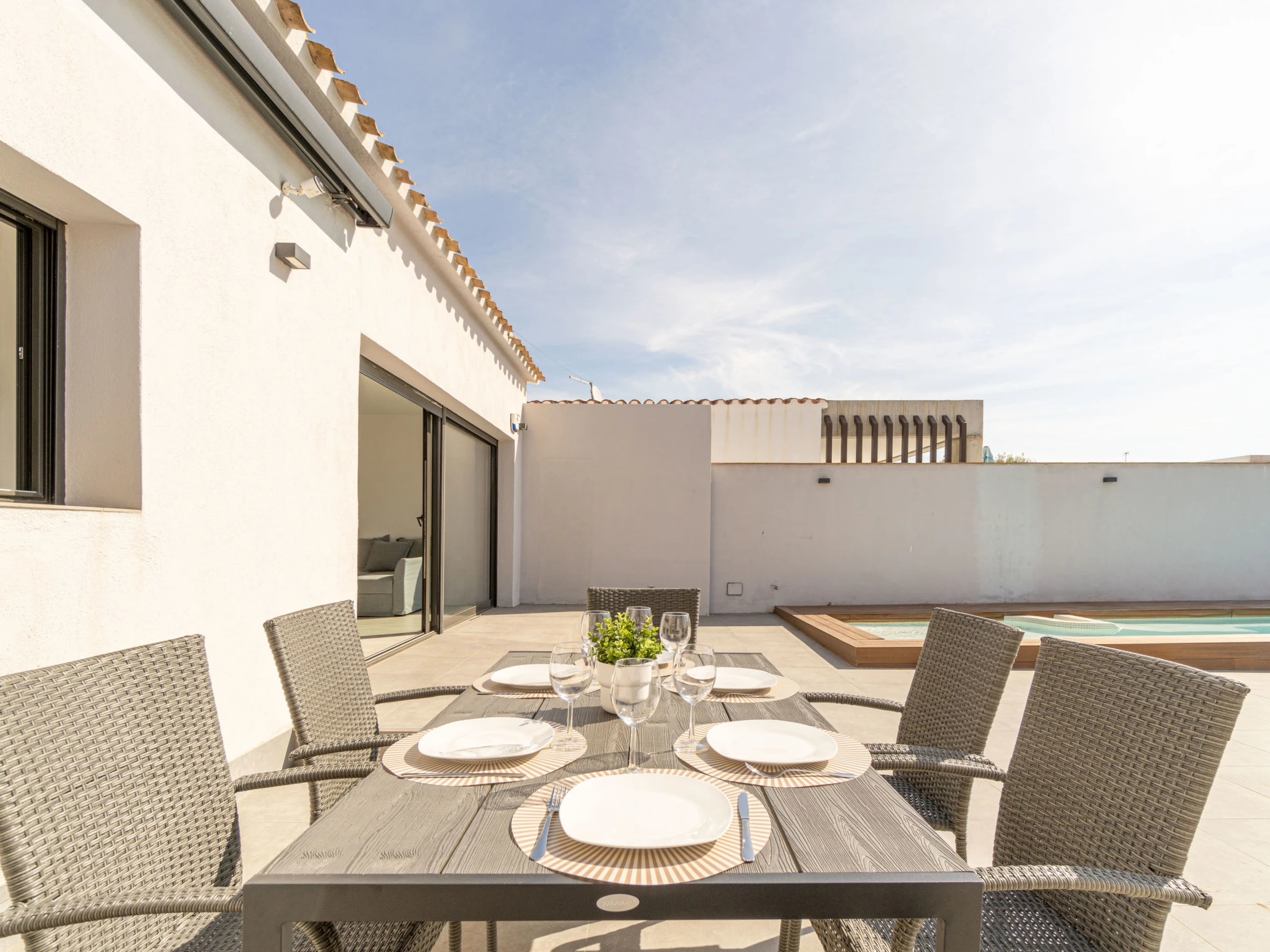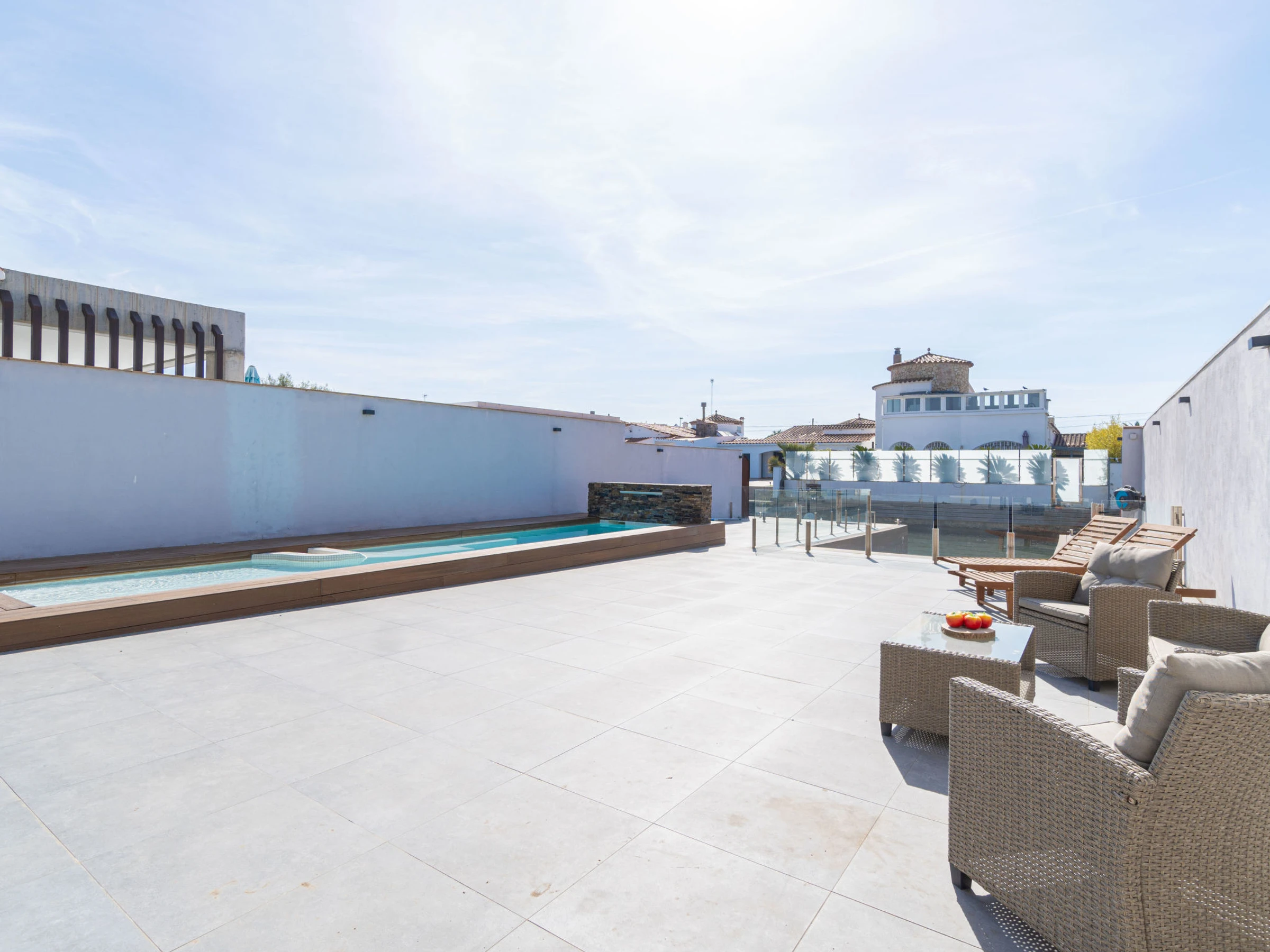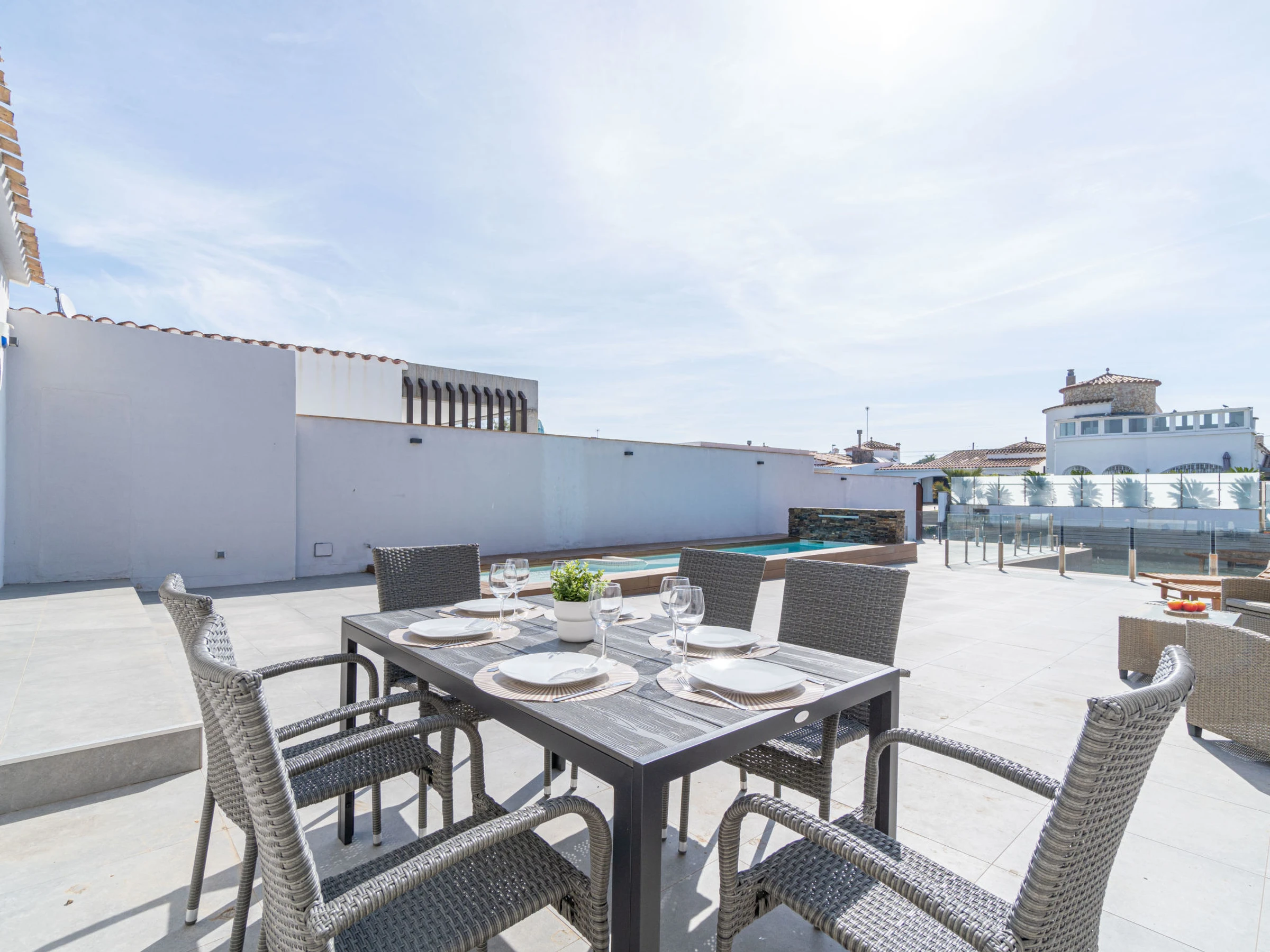 Casa al canal: Modern, comfortable single-family house "Medes". In the district of Medes 1 km from the centre of Empuriabrava, in a quiet, sunny position residential area (villas), traffic calmed area, 900 m from the sea, directly by the canal, in a cul-de-sac. Private: property (fenced), swimming pool (8 x 2 m, depth 50 - 140 cm, seasonal availability: [hidden] - [hidden] with salt-electrolysis pool-cleaning system. Unconventional pool shape. Terrace, garden furniture. In the house: air conditioning. Parking (for 3 cars) on the premises. Supermarket 1 km, restaurant 400 m, internet café 3 km, bus stop "Empuriabrava Cruïlla" 2.8 km, railway station "Figueres Renfe Adif" 15 km, sandy beach "La Rubina / Empuriabrava" 900 m. Sports harbour 2 km, golf course (18 hole) 15 km, surf school 1.5 km, sailing school 1.5 km, tennis 1.5 km, minigolf 900 m, riding stable 800 m, sports centre 1 km, walking paths from the house 100 m, cycle lane 100 m. Nearby attractions: Parque Acuático Roses 5 km, Museo Dalí Figueres 12 km, Ruinas de Empuries 20 km, Castillo y Festival de Perelada 12 km, Centro de Paracaidismo y Túnel de viento 1 km, Cadaqués y Cap de Creus 23 km. Please note: groups of teenagers on request only. Private mooring, on request. The keys‘ handover takes place by the agency in Empuriabrava.