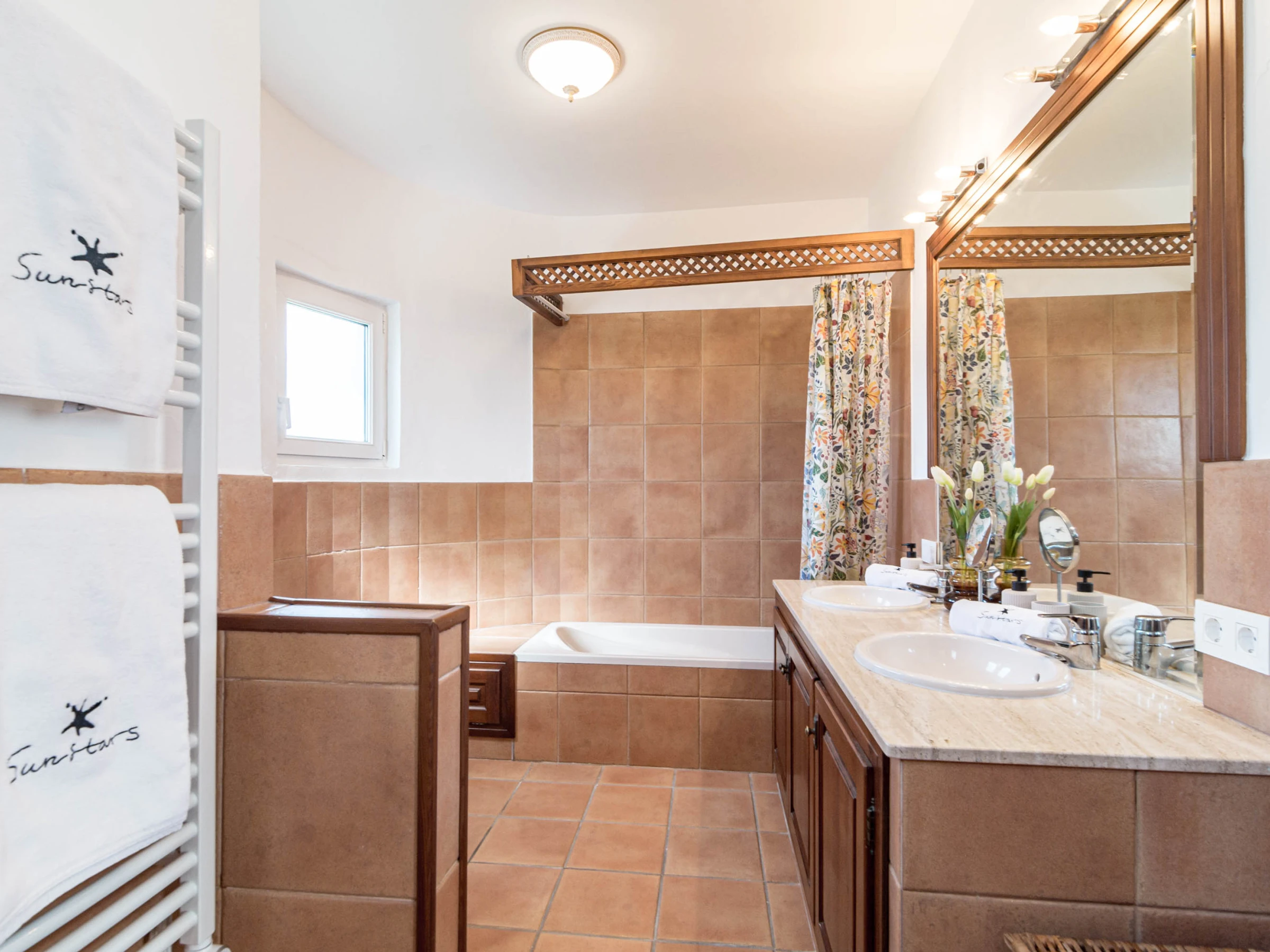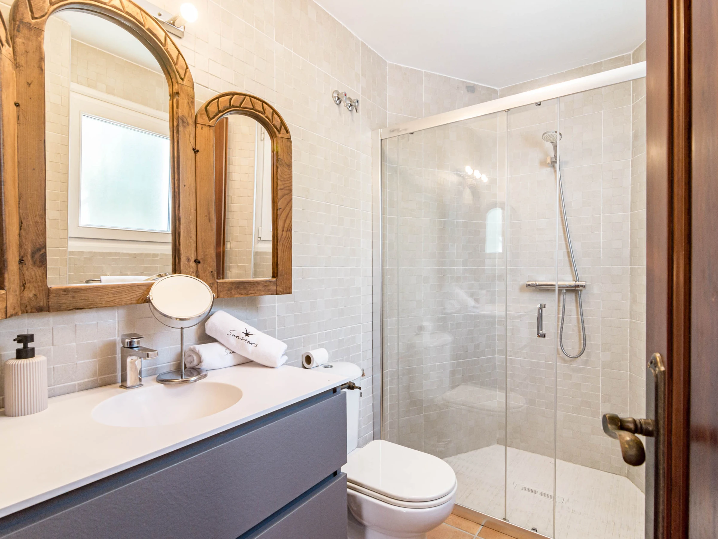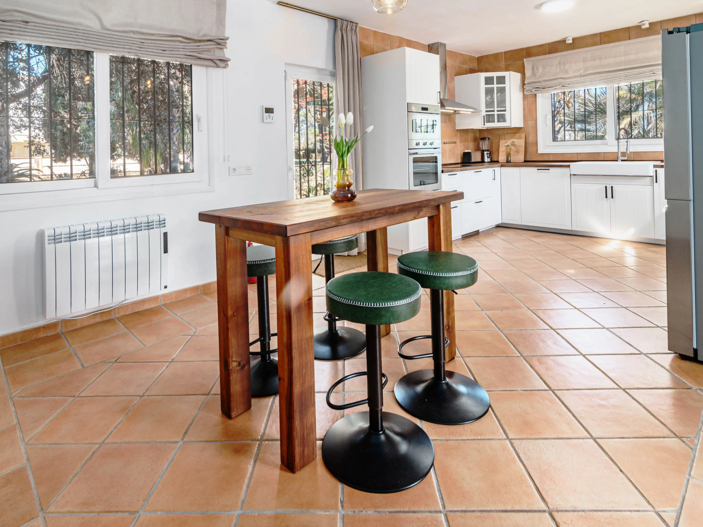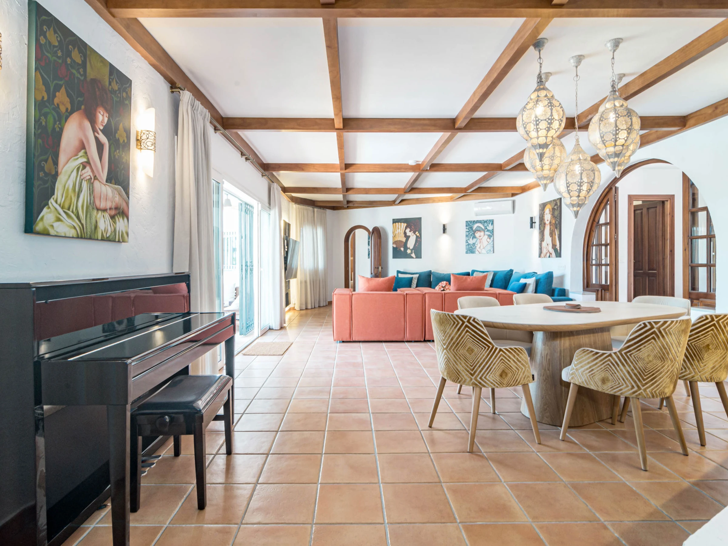 The interior living spaces are warm and inviting, with a large open-plan lounge featuring stylish furnishings, natural light, and direct access to the outdoor terrace, creating a seamless indoor-outdoor flow ideal for relaxing or entertaining. The villa is equipped with modern amenities throughout, ensuring a comfortable stay while maintaining its authentic Mediterranean character. The kitchen is fully equipped with everything you need for your stay, including a fridge-freezer, oven, stove, microwave, dishwasher, kettle, toaster, and a full range of cookware and utensils. Whether you’re preparing a light breakfast or a full meal, you’ll have all the essentials on hand. A washing machine and basic cleaning supplies are also provided for your convenience.
