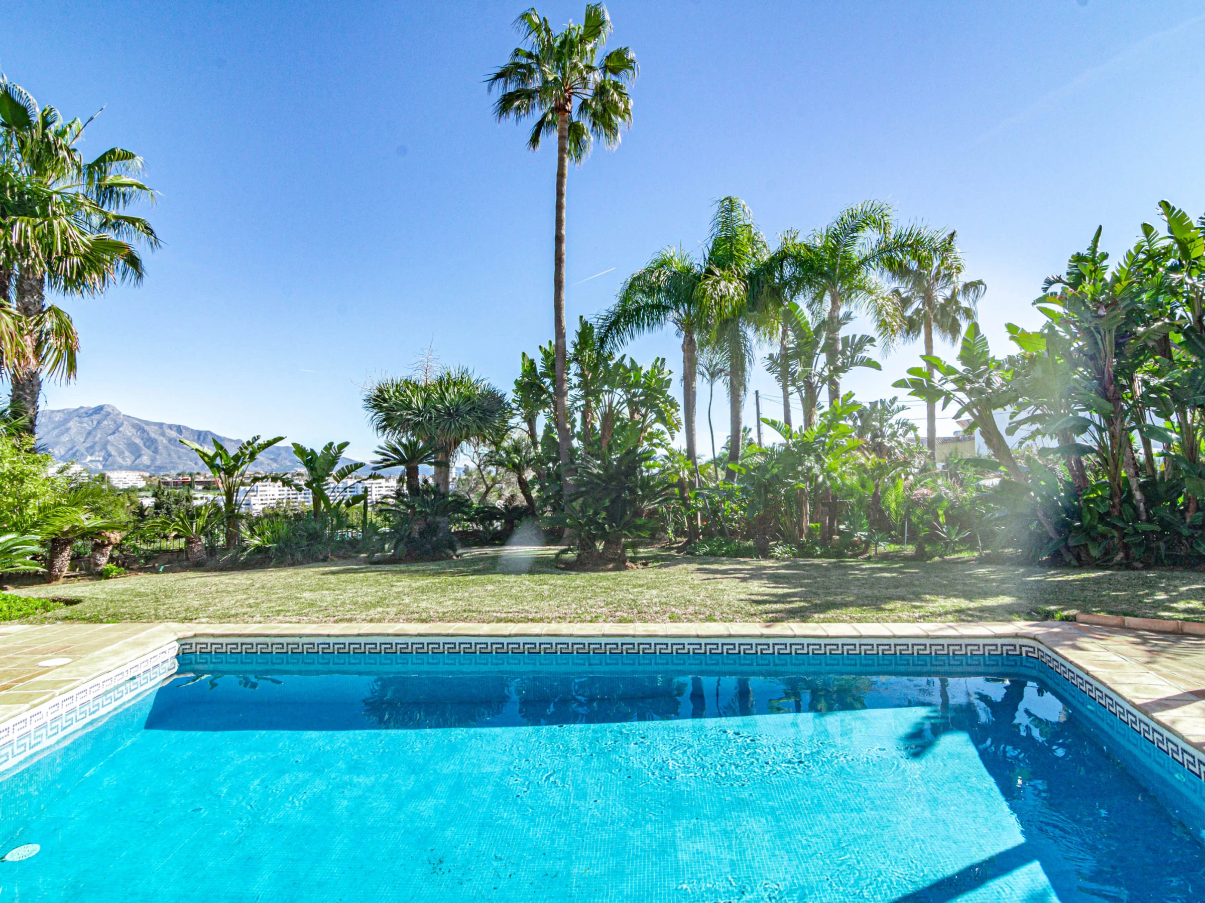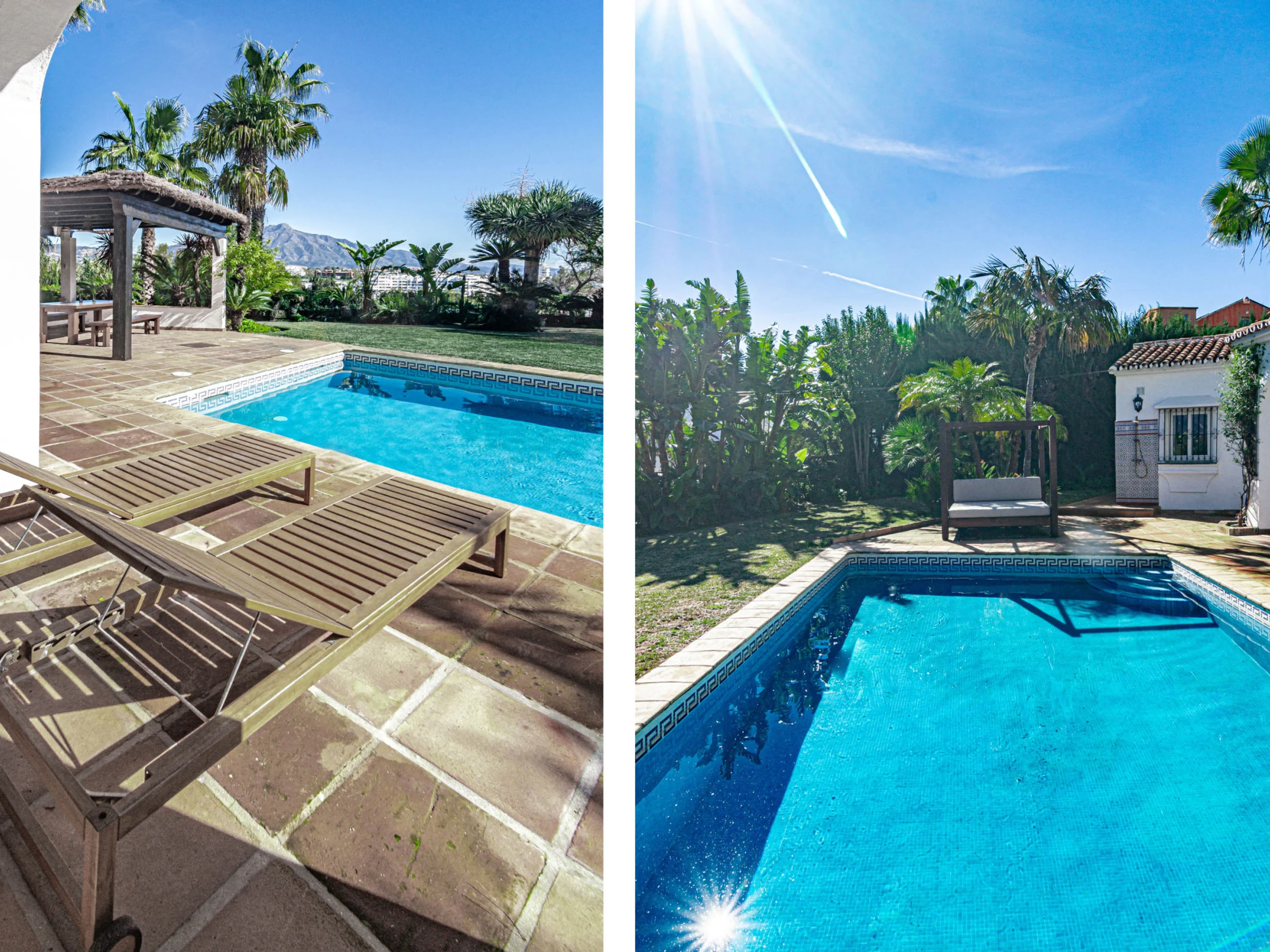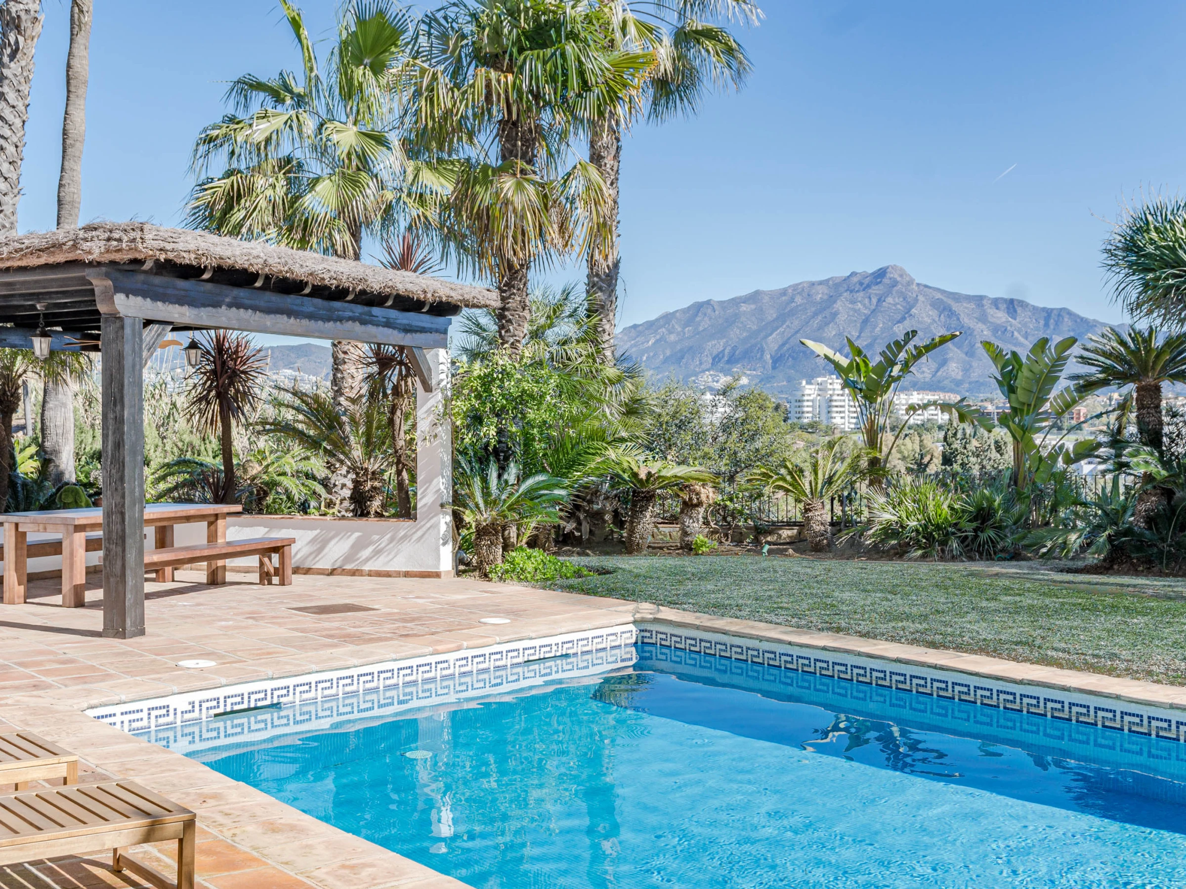 Outside, the property truly shines with a large private swimming pool, expansive sun-drenched terrace, and a huge garden surrounded by lush tropical greenery and palm trees, all set against stunning mountain backdrops. Guests can enjoy multiple outdoor lounging areas, shaded chill-out spaces, and high-quality outdoor furniture, perfect for everything from morning coffee to sunset dinners or long afternoons by the pool. The covered terrace offers additional seating and dining areas, making it ideal for entertaining or unwinding in total privacy. Combining space, style, and location, this villa is perfect for families, groups, or anyone looking to enjoy a luxurious yet relaxed stay in Estepona, with the beach, restaurants, and local attractions just a short distance away, while still enjoying the peace and exclusivity of your own private retreat.