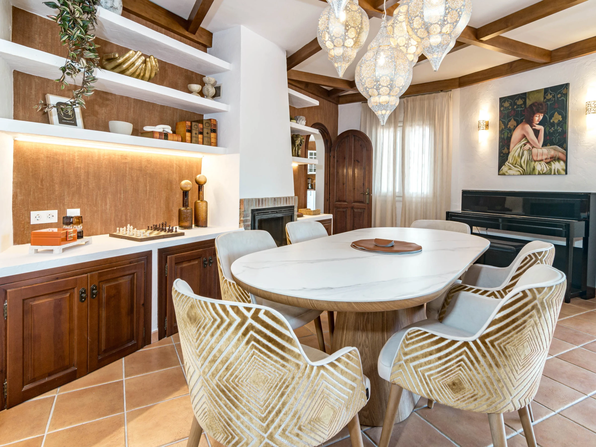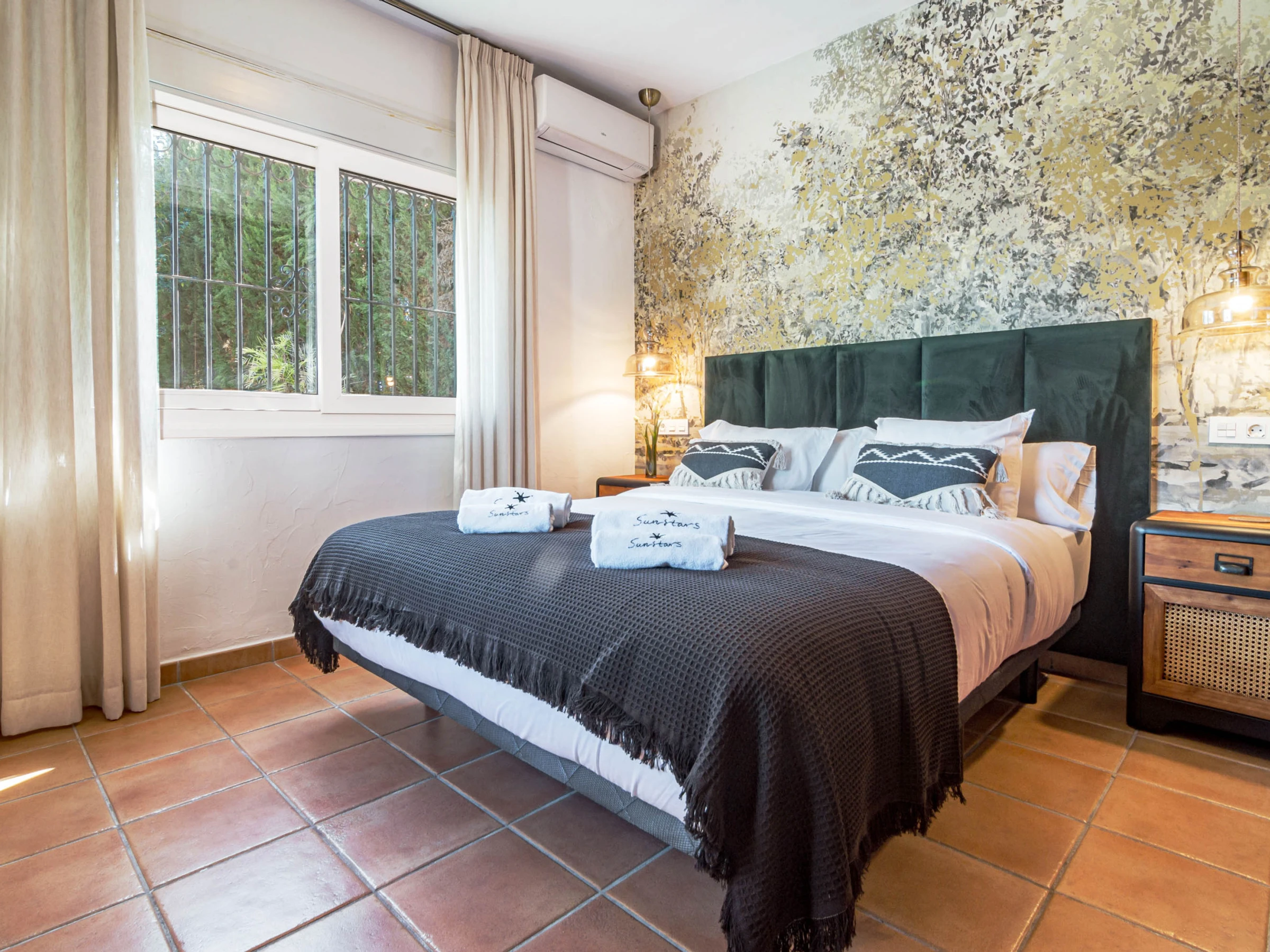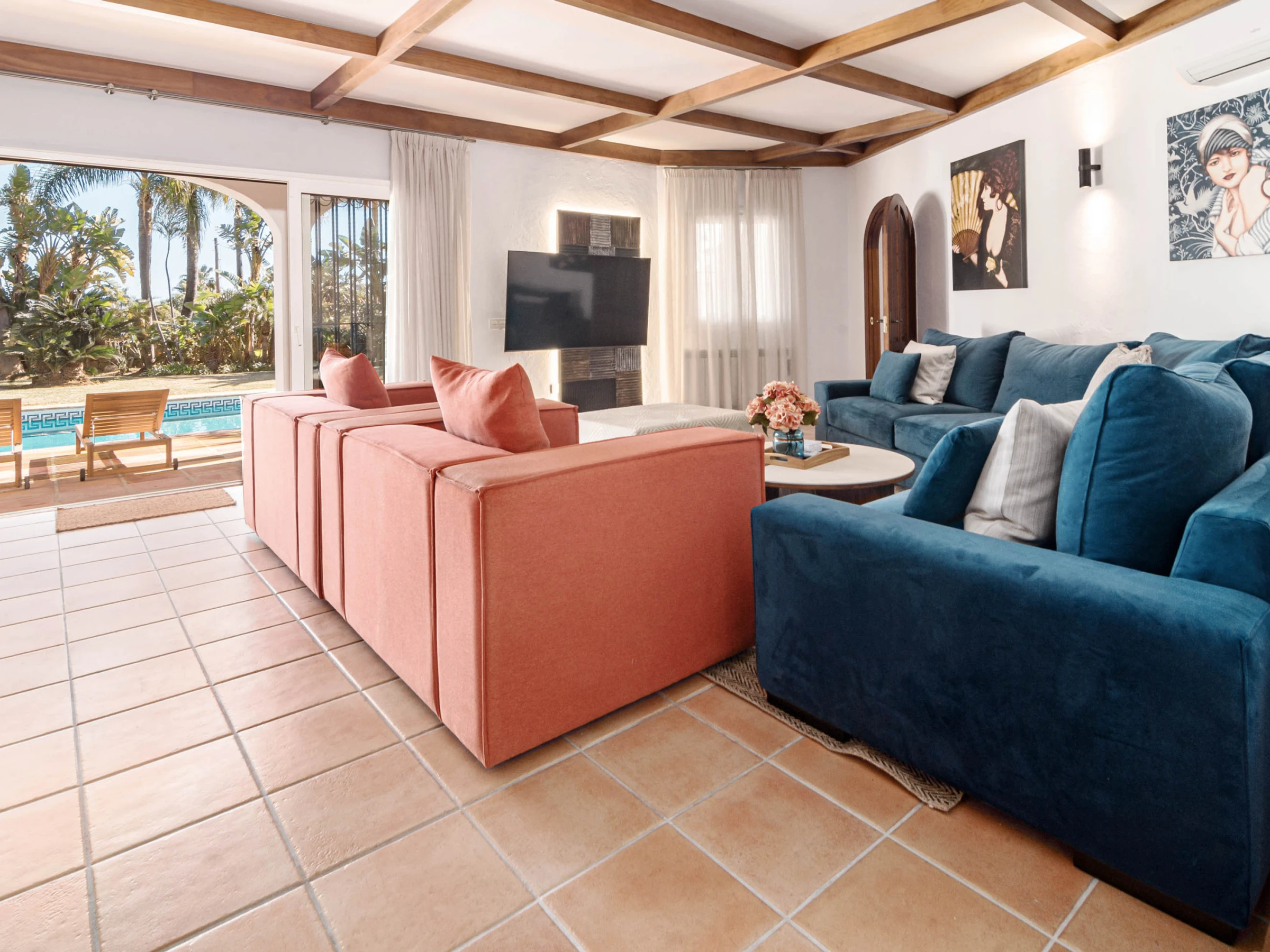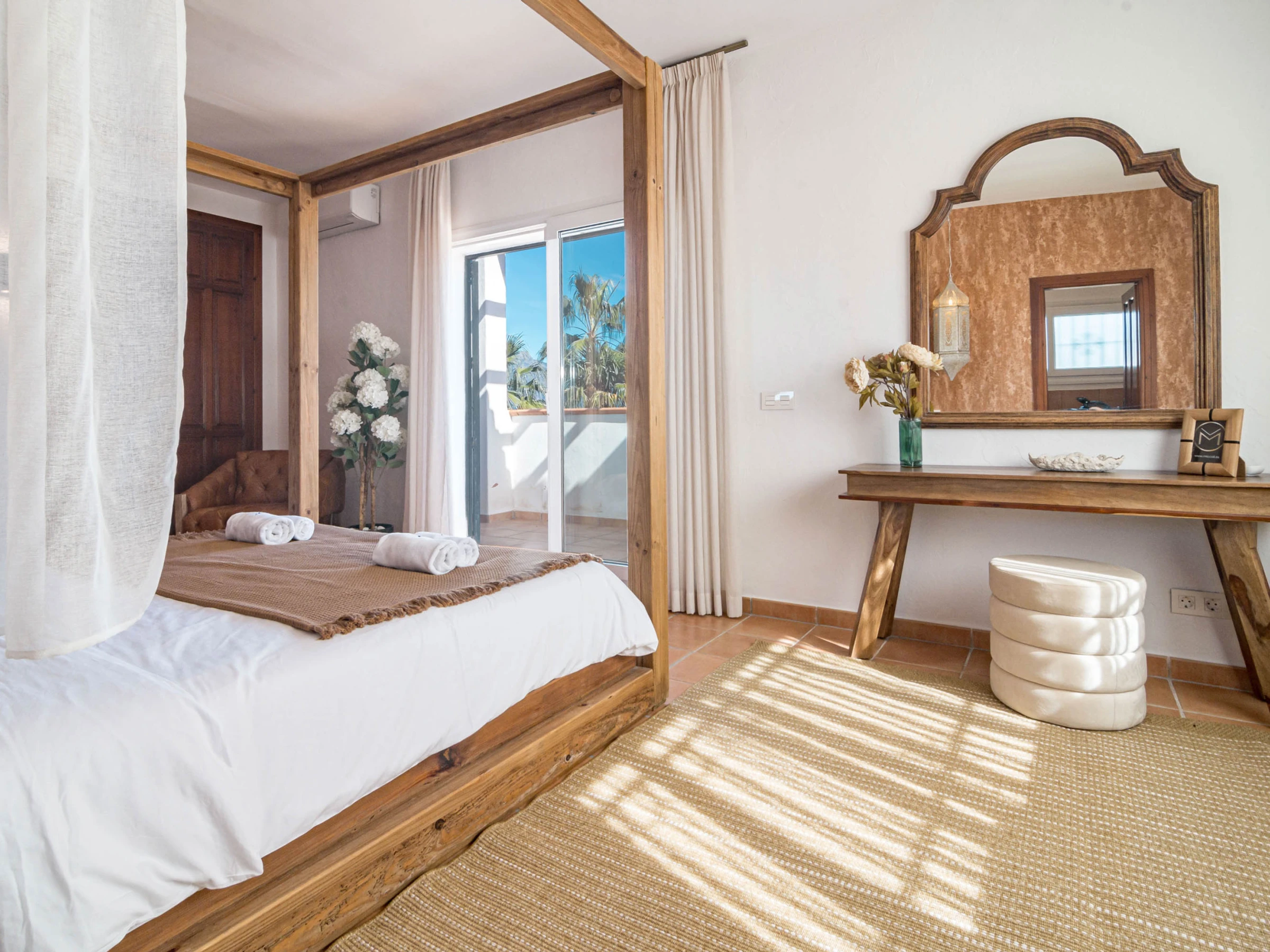 Outside, the property truly shines with a large private swimming pool, expansive sun-drenched terrace, and a huge garden surrounded by lush tropical greenery and palm trees, all set against stunning mountain backdrops. Guests can enjoy multiple outdoor lounging areas, shaded chill-out spaces, and high-quality outdoor furniture, perfect for everything from morning coffee to sunset dinners or long afternoons by the pool. The covered terrace offers additional seating and dining areas, making it ideal for entertaining or unwinding in total privacy. Combining space, style, and location, this villa is perfect for families, groups, or anyone looking to enjoy a luxurious yet relaxed stay in Estepona, with the beach, restaurants, and local attractions just a short distance away, while still enjoying the peace and exclusivity of your own private retreat.