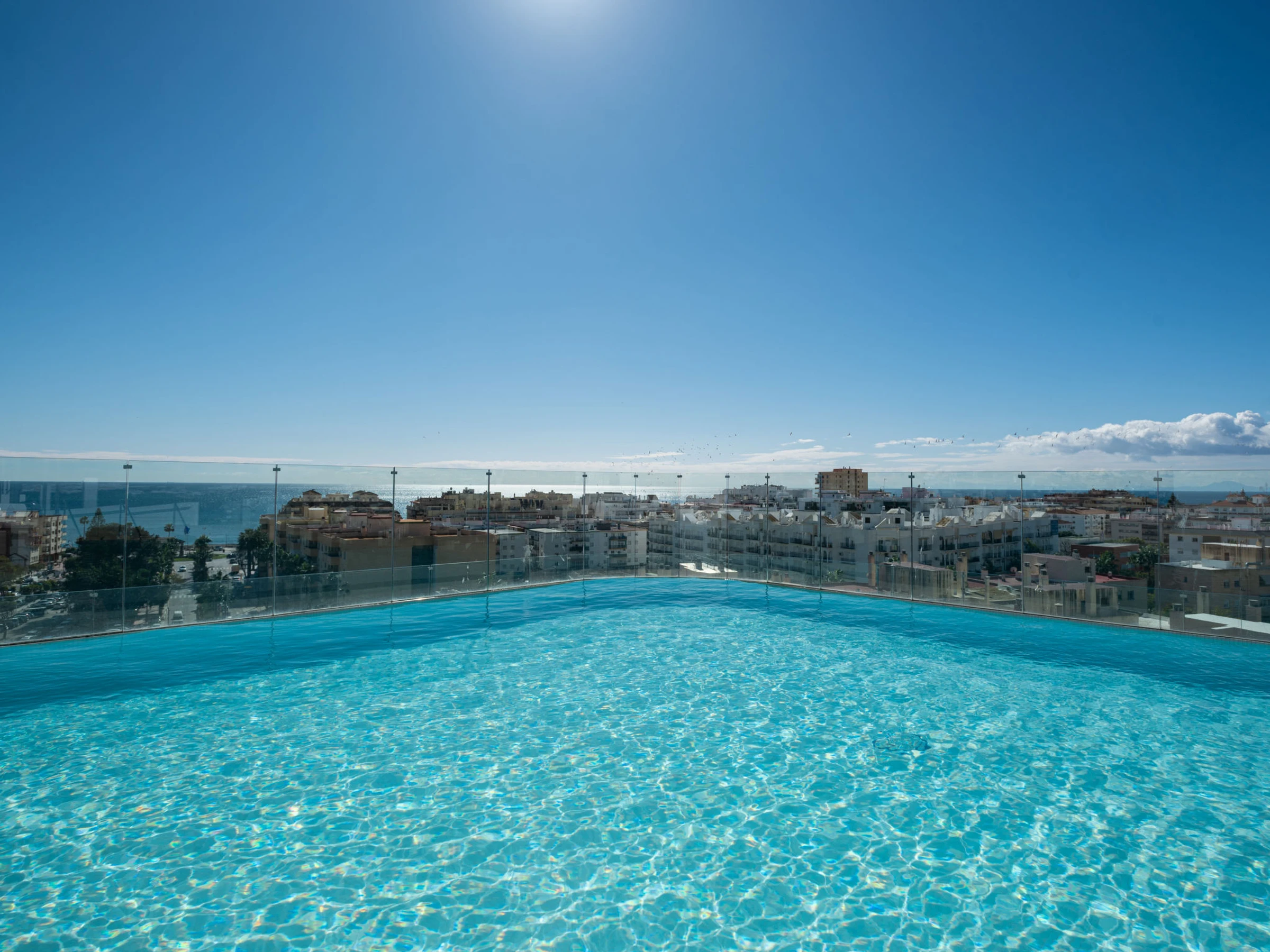 Modern, comfortable apartment block "Estepona Roof Top View 4", built in 2020. In a central, busy, sunny position, in the heart of the city, 300 m from the sea, from the beach, east facing position. For shared use: swimming pool (seasonal availability: [hidden] - [hidden] pool opening hours: 10:00-22:00). Unconventional pool shape. WC in the pool area. In the complex: lounge, sauna, fitness room, in summer, use of sauna is included, in winter, use of sauna is included, lift, storage room for bicycles. Communal covered parking space n 89. Parking space or garage only for small to medium-sized cars. Shop, supermarket 20 m, restaurant 50 m, bar, café 40 m, pedestrian zone, pub garden 50 m, bus stop 100 m, sandy beach 300 m. Sports harbour 1.5 km, sports centre 1.5 km. Nearby attractions: Centro historico de Estepona 100 m. Object suitable for 6 adults. The owner does not accept any groups. The owner does not accept any youth groups. Neighbourhood highly sensitive to noise. Quietness and good behaviour expected.