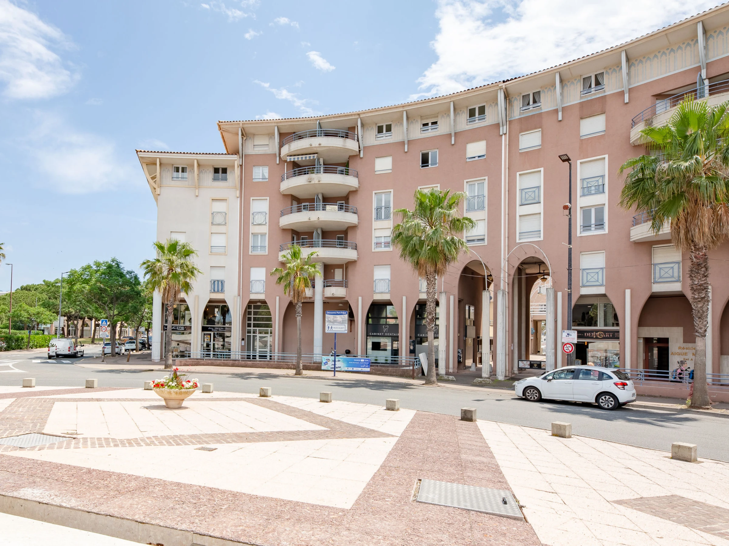 Port Fréjus: Apartment house "Royal Marine", 6 storeys. In the district of Port Fréjus, 650 m from the sea, from the beach. In the complex: lift. Public parking 150 m. Shop 150 m, supermarket 200 m, restaurant, bar 100 m, bus stop 300 m, railway station "Saint Raphael Valescure" 3 km, sandy beach "Fréjus", diving center 150 m, indoor swimming pool 800 m. Sports harbour 50 m, golf course (18 hole) 6 km, sailing school 1 km. Nearby attractions: Cannes 40 km, Saint-Tropez 40 km, Nice 70 km, Gorges du Verdon 90 km. Well-known lakes can easily be reached: Sainte-Croix 90 km. Hiking paths: Estérel 5 km. Groups of teenagers on request only. The keys‘ handover takes place by the agency in Port Fréjus.
