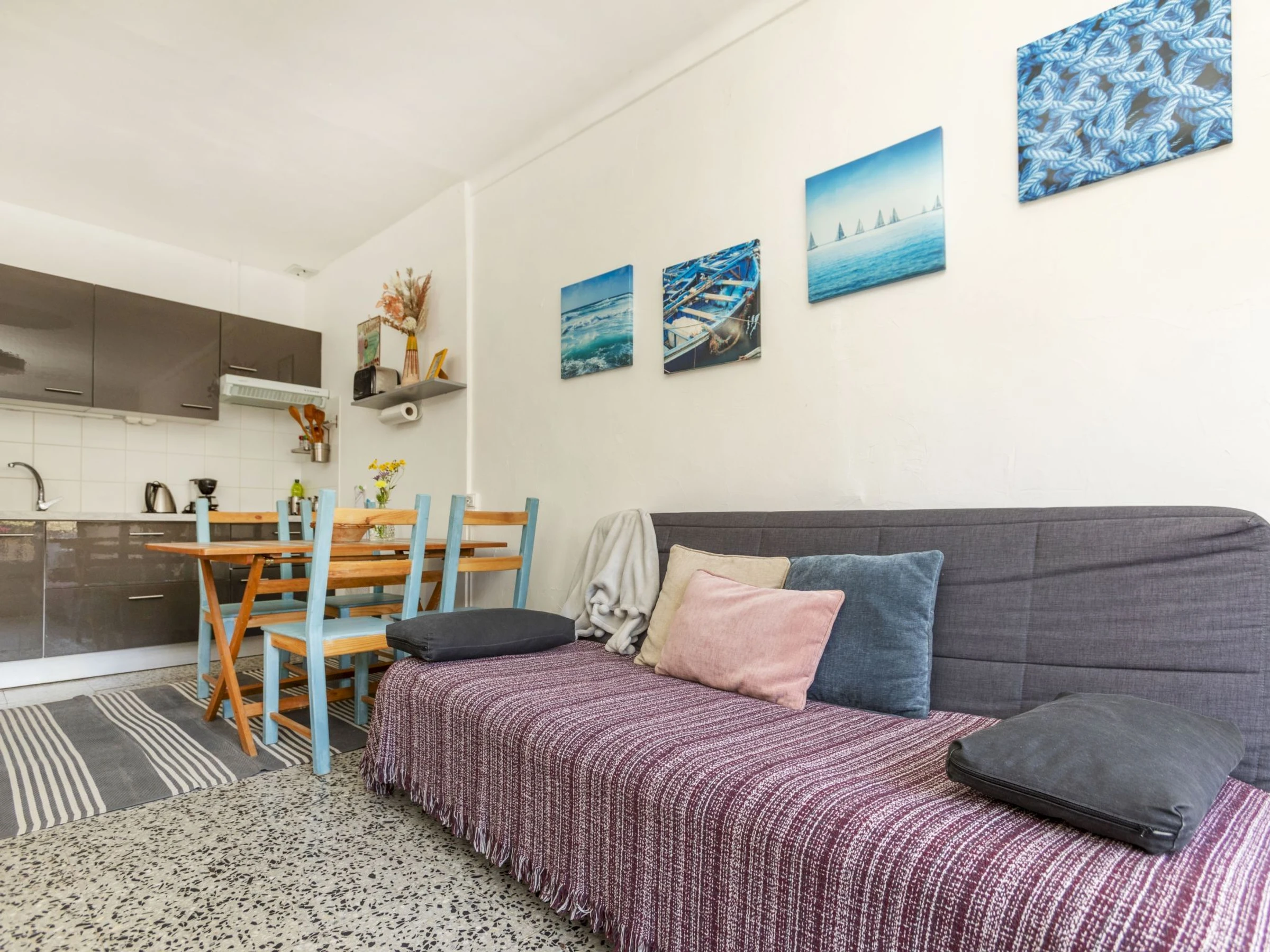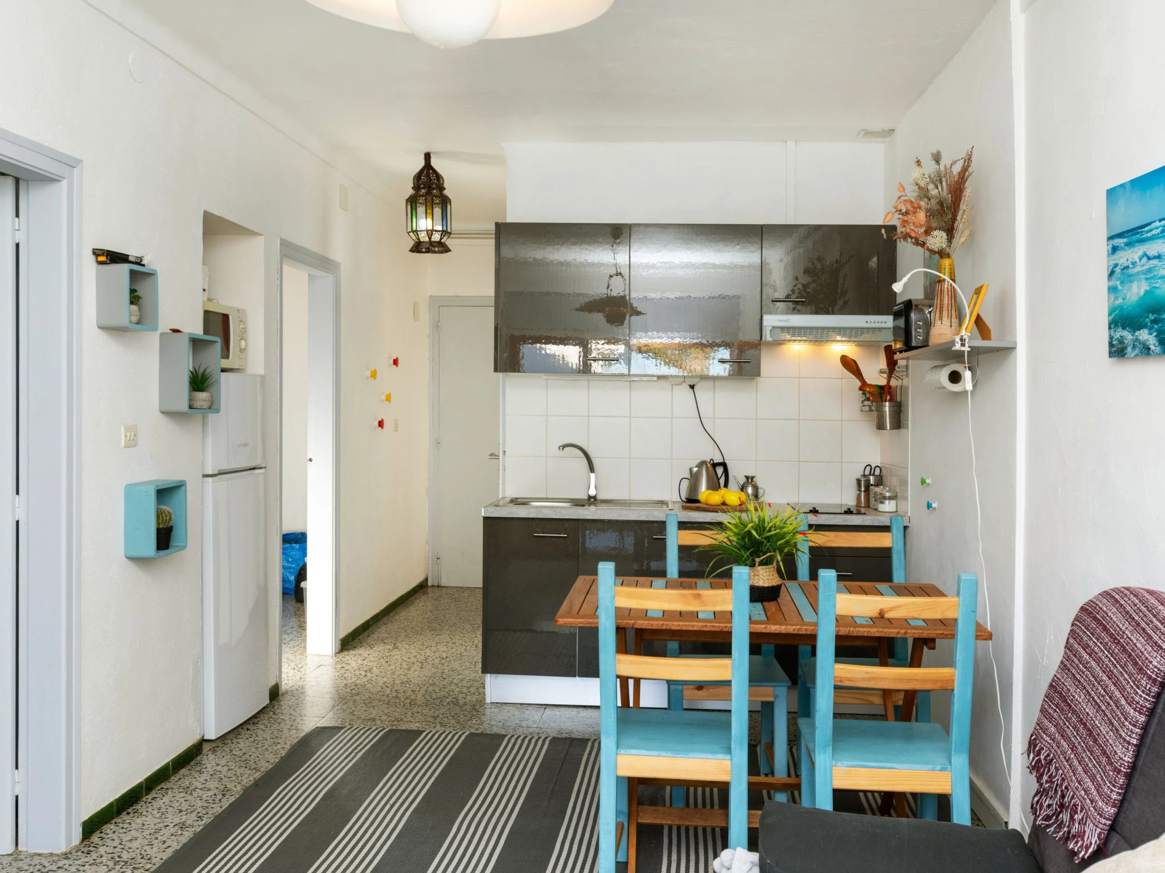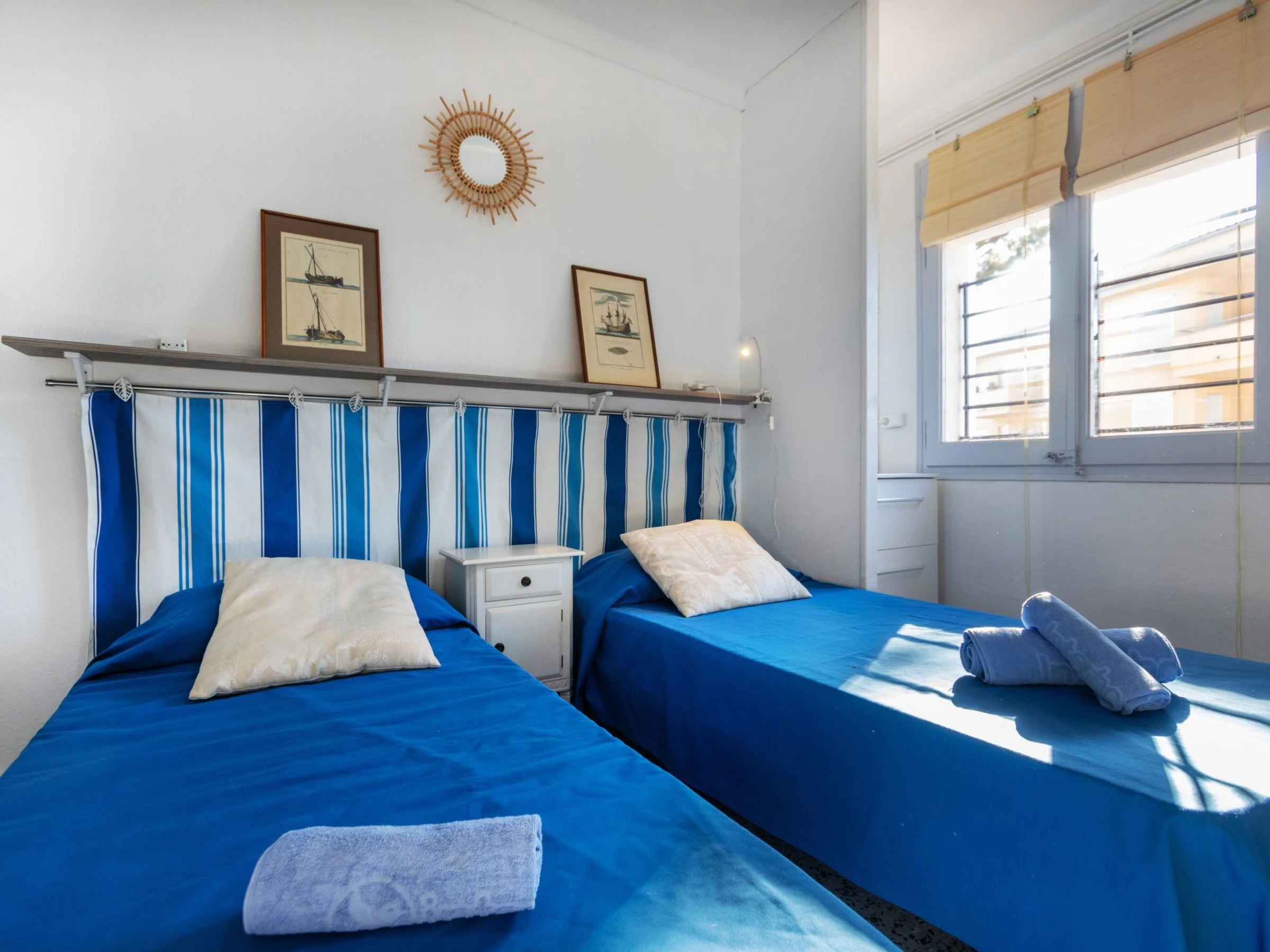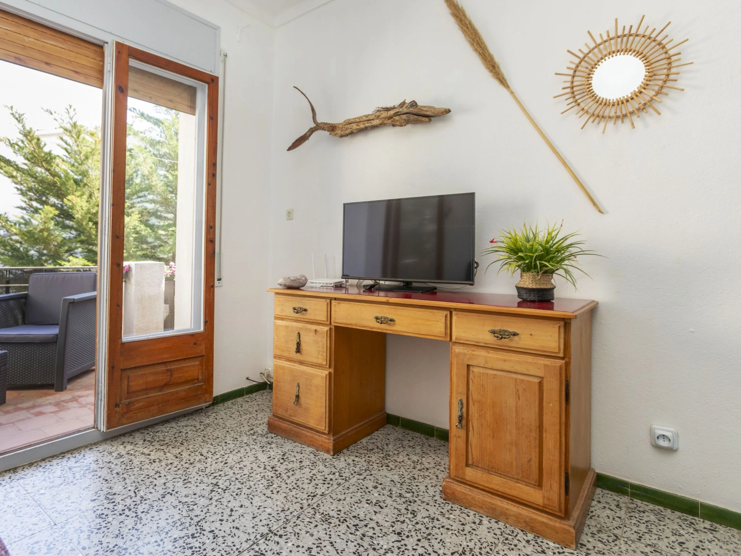 3-room apartment 67 m2 on 1st floor. Partly renovated in 2022, cosy furnishings: living/dining room with digital TV. Exit to the terrace. 1 room with 1 french bed (150 cm, length 190 cm). 1 room with 2 beds (90 cm, length 190 cm). Open kitchen (2 ceramic glass hob hotplates, toaster, kettle, microwave, electric coffee machine). Shower/WC. No heating option. Terrace furniture. Facilities: washing machine, iron, hair dryer. Internet (WiFi, free). *the TV has Chromecast. [hidden]-41 ESFCTU00001701000021642400000000000000[hidden]-418