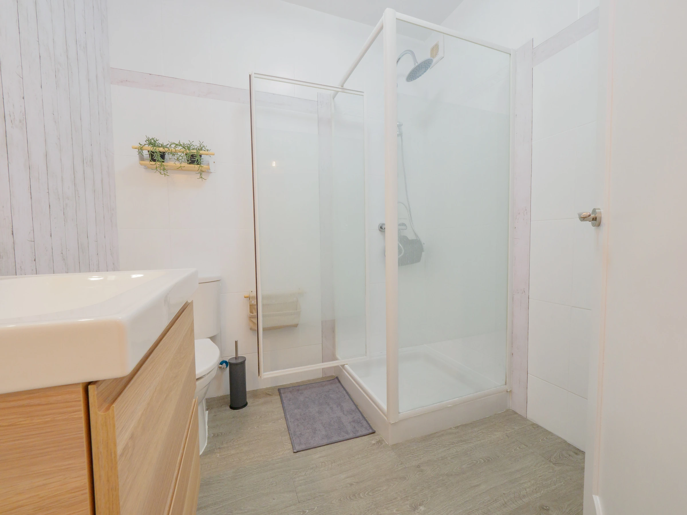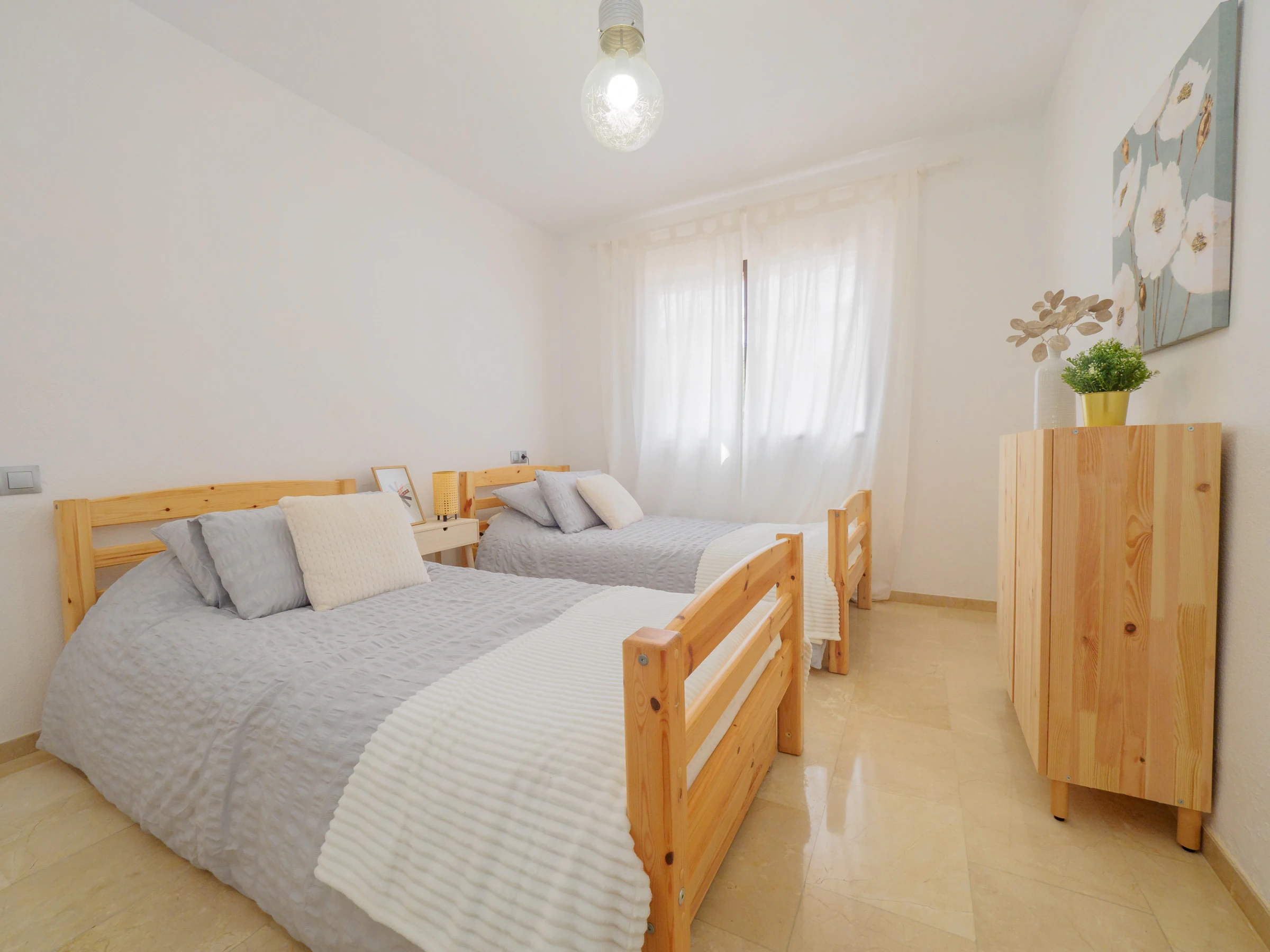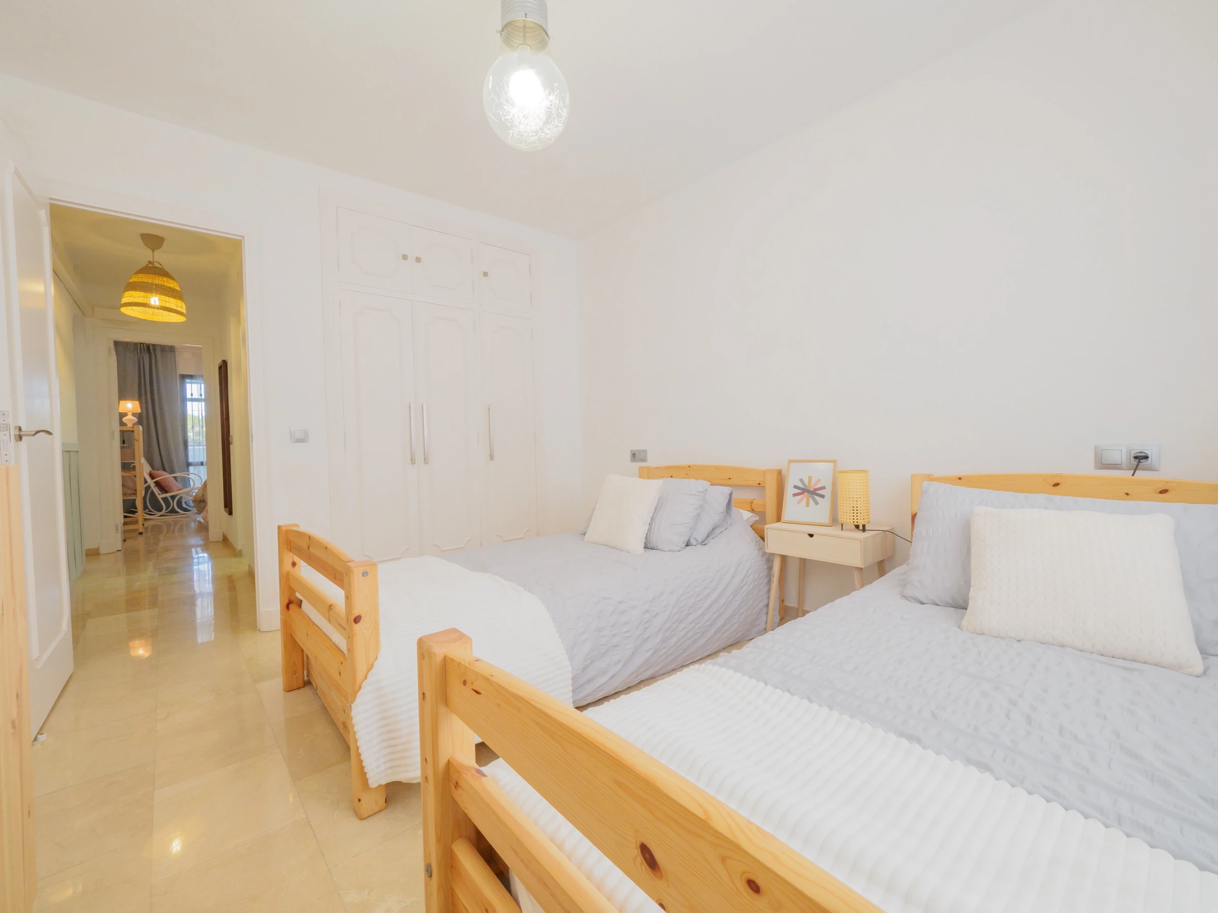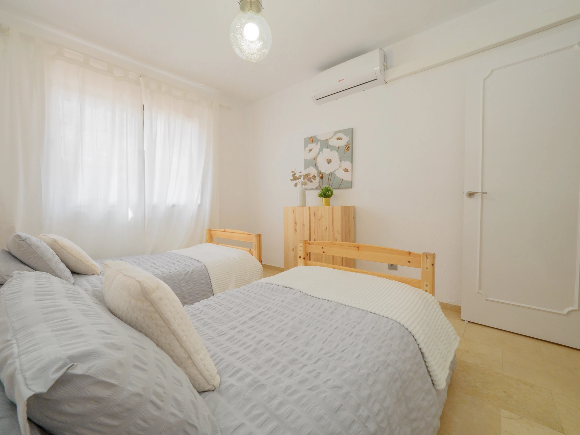 The apartment has two bedrooms separated by a spacious bathroom with a shower tray. The main bedroom has a double bed and direct access to the terrace, while the second bedroom has two single beds, one of them a trundle bed, which allows comfortably accommodating a fifth person 🛏️🌙.