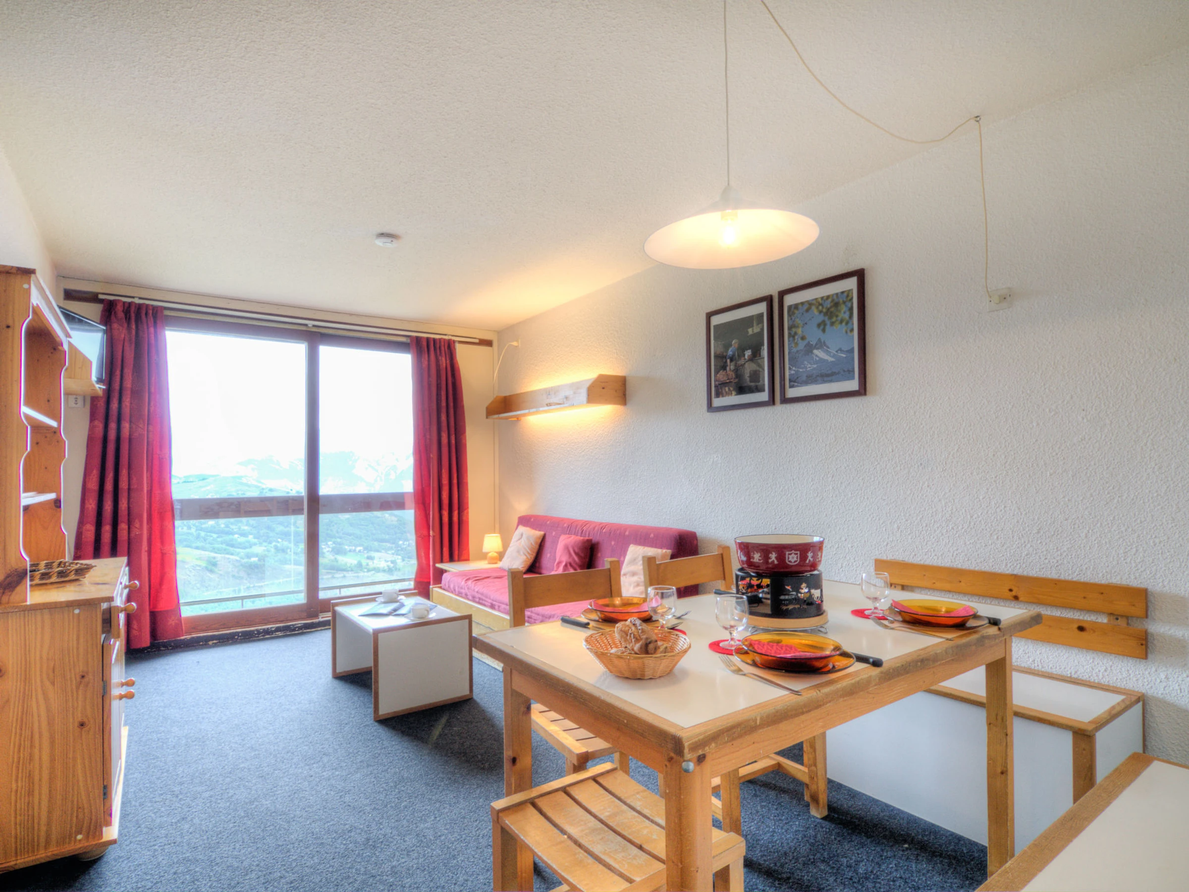 1-room apartment 28 m2 on 15th floor, north facing position. Simple furnishings: living/dining room with 1 bed (80 cm, length 190 cm), 1 sleeping facility (80 cm, length 190 cm), TV (flat screen), electric shutters. Exit to the balcony, north facing position. Alcove with 1 x 2 bunk beds (80 cm, length 190 cm). Kitchenette (2 hot plates, oven, toaster, kettle, microwave, electric coffee machine). Bathroom, sep. WC. Electric heating. Carpet. Balcony 4 m2, north facing position. View of the mountains and the valley. Facilities: hair dryer. Internet (WiFi, extra). Please note: non-smokers only. Maximum 1 pet/ dog allowed. Smoke alarm. Instead of an enclosed bedroom, some sleeping areas are located in an open-plan area (gallery, alcove, etc.). Offer by a private individual according to Art. 155, IV of CGI.