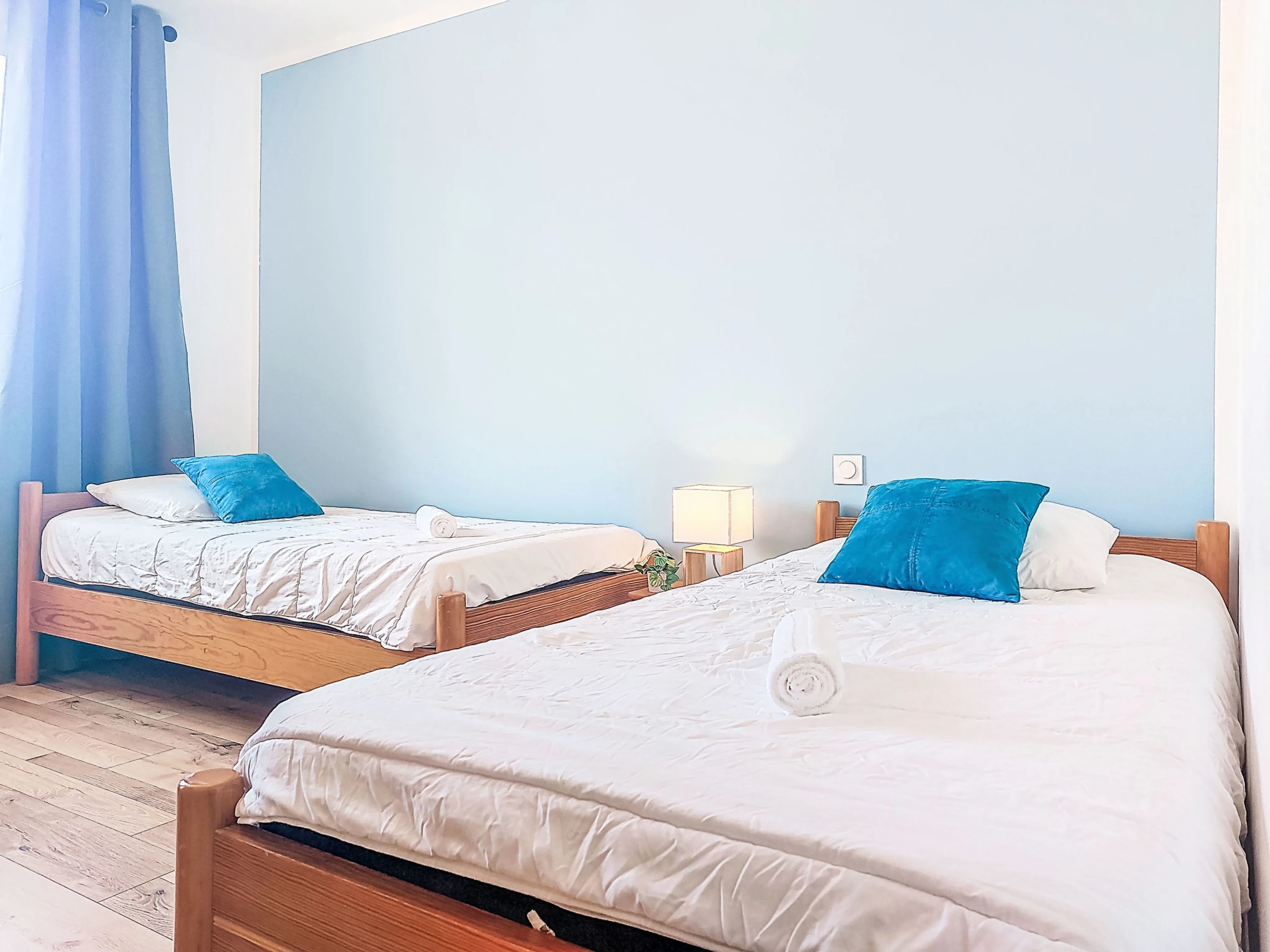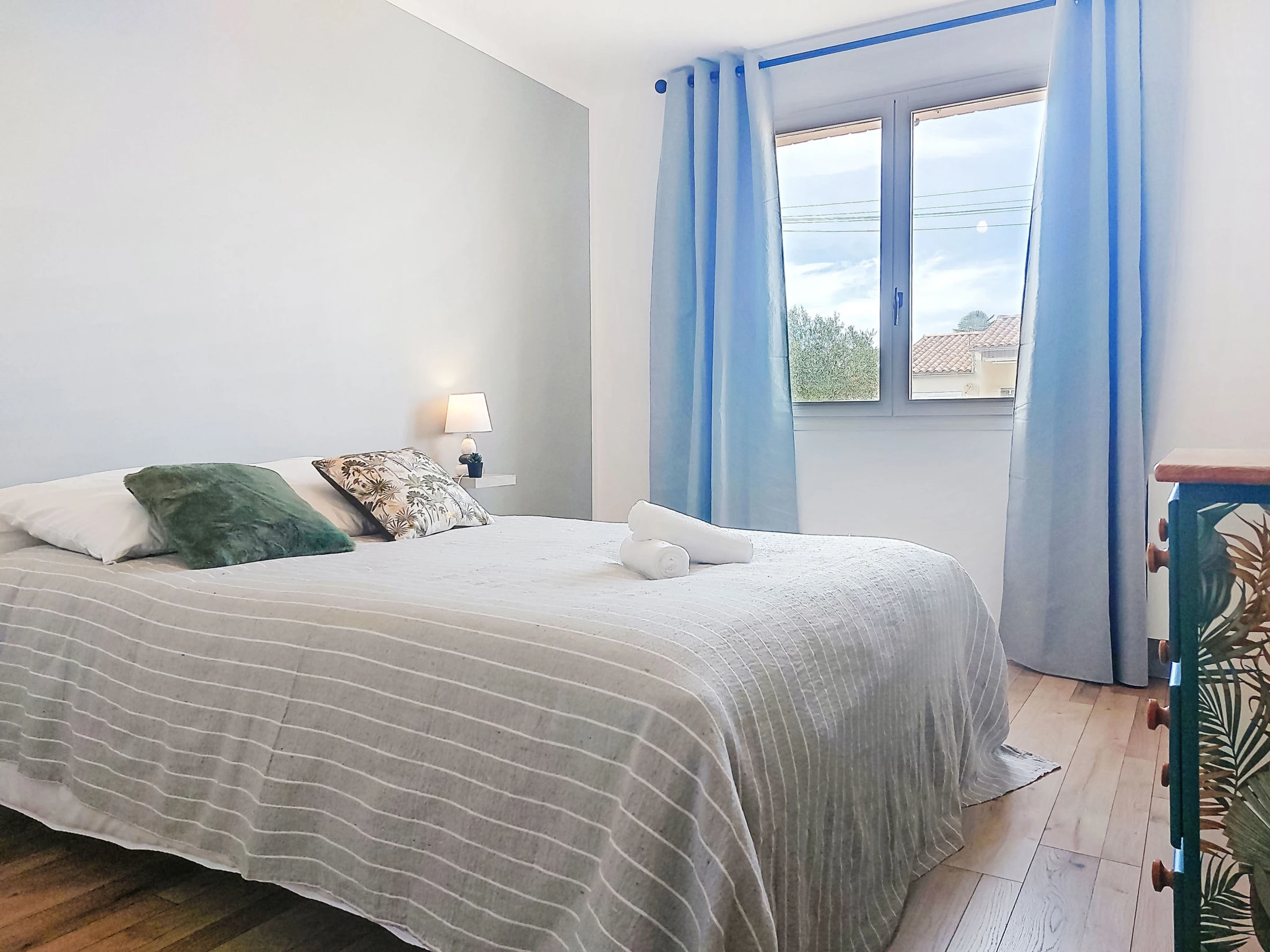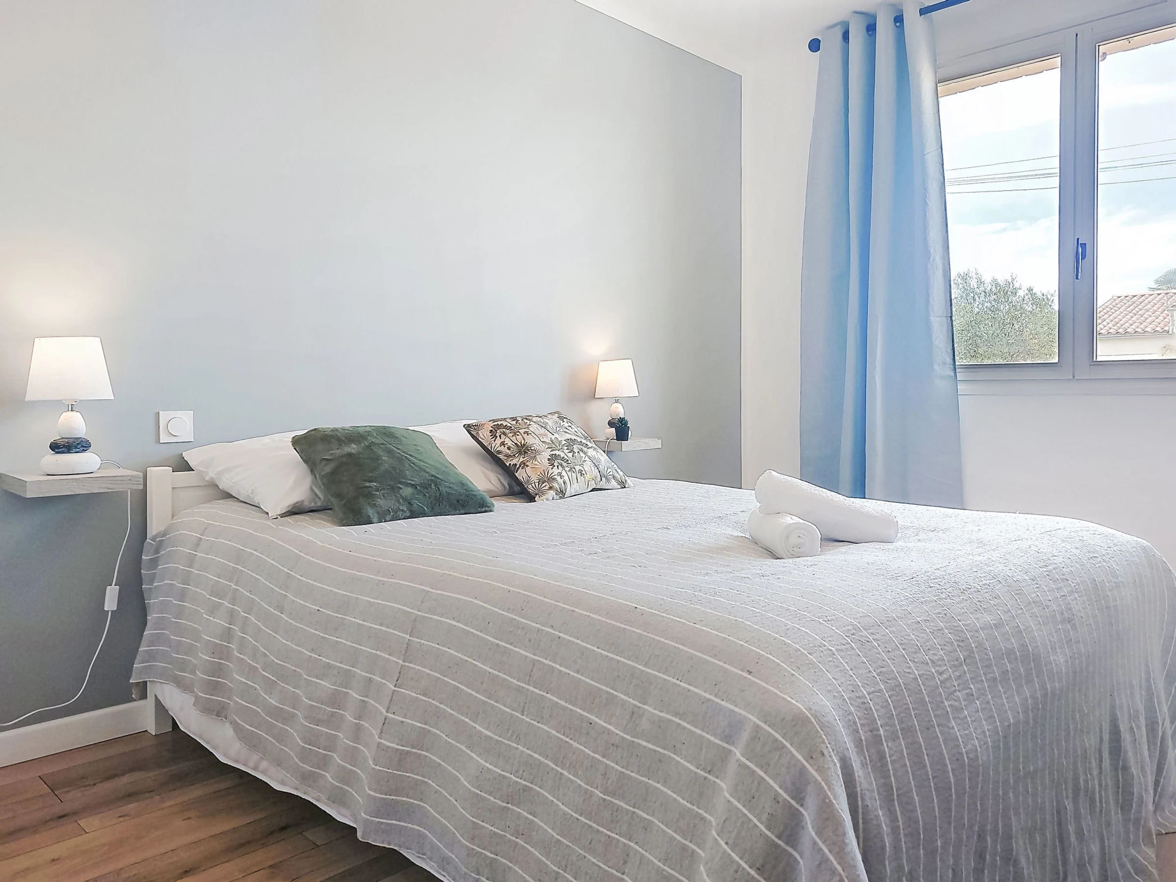 "Saint Tro", 4-room house 90 m2. Comfortable and modern furnishings: living/dining room with TV (flat screen), air conditioning. Exit to the terrace. 1 room with 1 french bed (1 x 140 cm, length 190 cm), shower/WC and air conditioning. 1 room with 1 french bed (1 x 140 cm, length 190 cm). 1 room with 2 beds (90 cm, length 190 cm). Open kitchen (oven, dishwasher, 4 ceramic glass hob hotplates, toaster, kettle, microwave, electric coffee machine). Bathroom, sep. WC. Electric heating. Terrace furniture, barbecue. Facilities: washing machine, iron, hair dryer. Internet (WiFi, free). Parking (fenced 2 cars). Please note: non-smoking house. Smoke alarm, fire extinguisher. Offer by a private individual according to Art. 155, IV of CGI. [hidden]