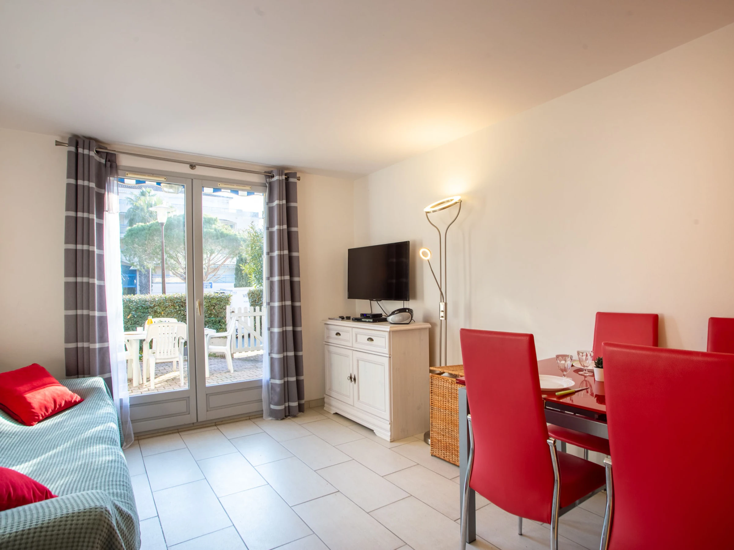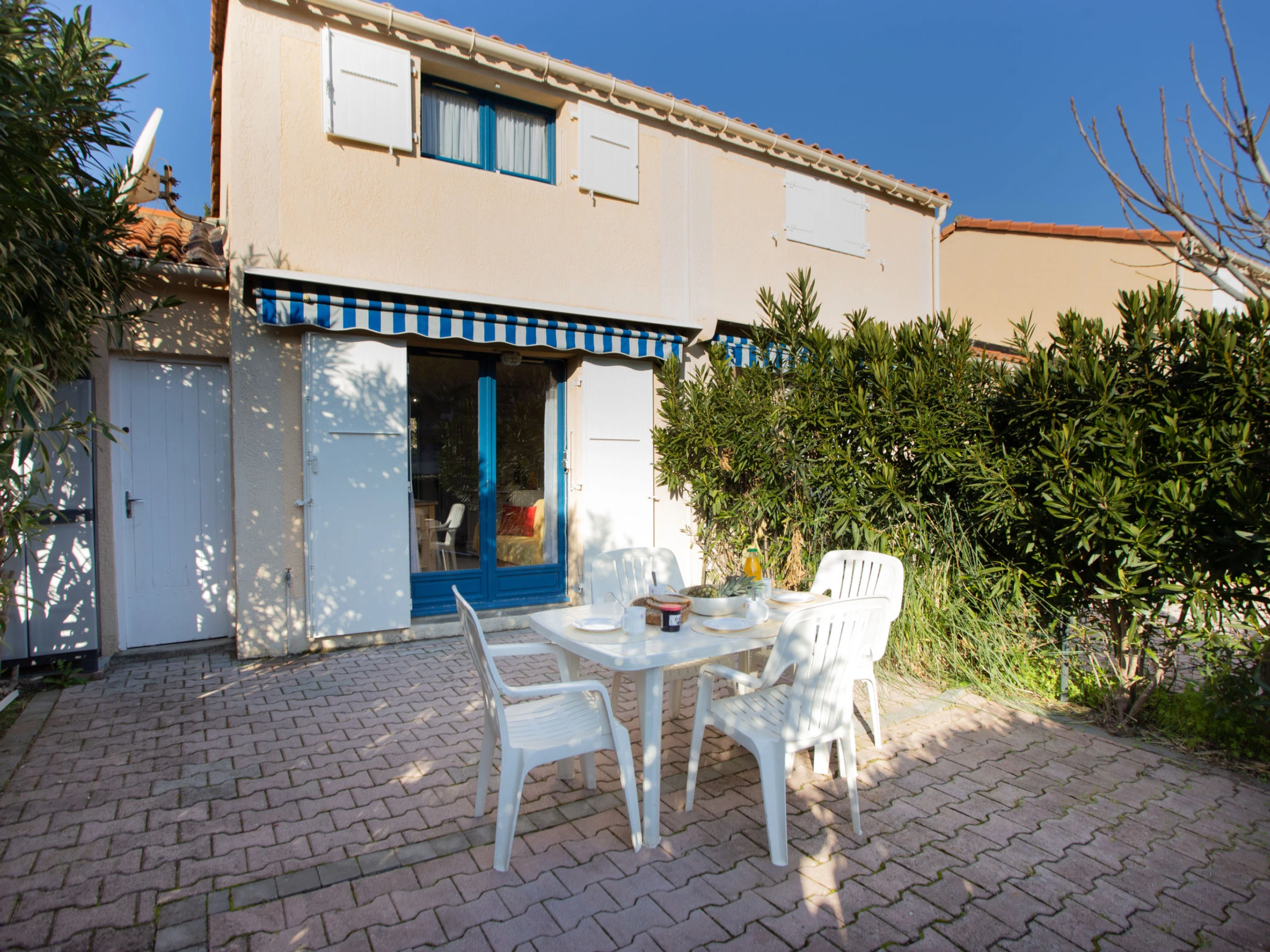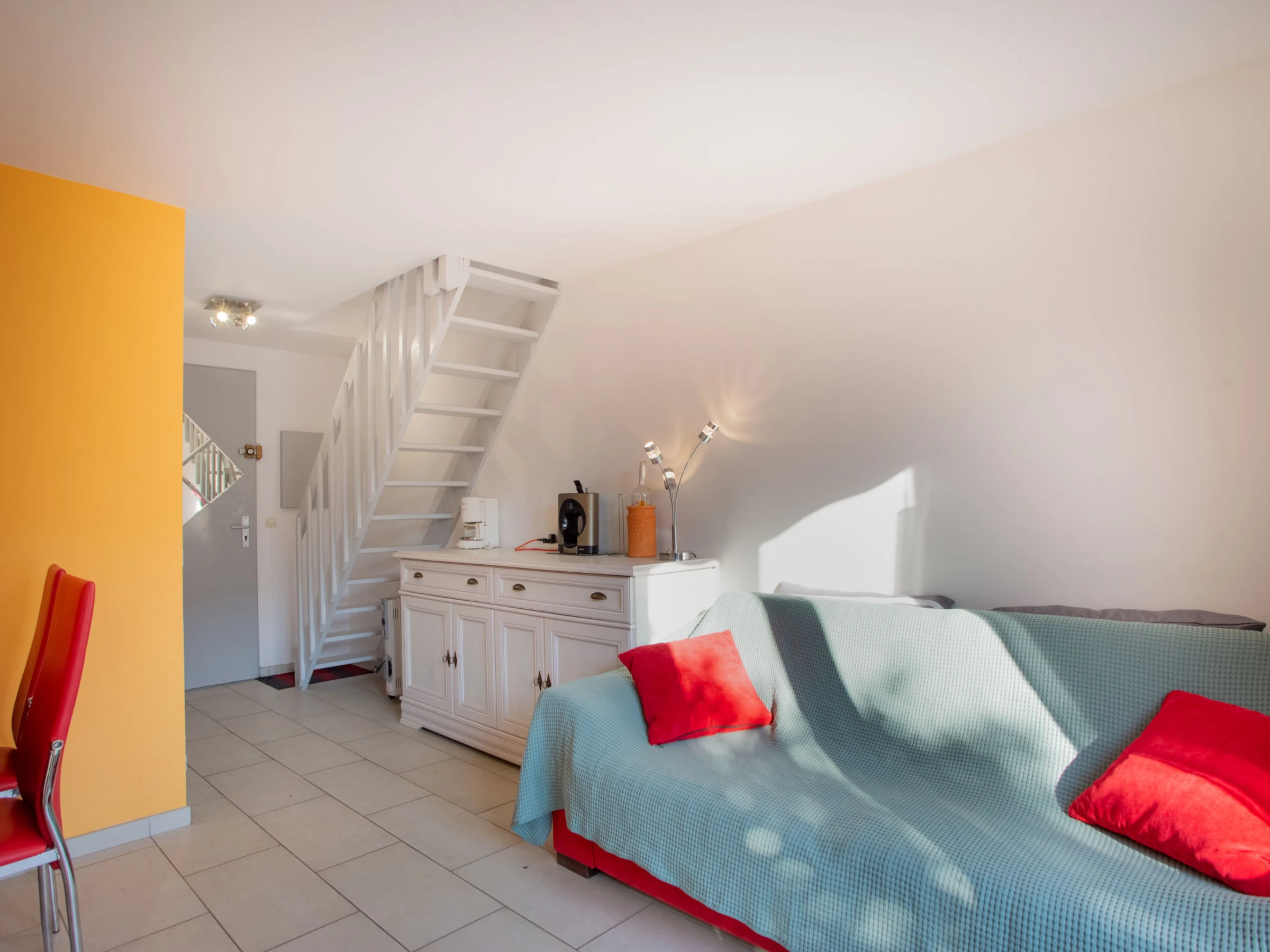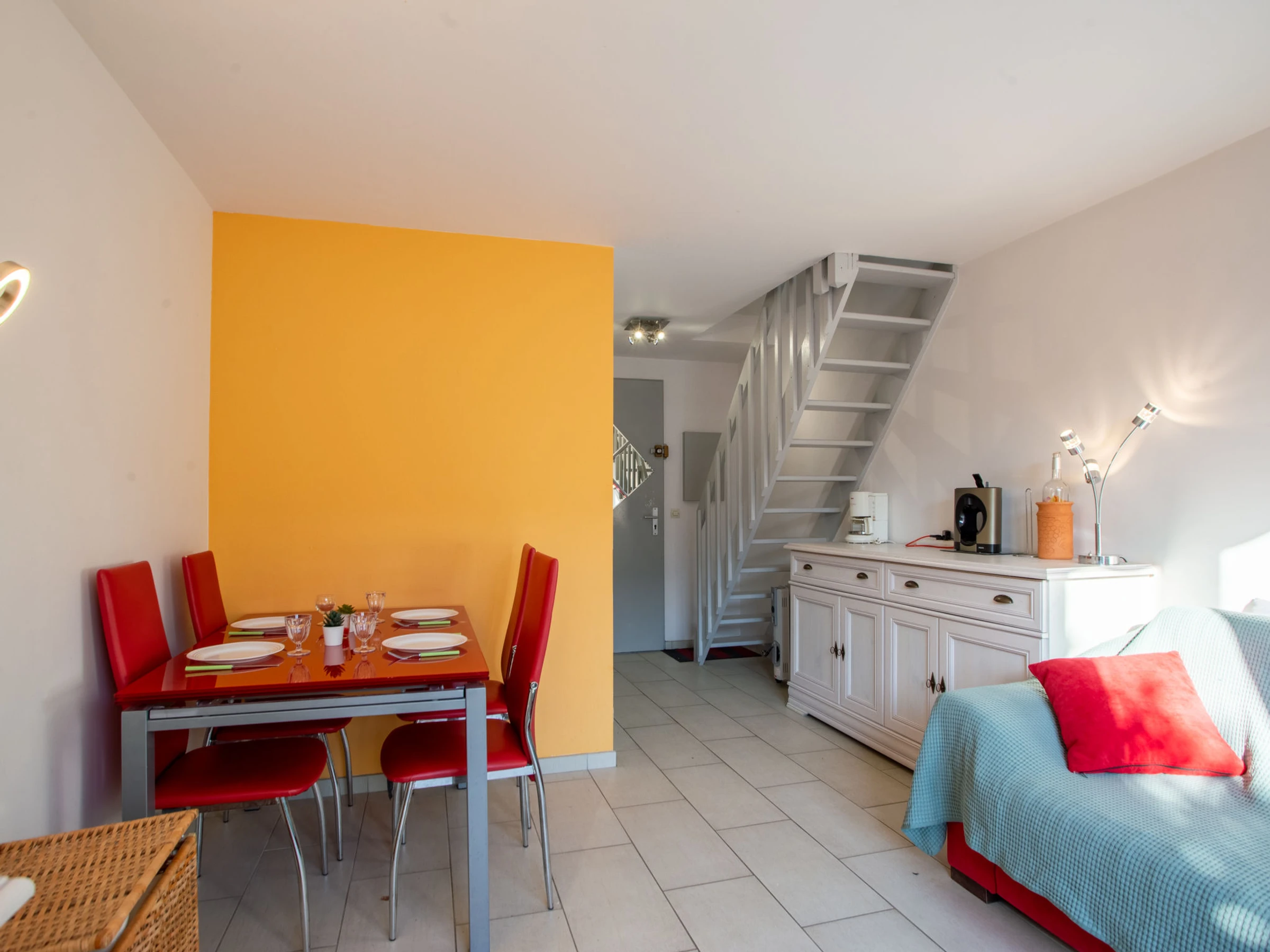 3-room terraced house 33 m2 on 2 levels. Comfortable and beautiful furnishings: living/dining room with TV (flat screen). Exit to the terrace. Small kitchen (oven, 2 ceramic glass hob hotplates, toaster, kettle, microwave, freezer, electric coffee machine). Sep. WC. No heating option. Upper floor: 1 room with 1 french bed (140 cm, length 190 cm). 1 room with 1 double sofabed (140 cm, length 190 cm). Shower/WC. Terrace 35 m2. Terrace furniture, electric barbecue, deck chairs (2). Facilities: washing machine, iron, hair dryer. Internet (WiFi, extra). Please note: apartment street side. No parking. TV only FR. Smoke alarm. [hidden]