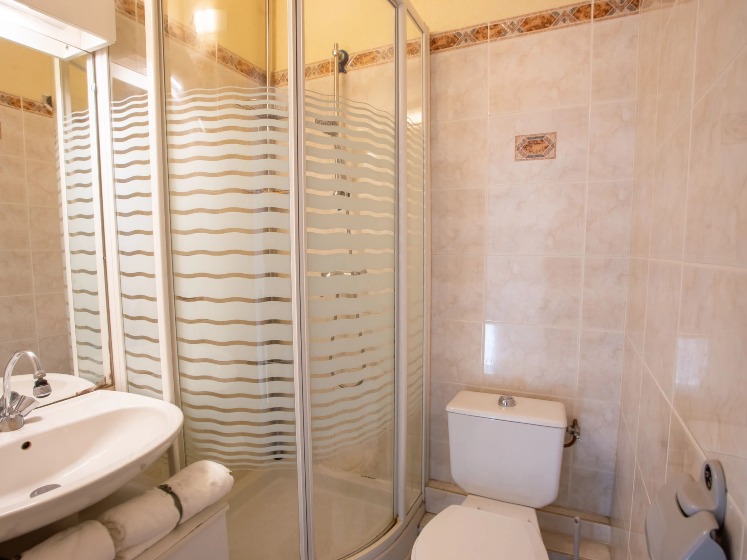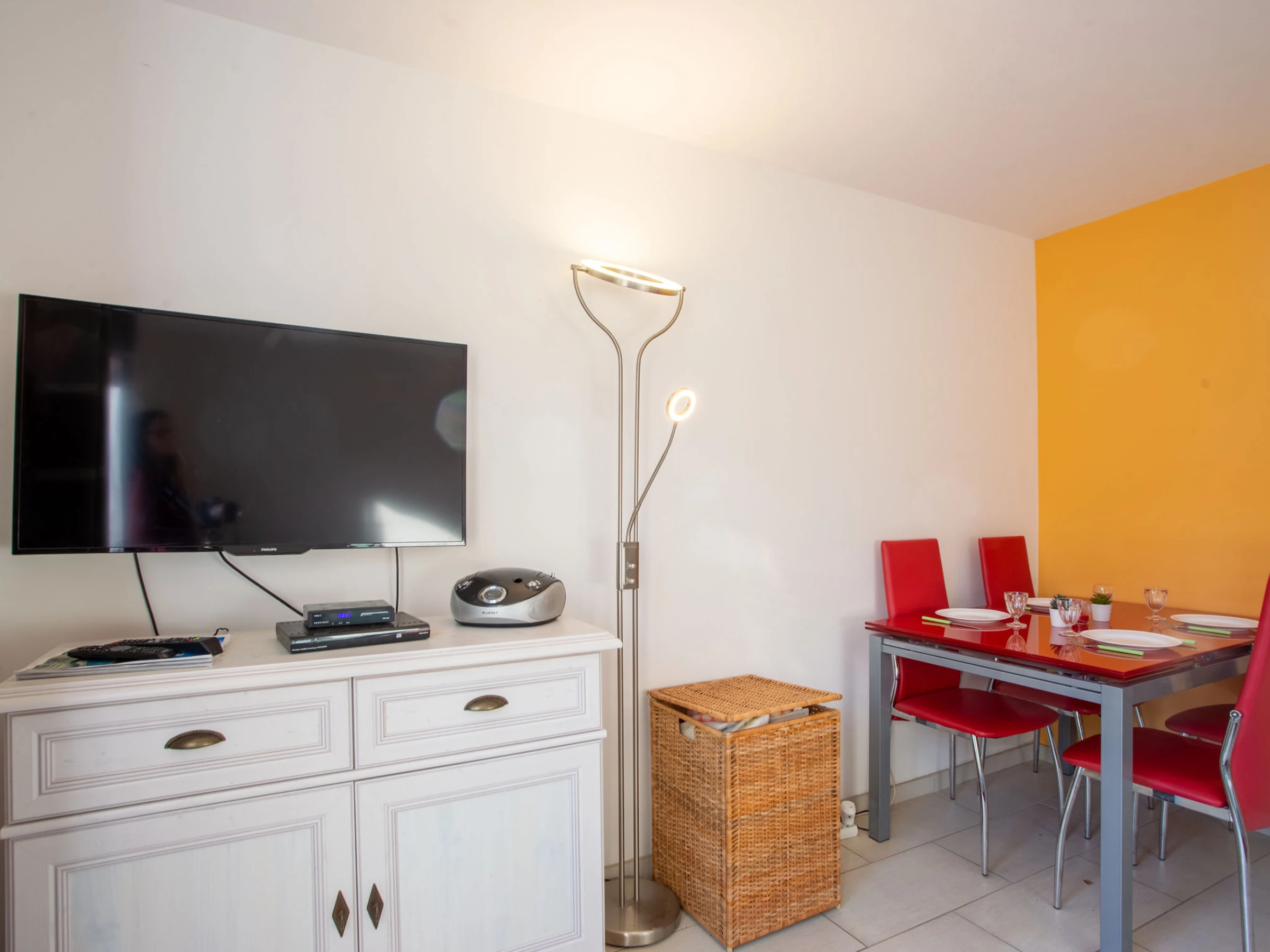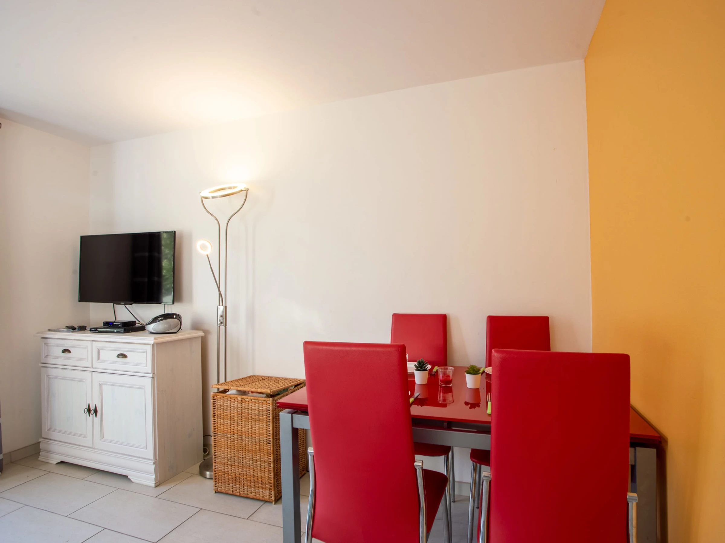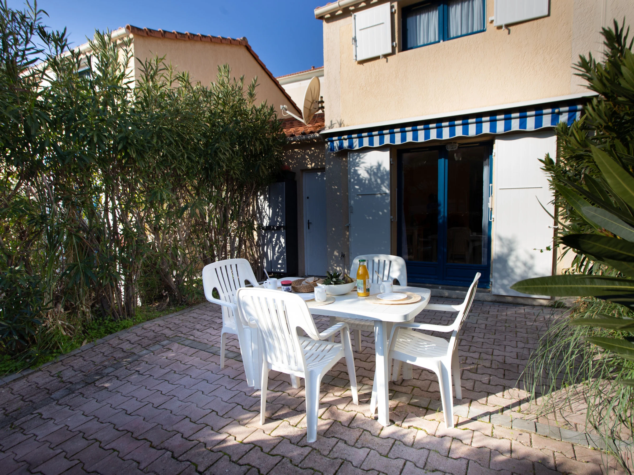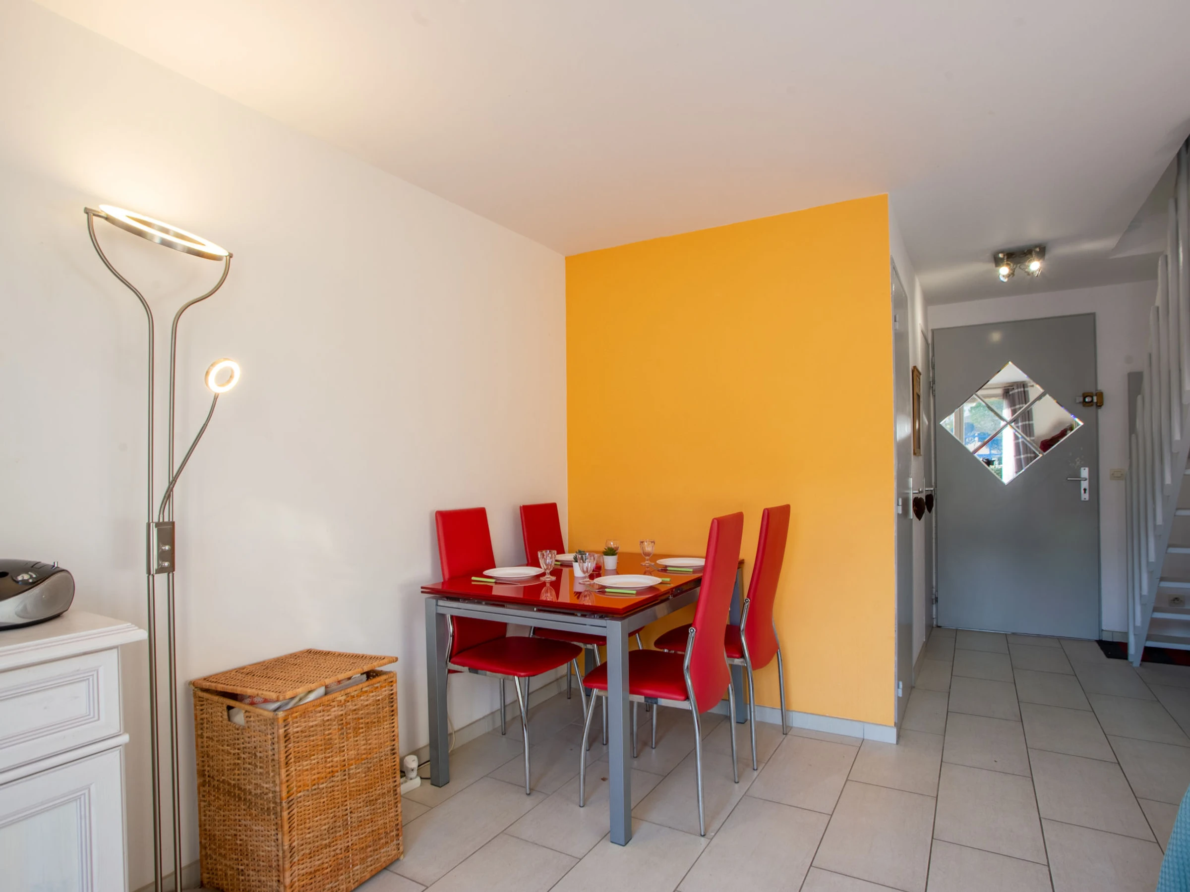3-room terraced house 33 m2 on 2 levels. Comfortable and beautiful furnishings: living/dining room with TV (flat screen). Exit to the terrace. Small kitchen (oven, 2 ceramic glass hob hotplates, toaster, kettle, microwave, freezer, electric coffee machine). Sep. WC. No heating option. Upper floor: 1 room with 1 french bed (140 cm, length 190 cm). 1 room with 1 double sofabed (140 cm, length 190 cm). Shower/WC. Terrace 35 m2. Terrace furniture, electric barbecue, deck chairs (2). Facilities: washing machine, iron, hair dryer. Internet (WiFi, extra). Please note: apartment street side. No parking. TV only FR. Smoke alarm. [hidden]