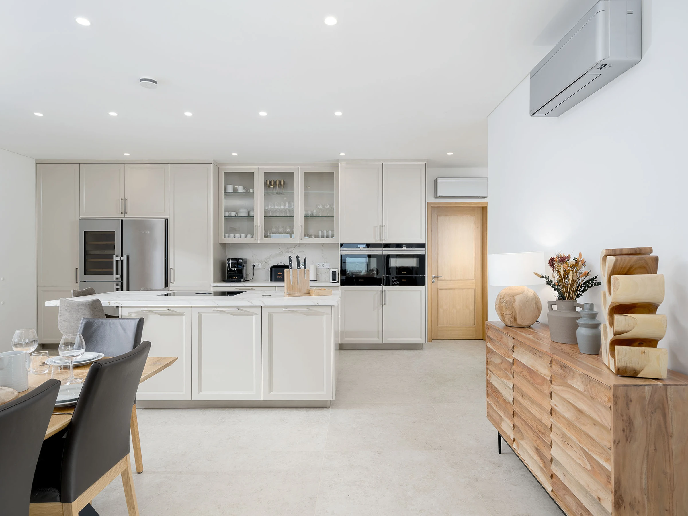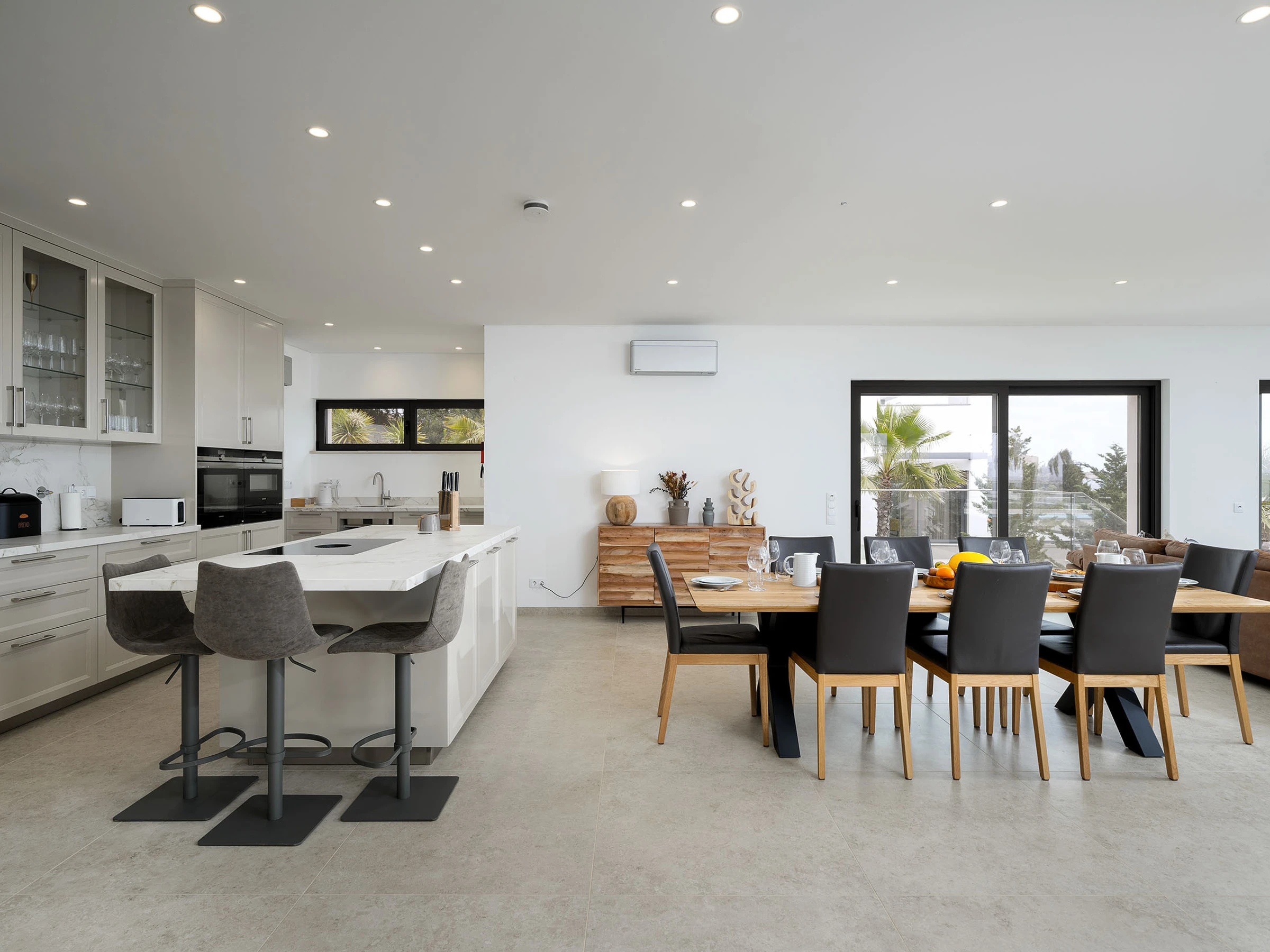 The villa features a fully equipped American-style kitchen with all the necessary appliances, including a fridge, freezer, oven, microwave, and dishwasher. The open-plan living and dining area provide ample space for everyone to gather and enjoy meals together.