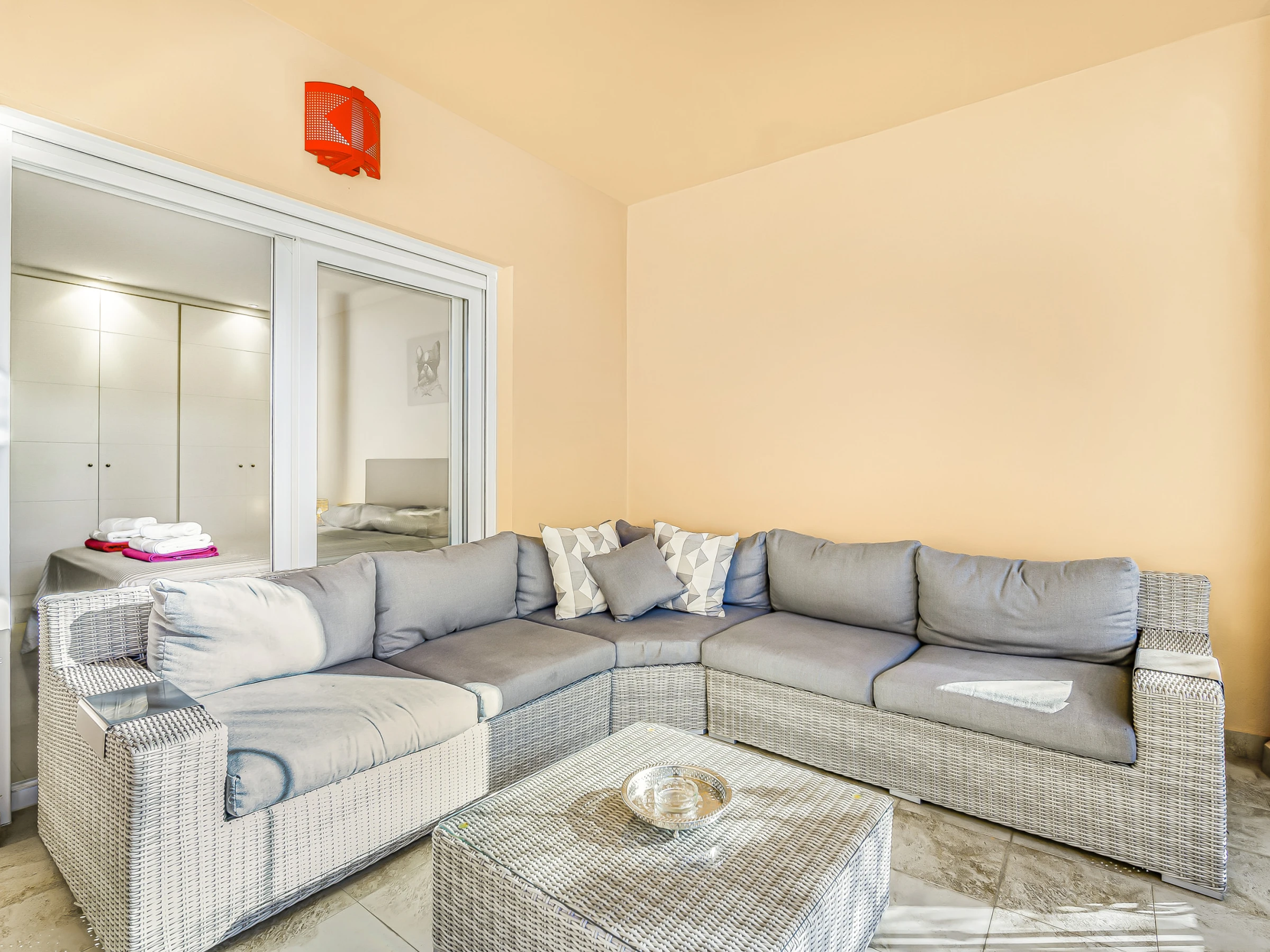 Inside the apartment, you'll find a comfortable living room with dining area that opens onto a charming terrace with glass shutters, allowing use and enjoyment all year-round and in all weather. Adjoined to the lounge is a modern kitchen that‘s equipped with everything you could possibly need. A hallway connects the living areas to a bedroom with a king-sized double bed and spacious bathroom with bath and shower.