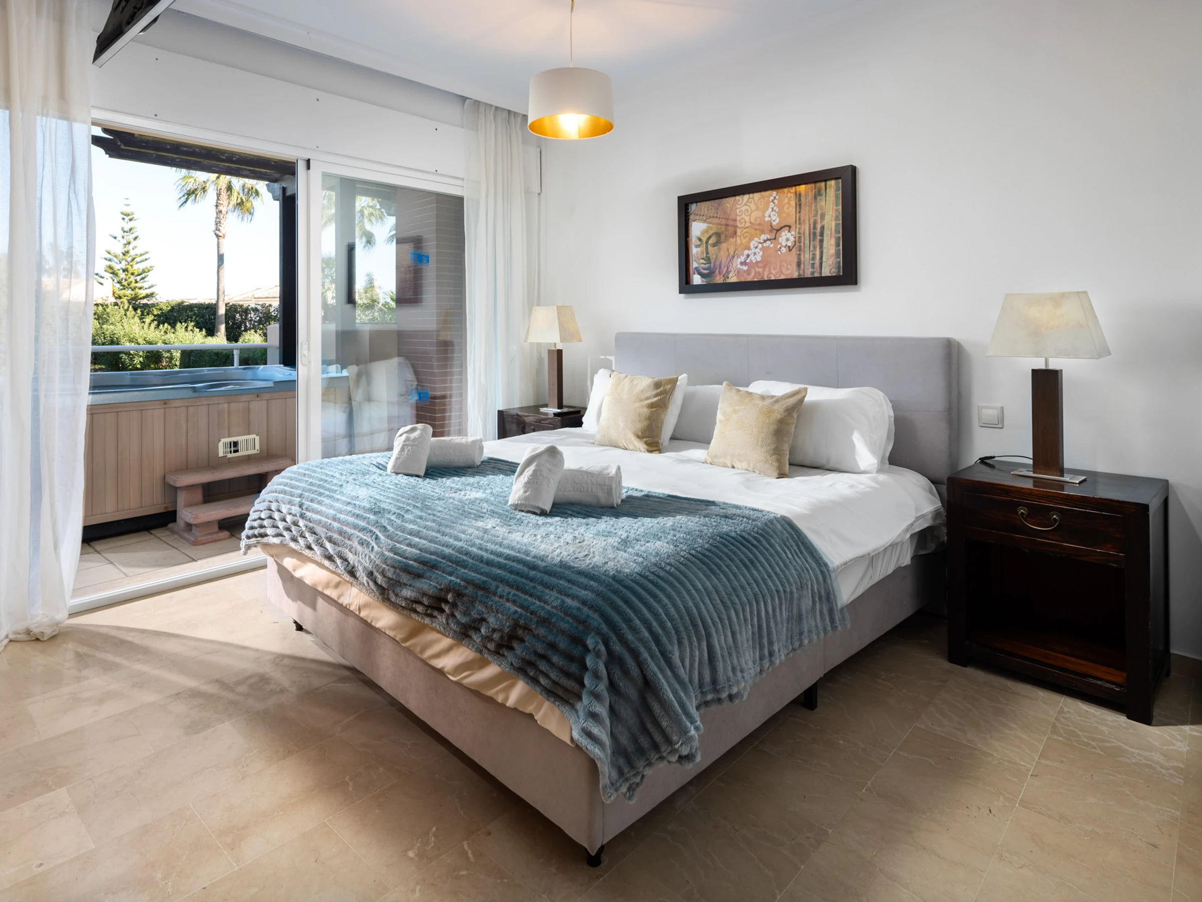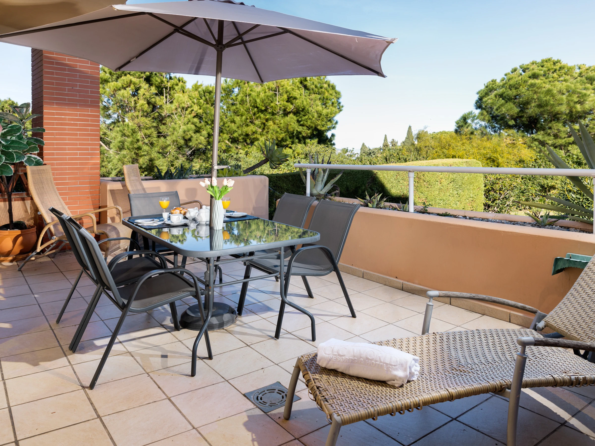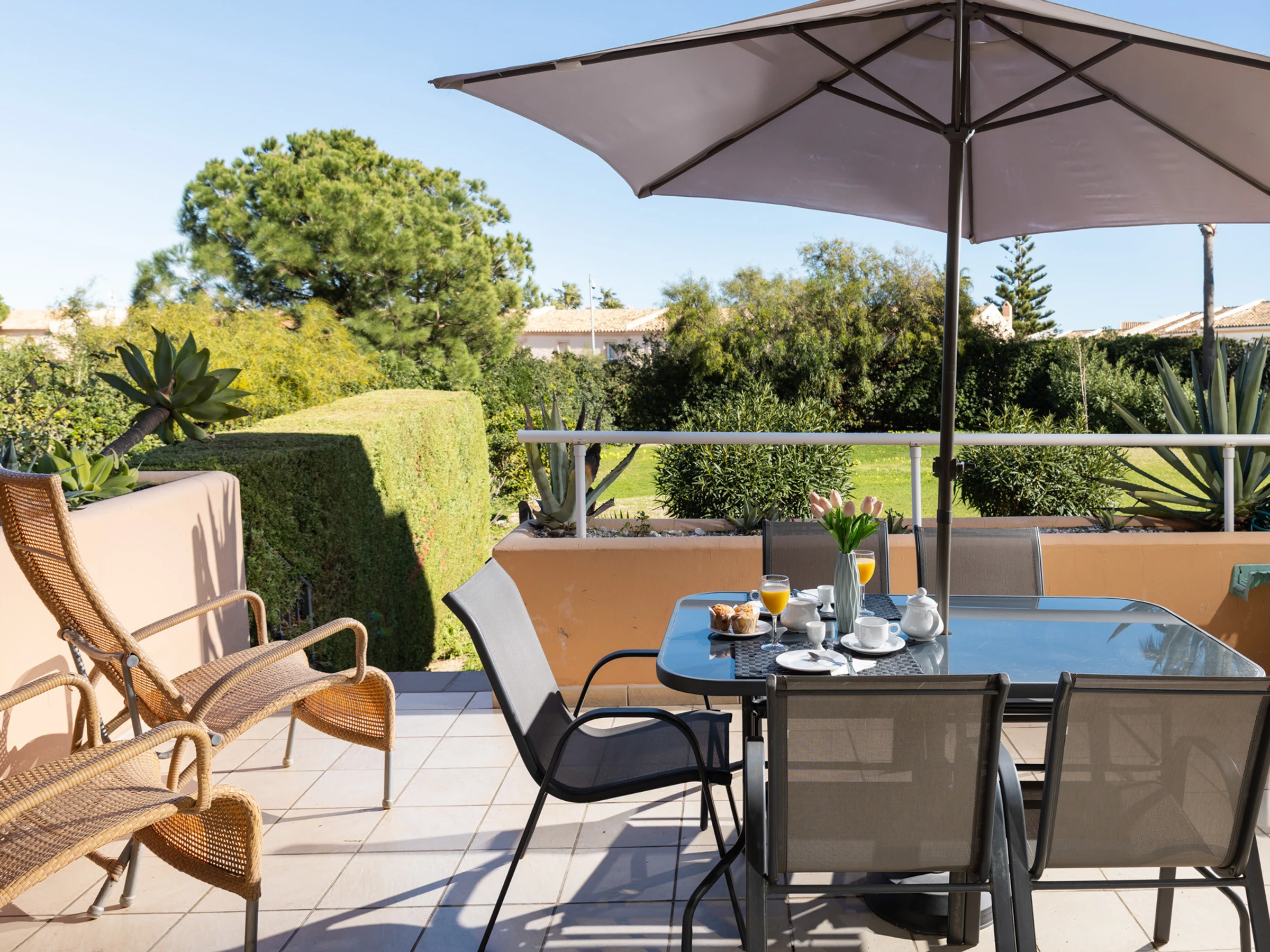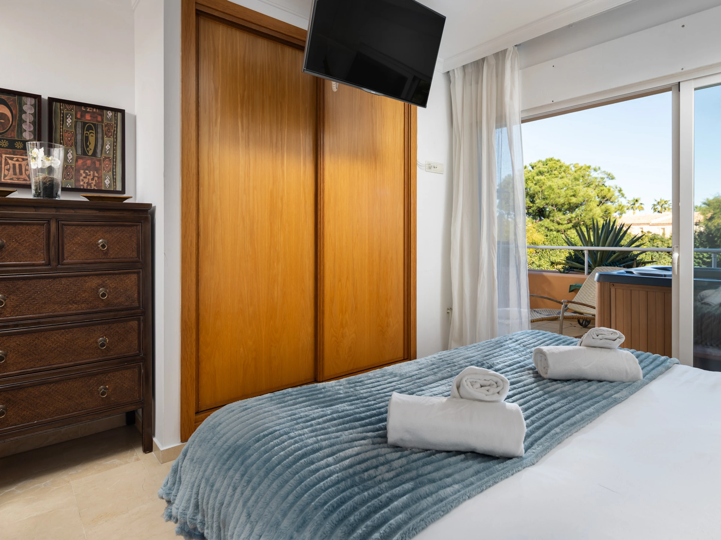 The accommodation is equipped with the following items: lift, garden, garden furniture, 25 m² terrace, washing machine, dryer, iron, safe, internet (Wi-Fi), hair dryer, childrens area, tennis court, heat pump, air-conditioned, swimming pool communal+children's, heated swimming pool communal, open-air parking in the same building, 3 TVs, satellite tv (Languages: Spanish, English).