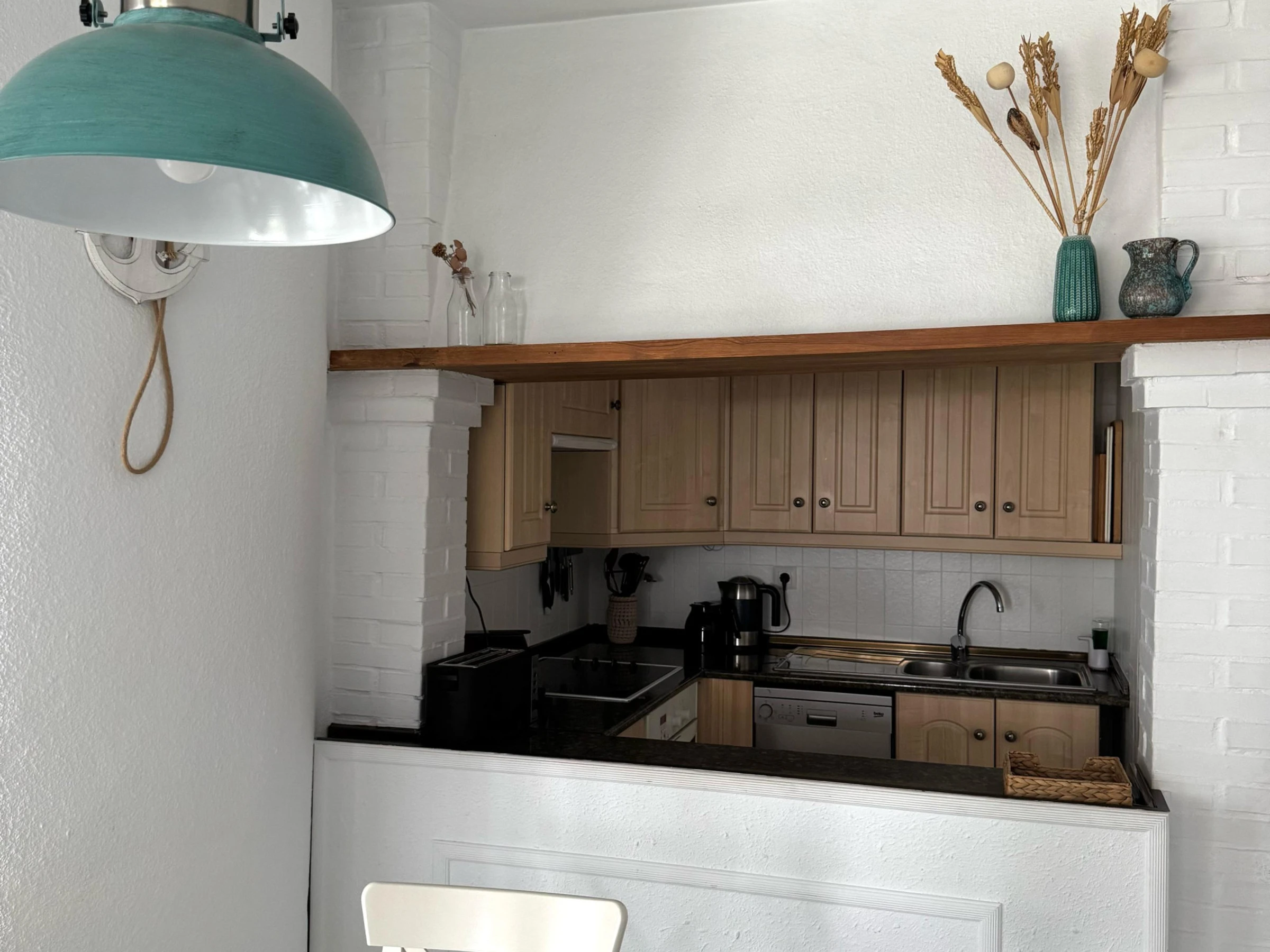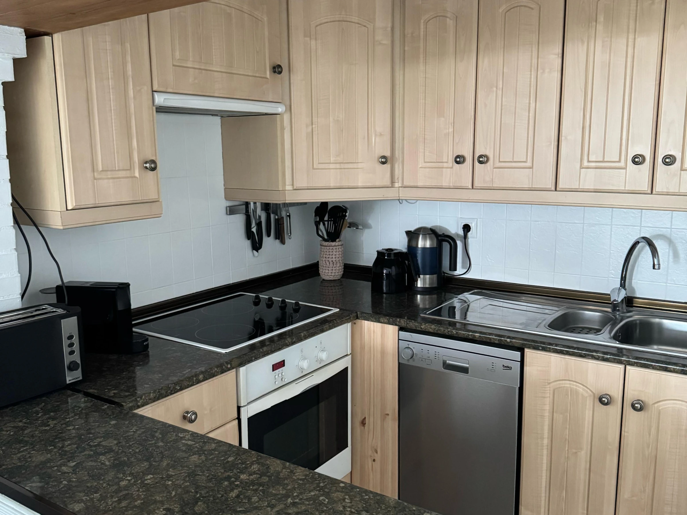 The open plan kitchen, of hotplate of glass ceramics, is equipped with refrigerator, oven, dishwasher, dishes/cutlery, kitchen utensils, coffee machine, toaster and kettle.