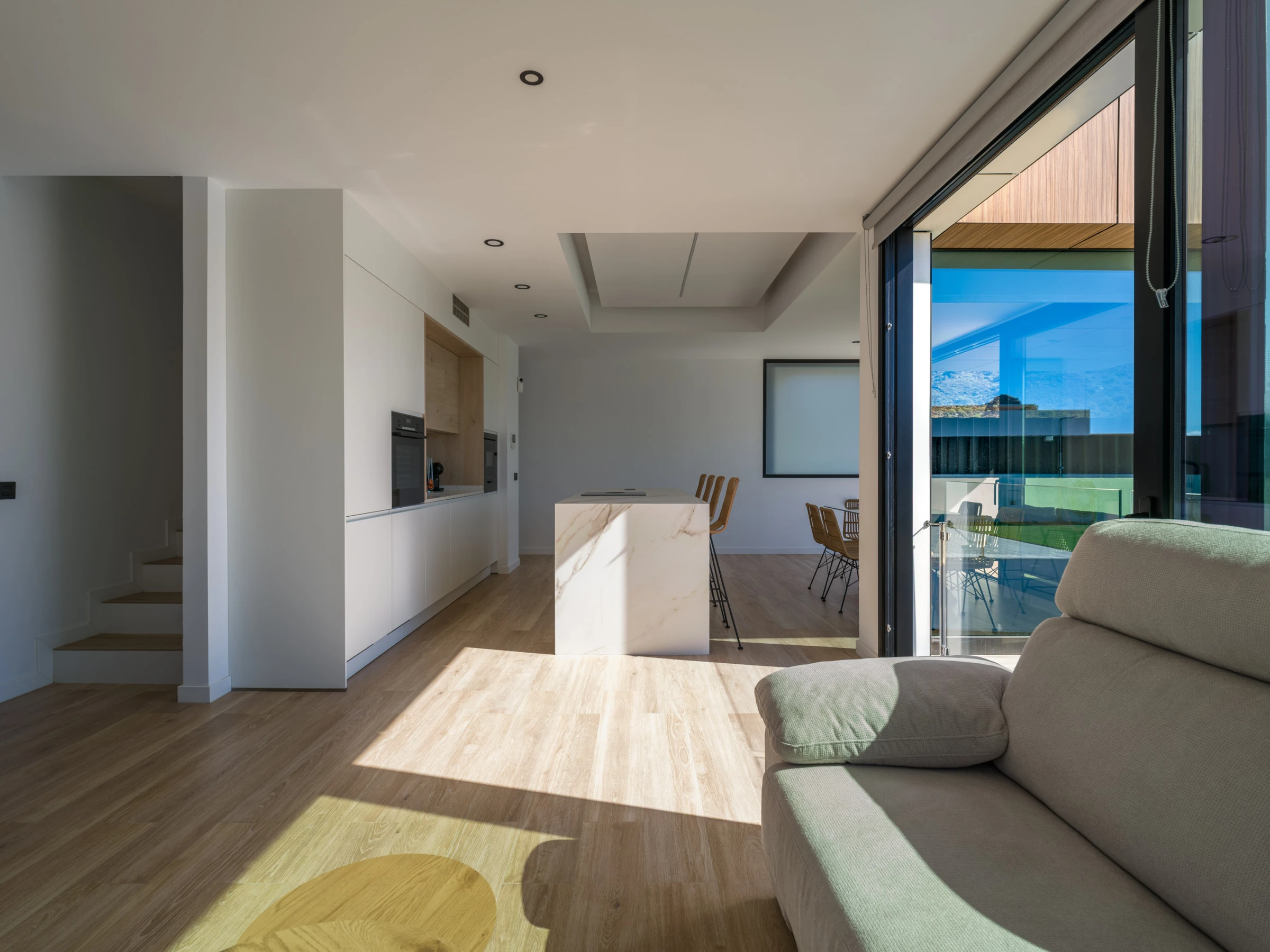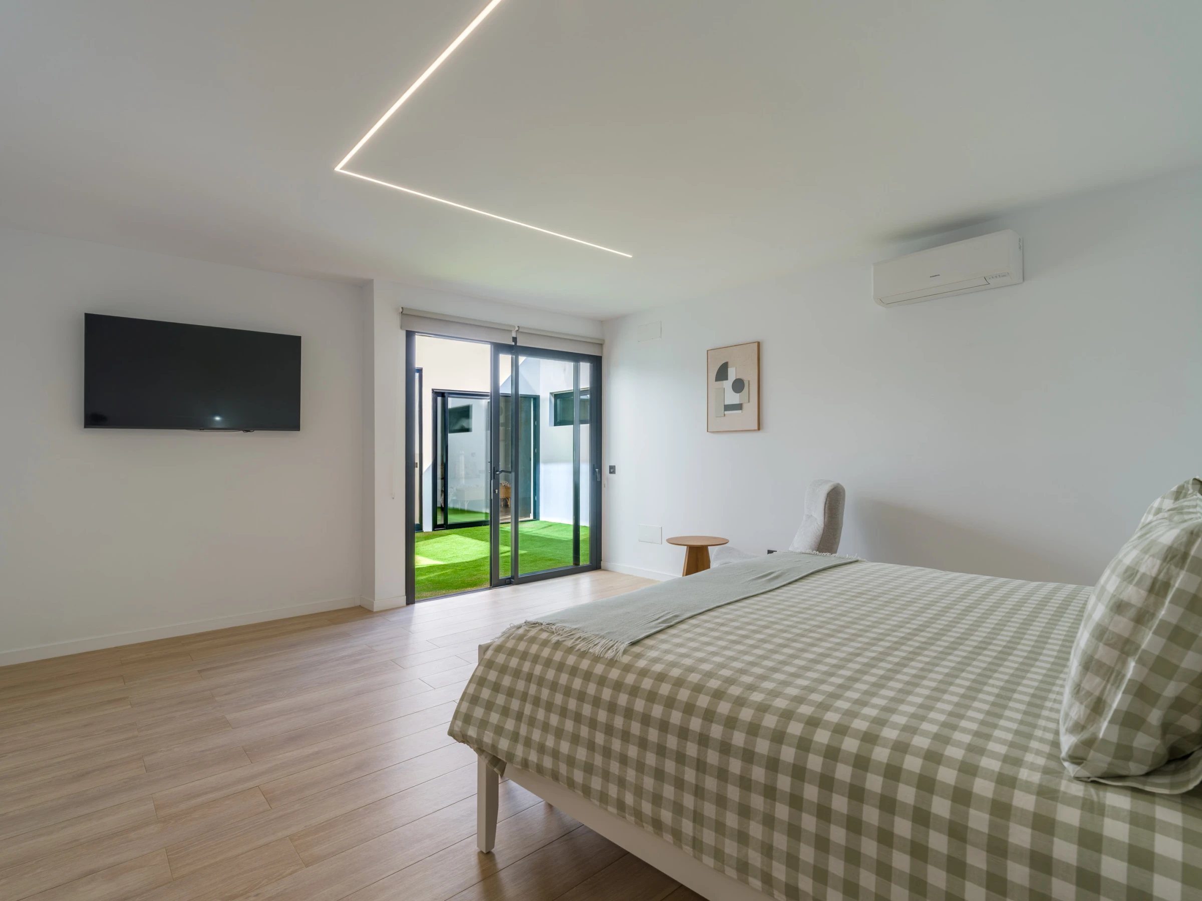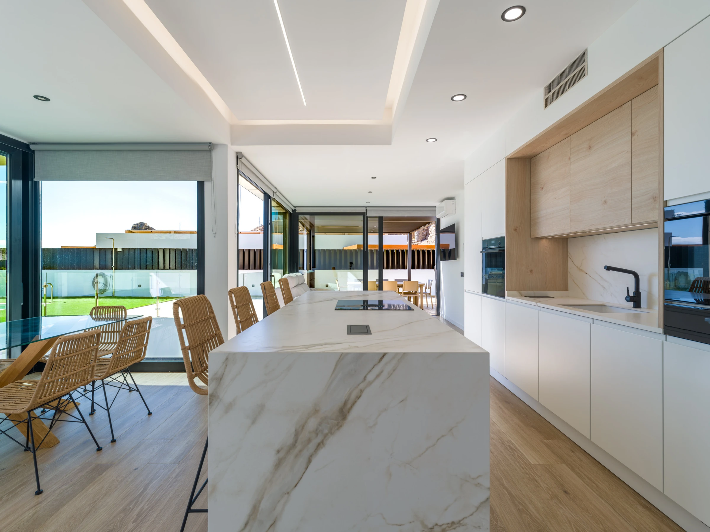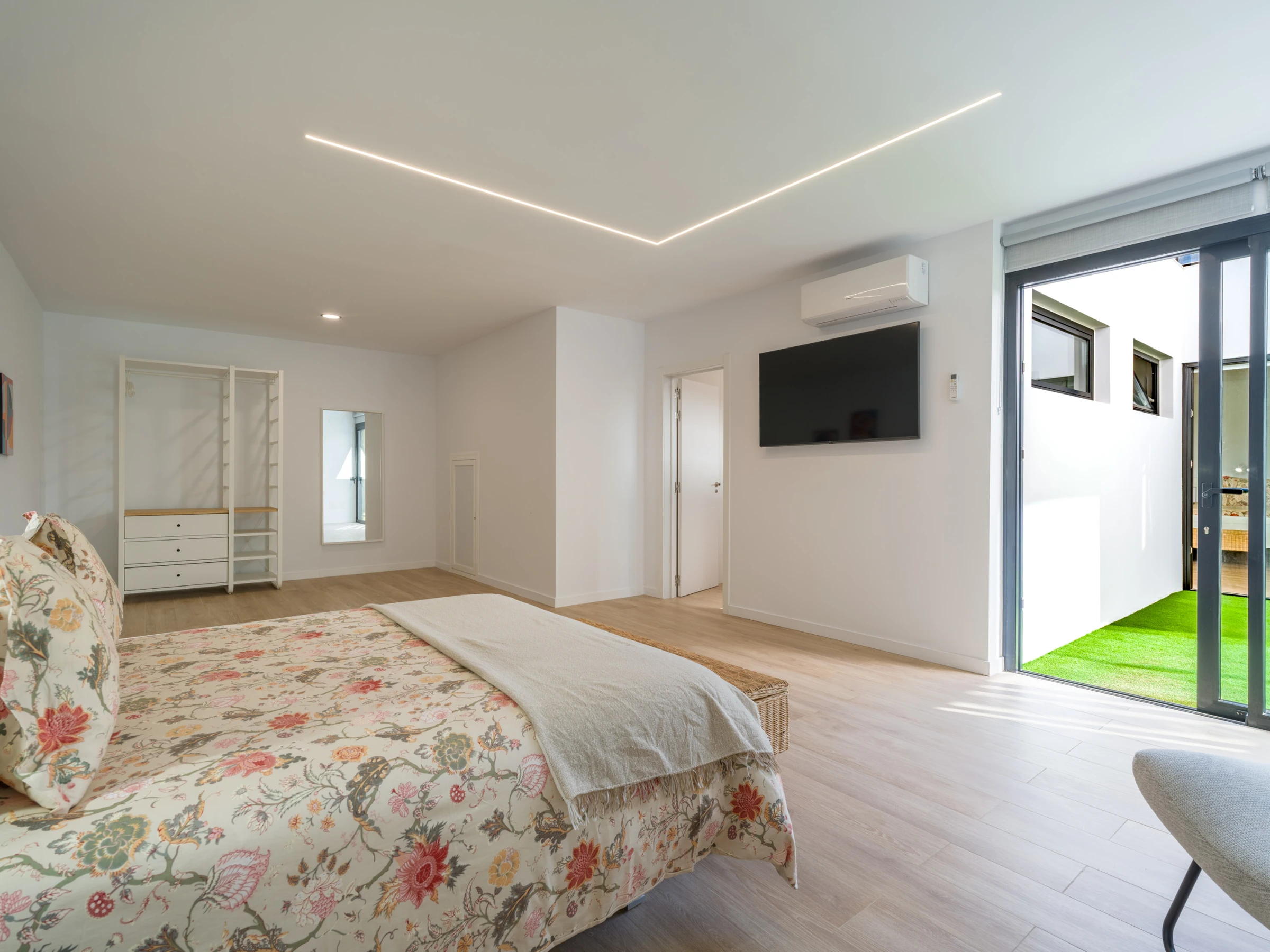 The exterior is one of the great attractions of the villa. The completely fenced perimeter provides privacy and tranquillity, while the outdoor area invites you to enjoy the open air with a heated private pool, sun loungers, outdoor shower, gas barbecue, shaded sofa area and outdoor dining room, ideal for relaxing and taking advantage of the sunny weather throughout the day.