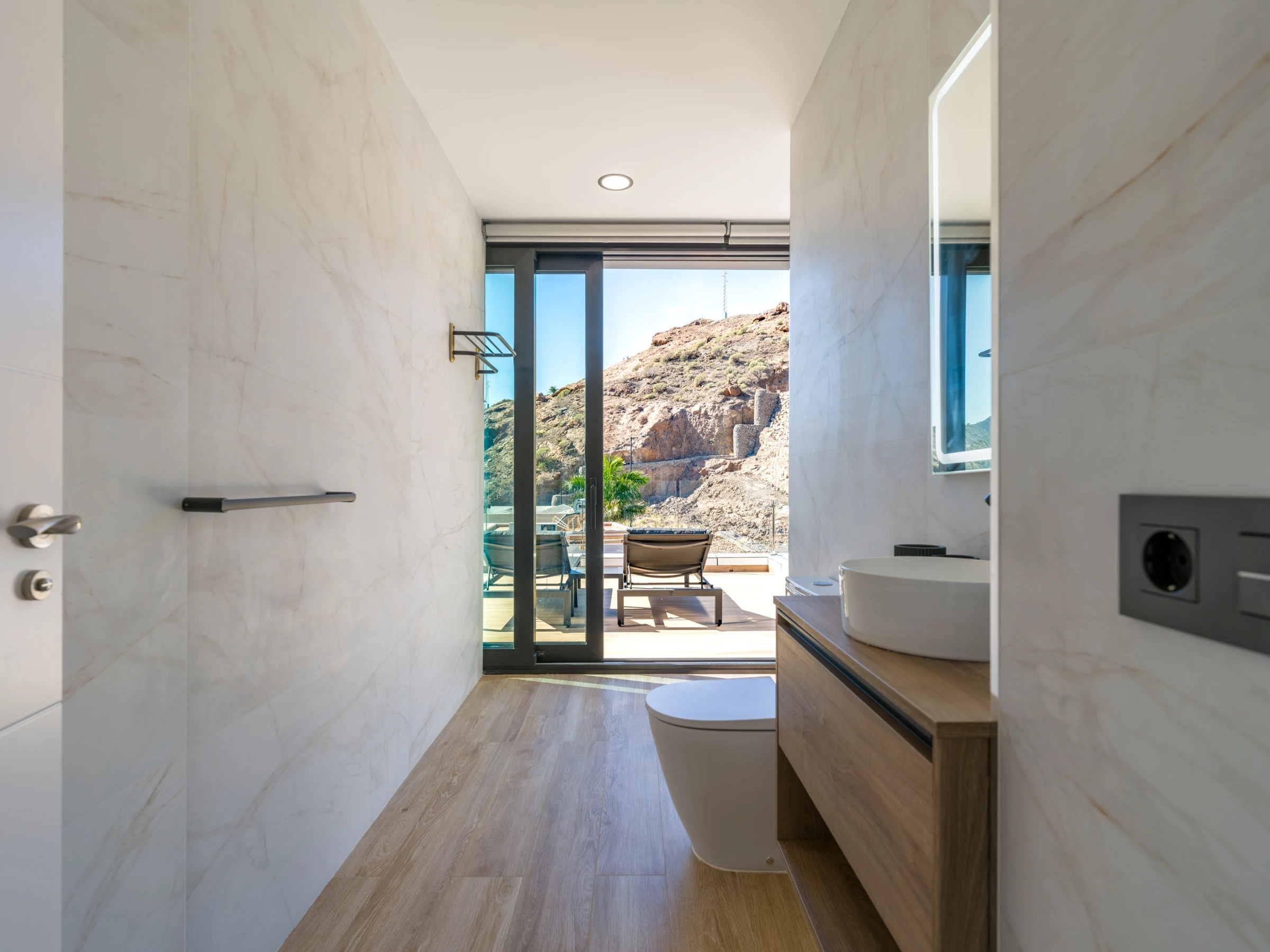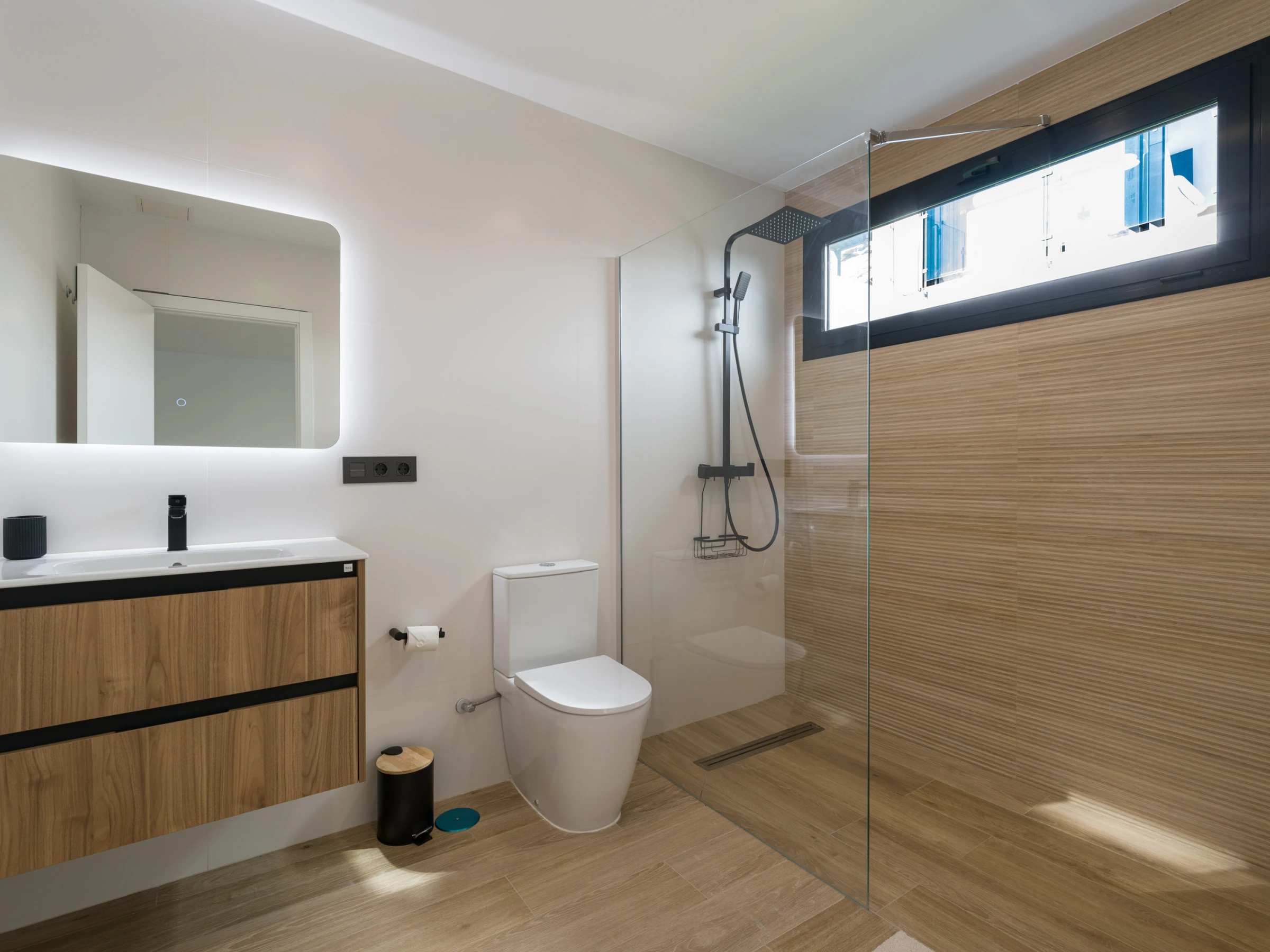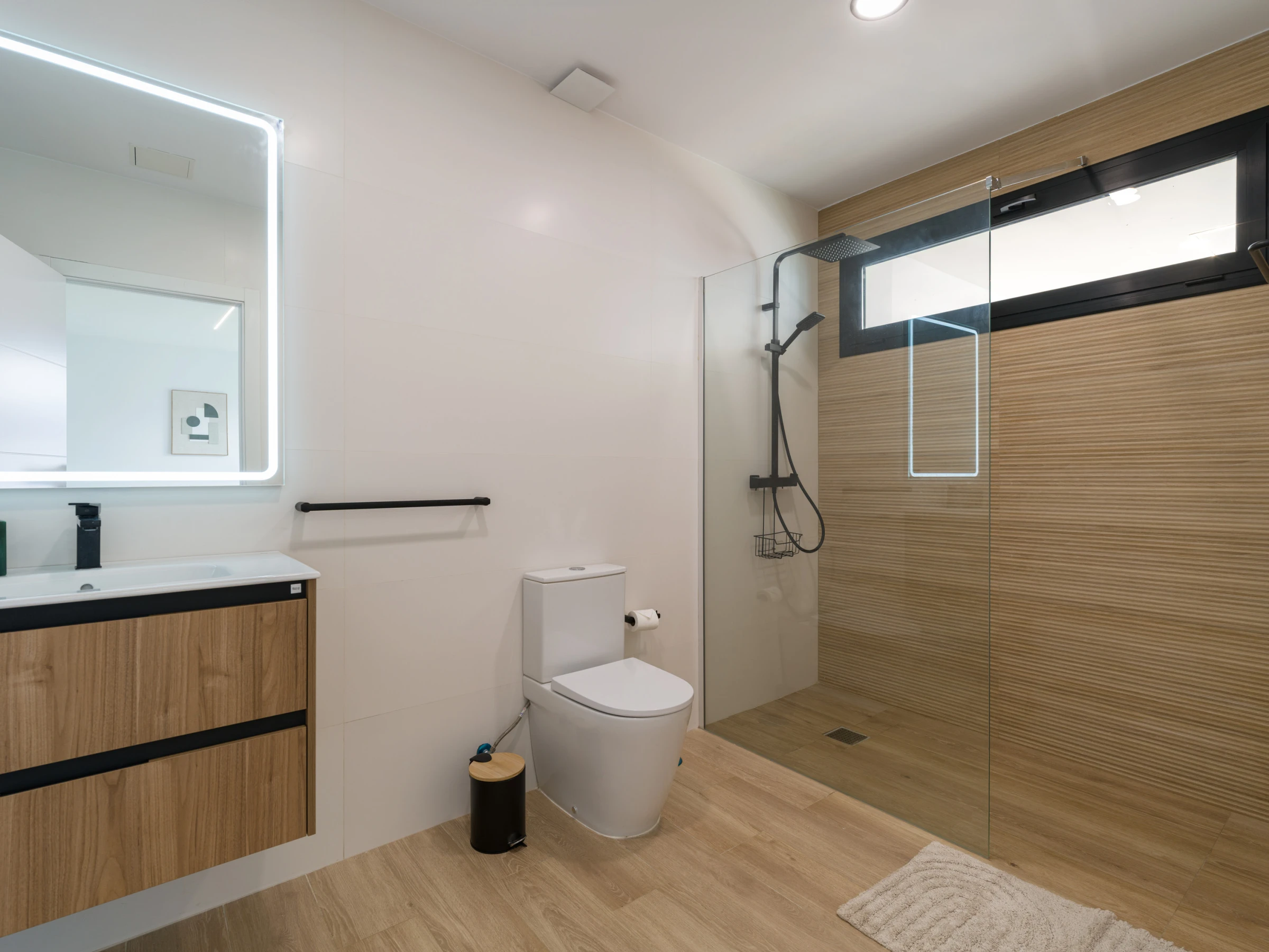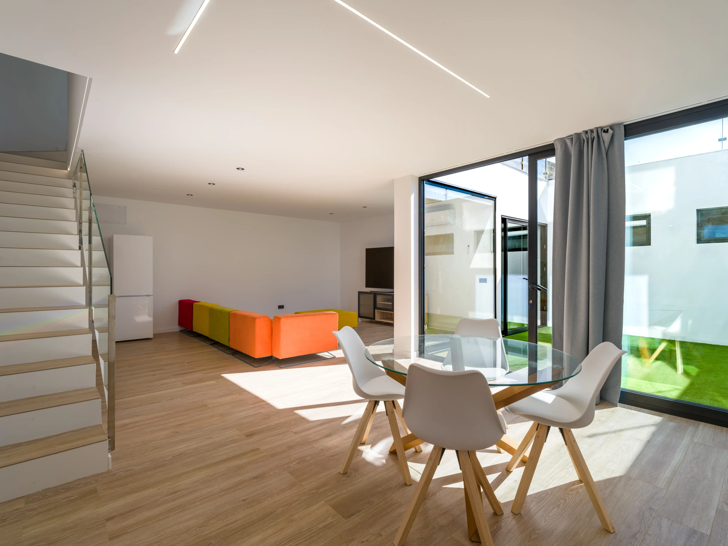 The exterior is one of the great attractions of the villa. The completely fenced perimeter provides privacy and tranquillity, while the outdoor area invites you to enjoy the open air with a heated private pool, sun loungers, outdoor shower, gas barbecue, shaded sofa area and outdoor dining room, ideal for relaxing and taking advantage of the sunny weather throughout the day.