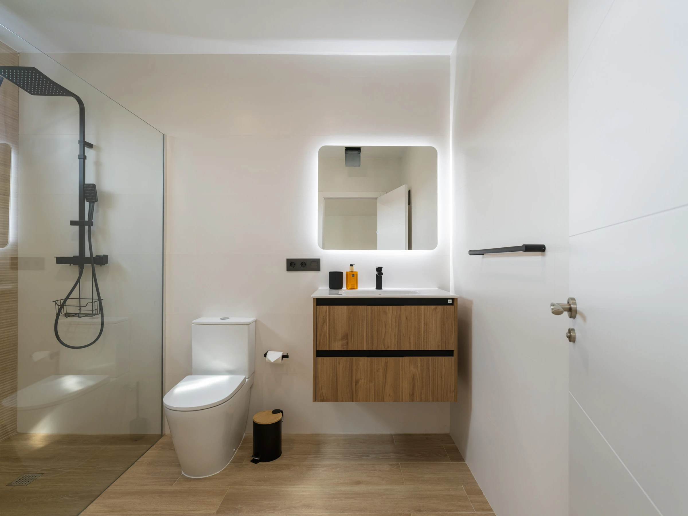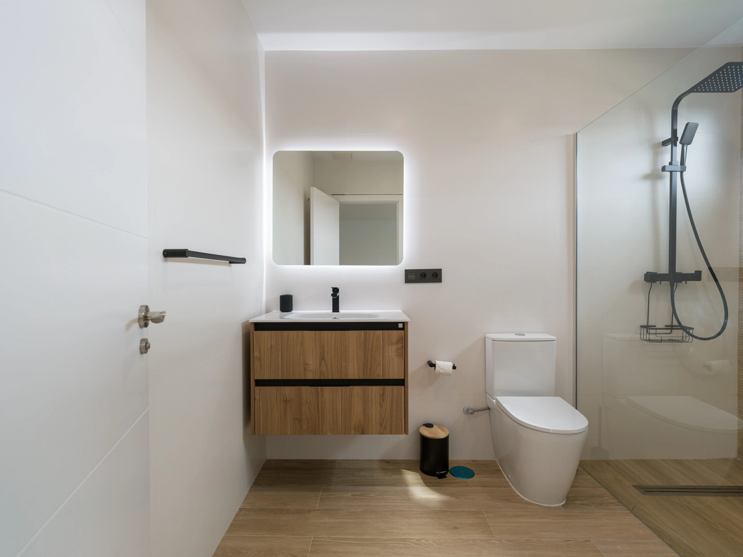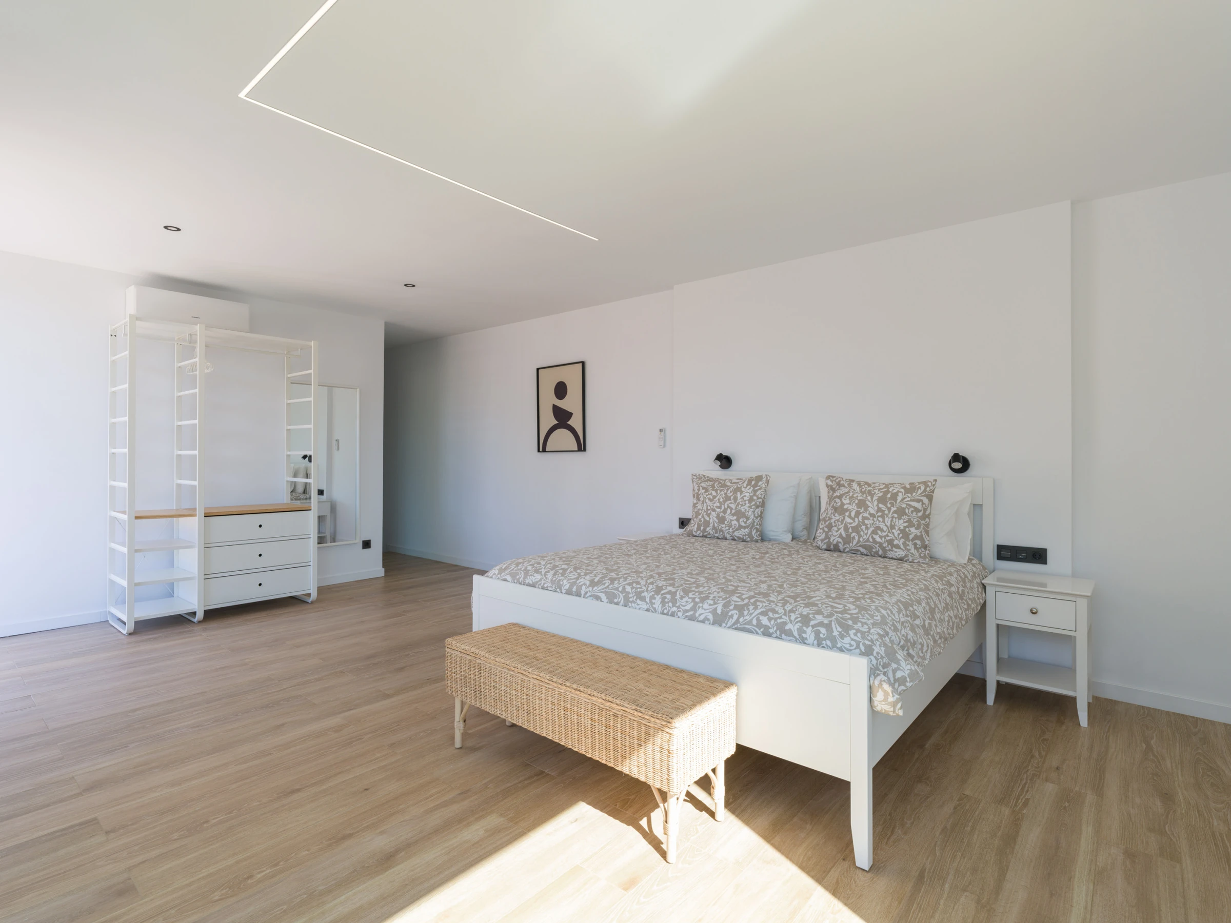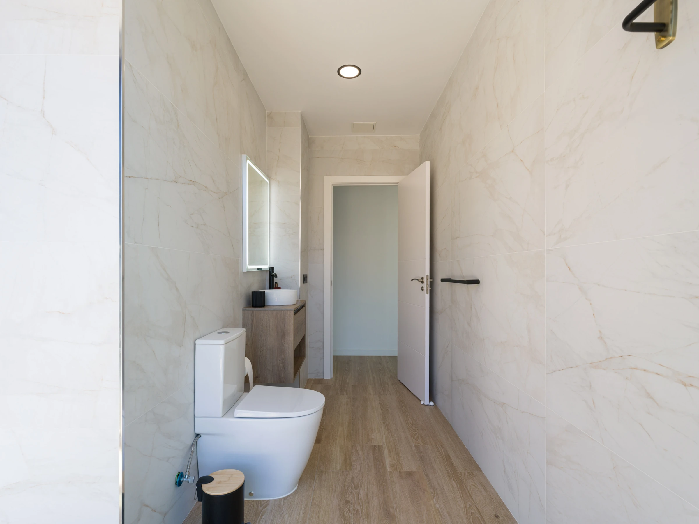 The exterior is one of the great attractions of the villa. The completely fenced perimeter provides privacy and tranquillity, while the outdoor area invites you to enjoy the open air with a heated private pool, sun loungers, outdoor shower, gas barbecue, shaded sofa area and outdoor dining room, ideal for relaxing and taking advantage of the sunny weather throughout the day.