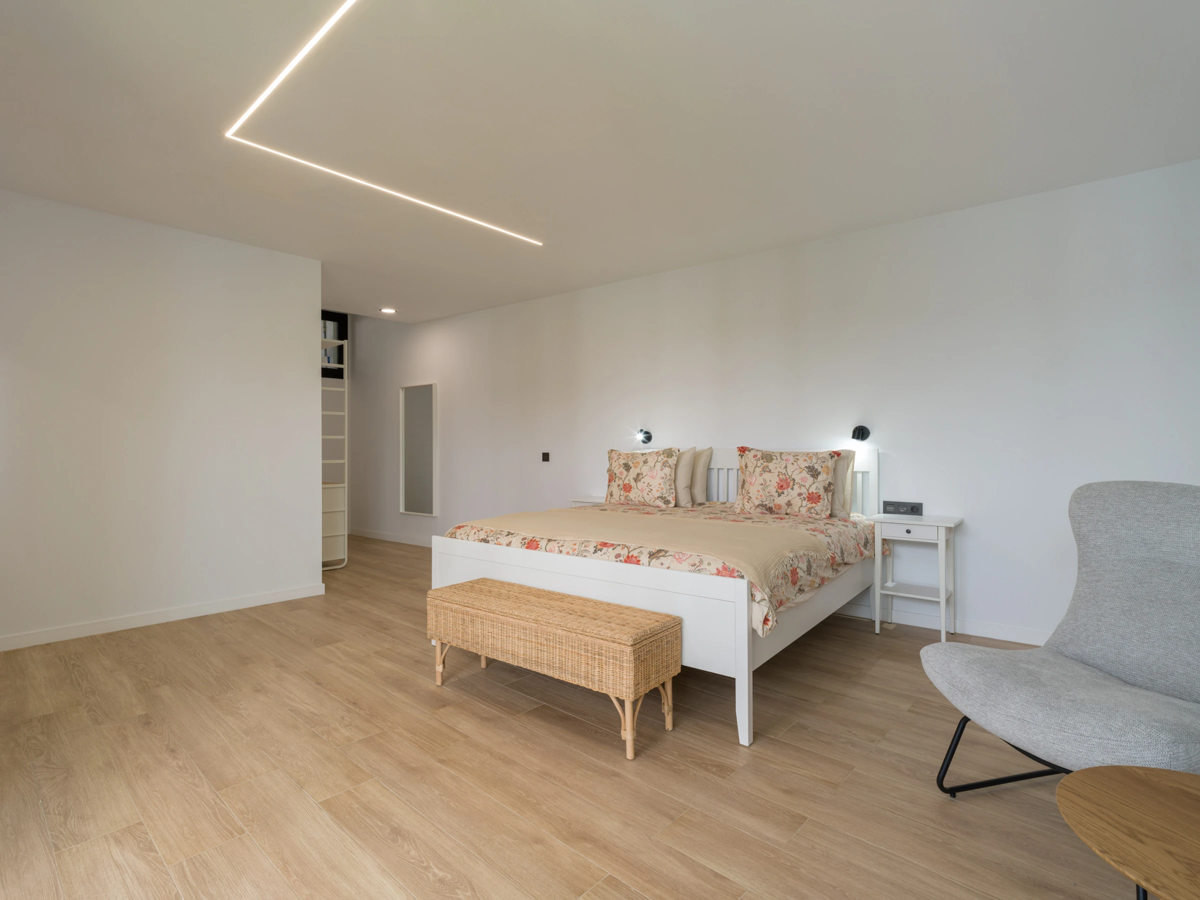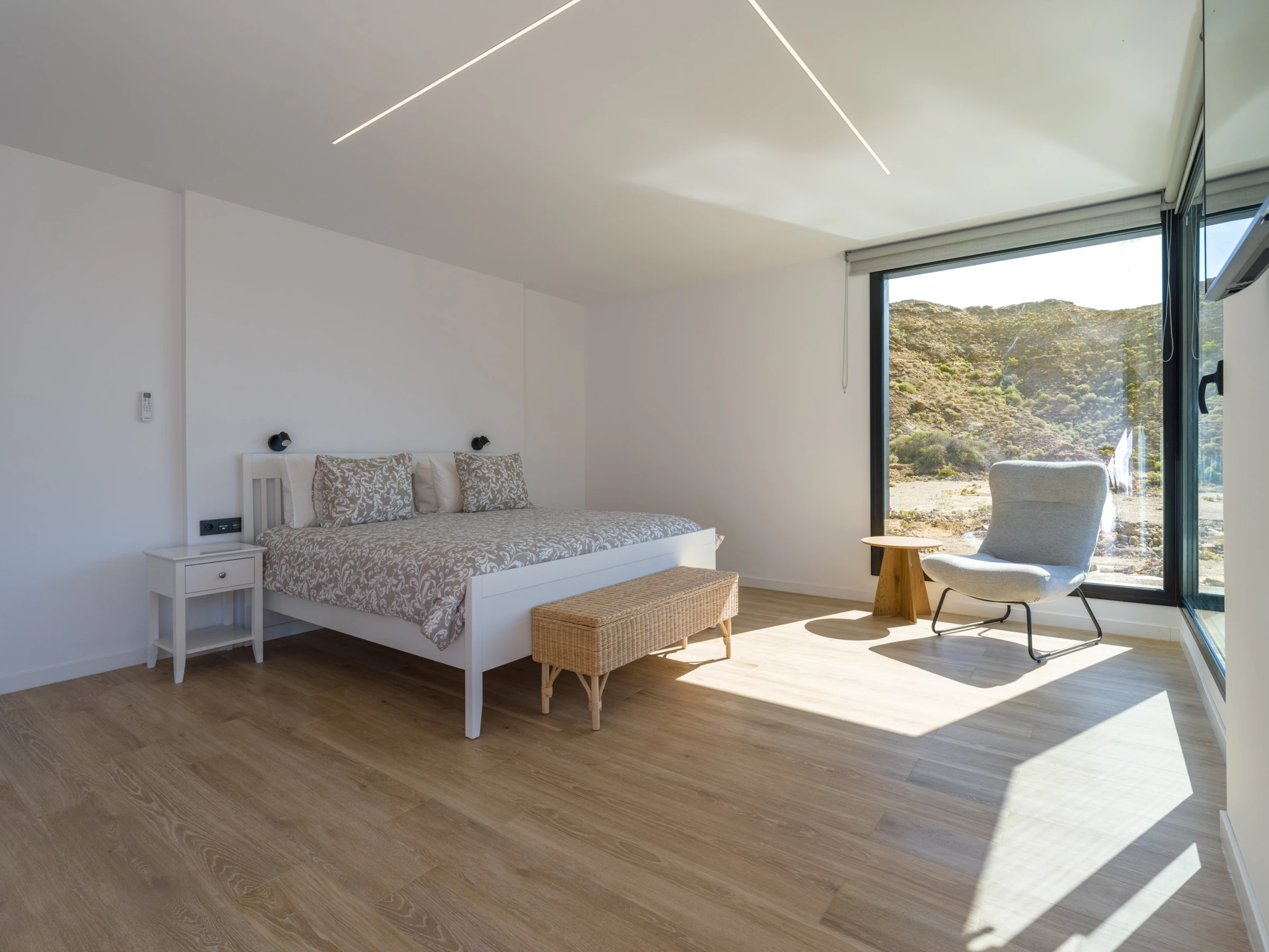 On the upper floor is the large suite, with its own terrace with sun loungers and a bathroom with views.