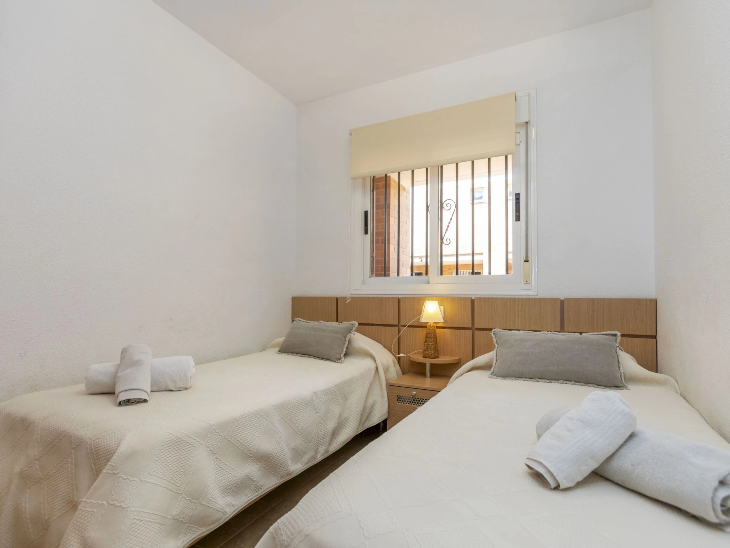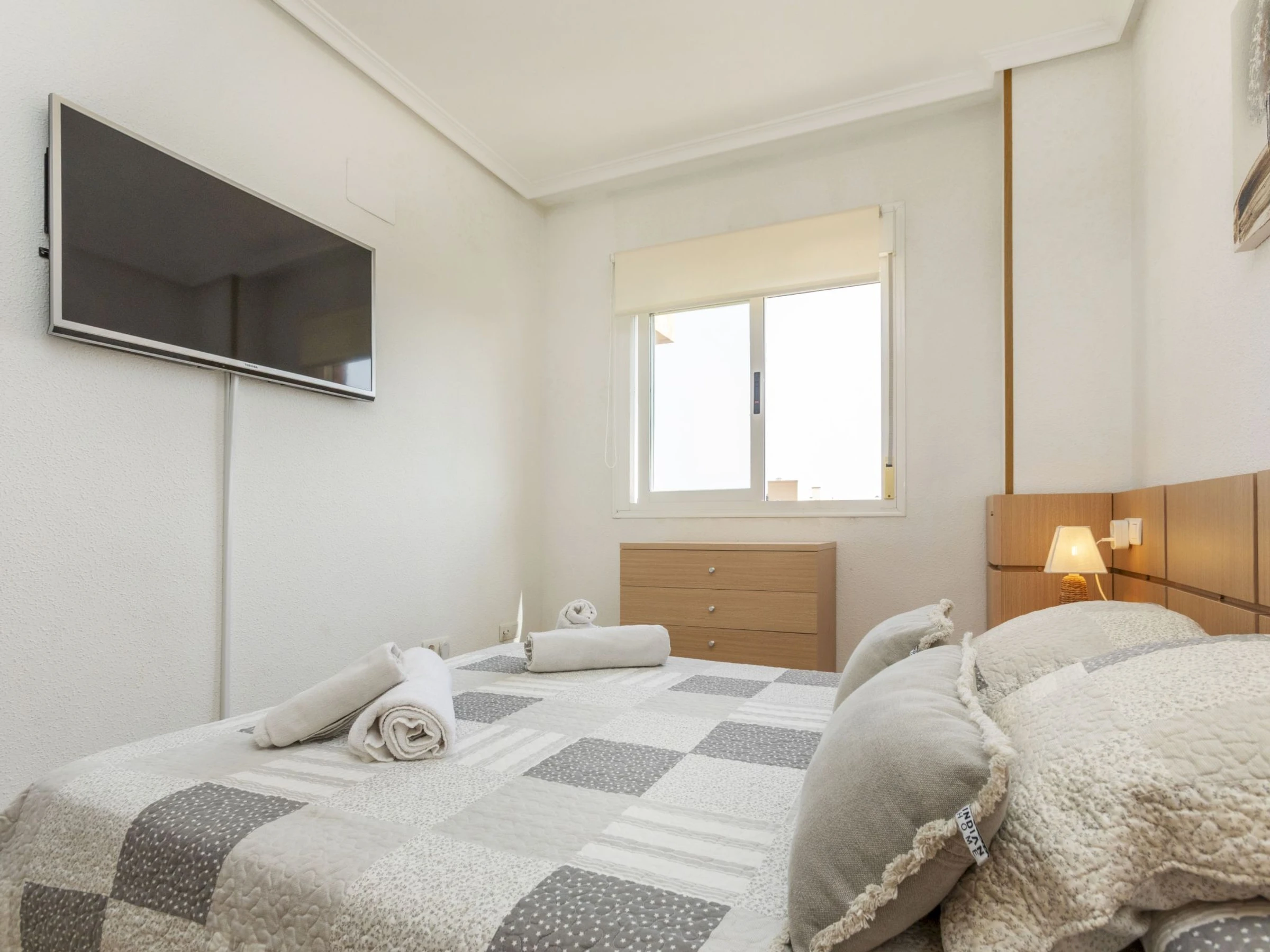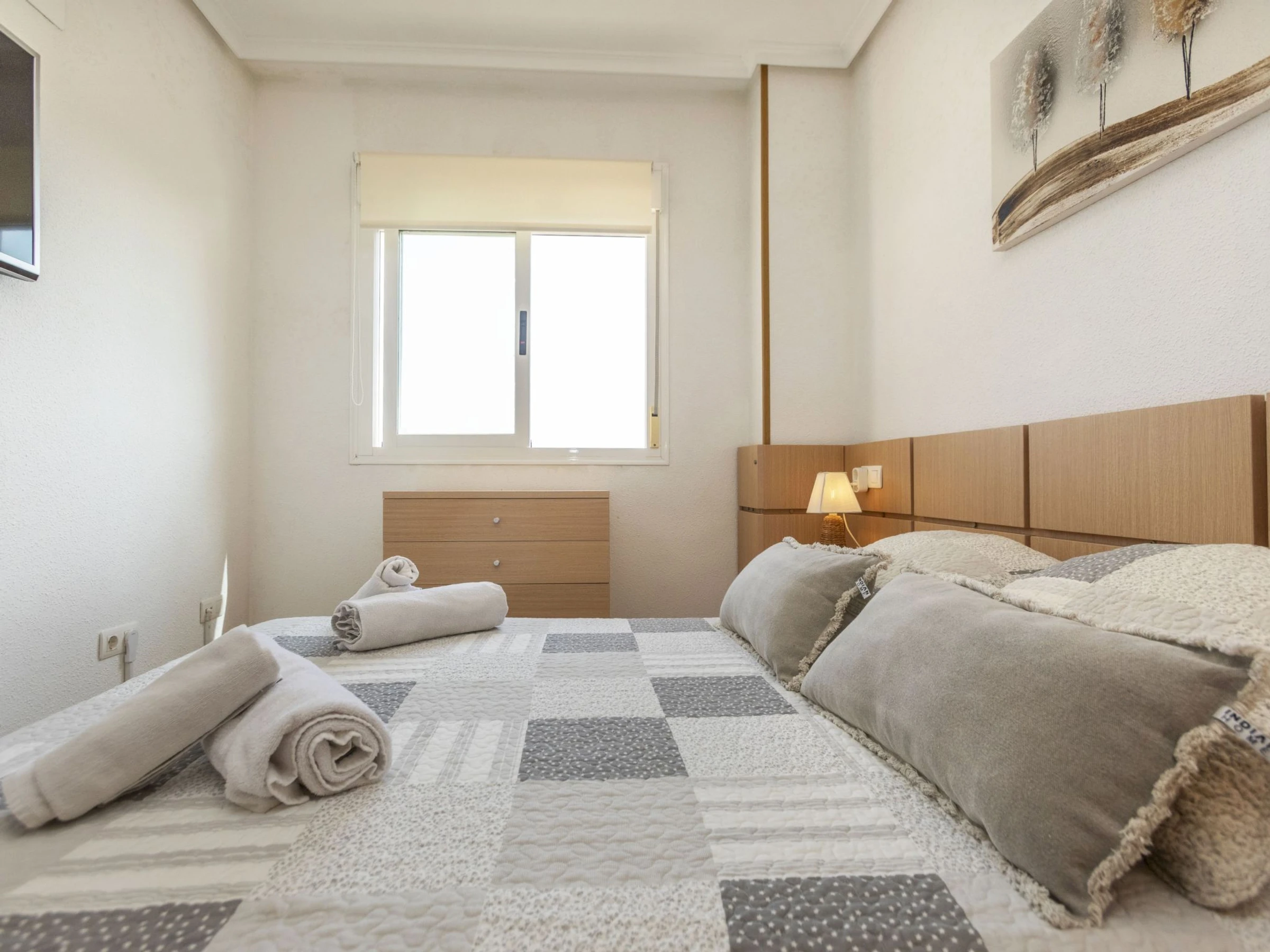 "Edificio Torremar", 3-room apartment 60 m2 on 8th floor. Bright, practical and comfortable furnishings: living/dining room with dining table, digital TV, flat screen, air conditioning and forced-air heating. Exit to the terrace. 1 room with 1 french bed (135 cm, length 190 cm). 1 room with 2 beds (90 cm, length 190 cm). Kitchen (oven, dishwasher, 4 ceramic glass hob hotplates, toaster, microwave, freezer, electric coffee machine, Capsules for coffee machine (Nespresso + filtro)) with hatch. Shower/WC. Boiler (50 litres). Heating not available in all rooms. Terrace. Terrace furniture. Facilities: washing machine, iron, hair dryer. Internet (WiFi, free). Parking space n 336 (roofed) at the house. Please note: maximum 1 small pet/ dog allowed. TV only ES. [hidden] // Reg. Nr.: ESFCTU00001202600058990600000000000000000[hidden]2