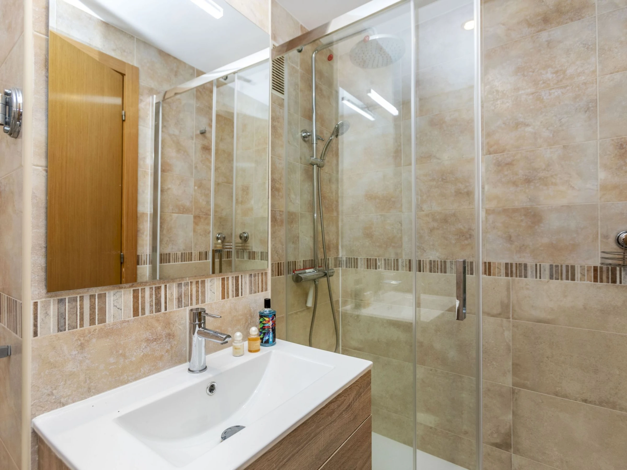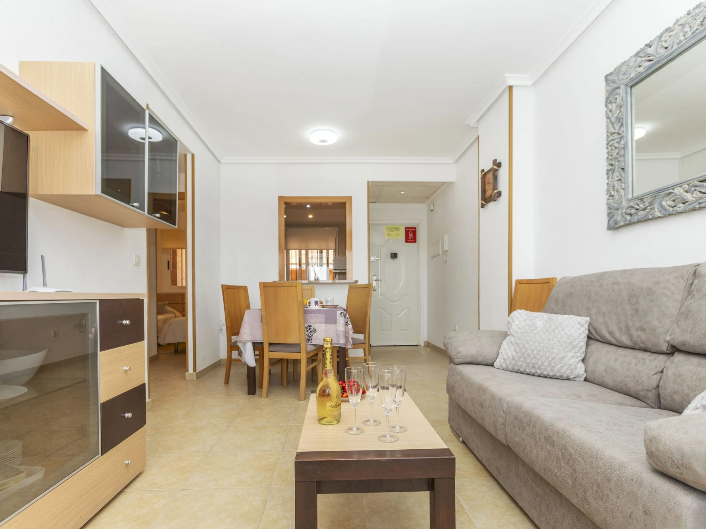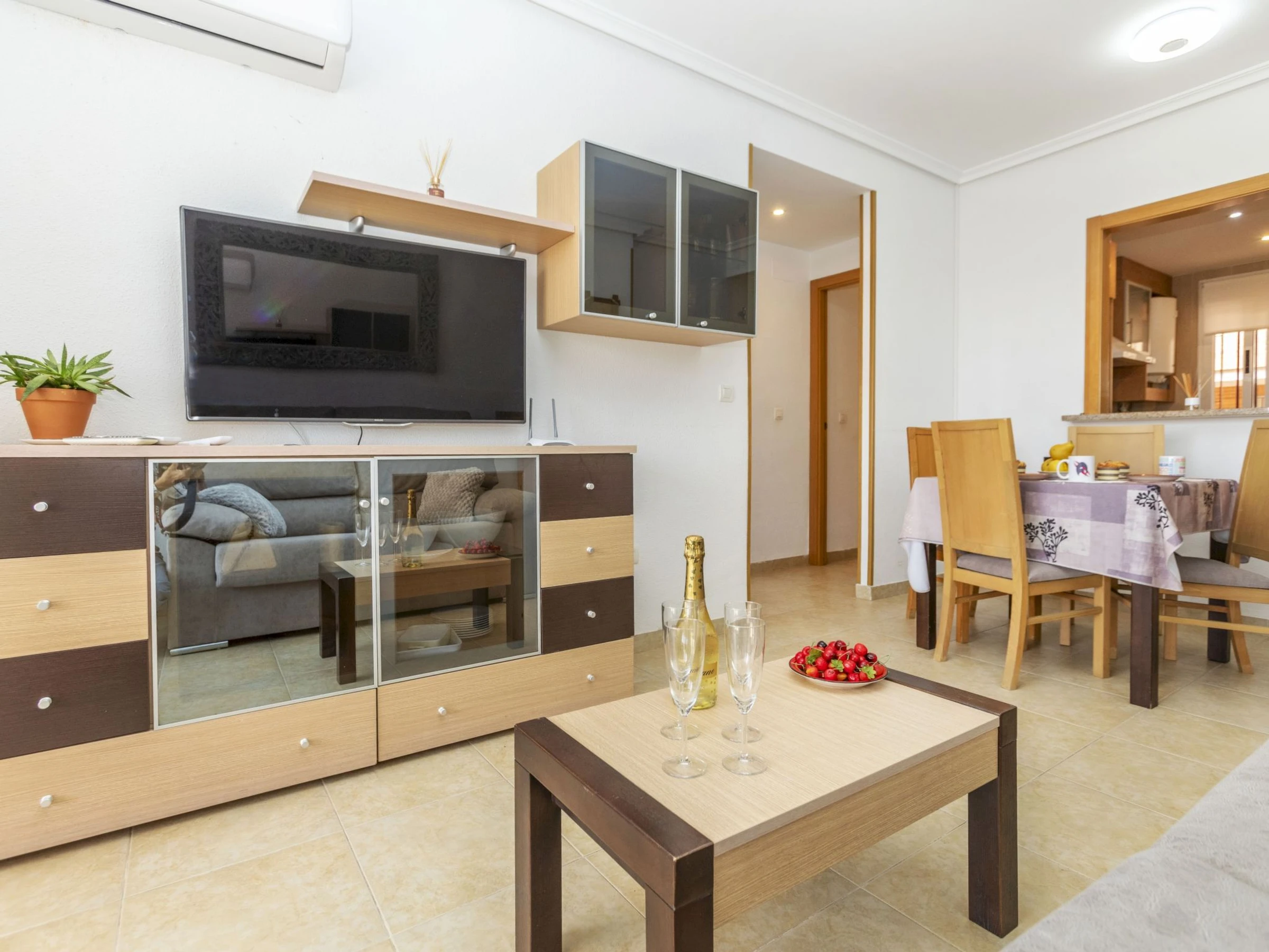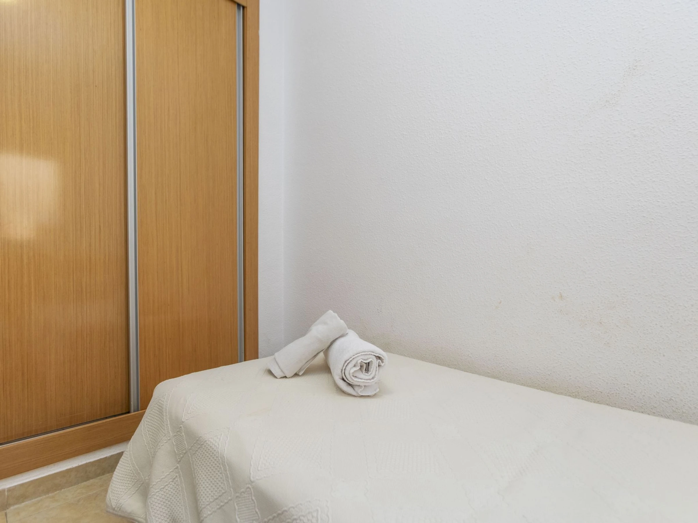 "Edificio Torremar", 3-room apartment 60 m2 on 8th floor. Bright, practical and comfortable furnishings: living/dining room with dining table, digital TV, flat screen, air conditioning and forced-air heating. Exit to the terrace. 1 room with 1 french bed (135 cm, length 190 cm). 1 room with 2 beds (90 cm, length 190 cm). Kitchen (oven, dishwasher, 4 ceramic glass hob hotplates, toaster, microwave, freezer, electric coffee machine, Capsules for coffee machine (Nespresso + filtro)) with hatch. Shower/WC. Boiler (50 litres). Heating not available in all rooms. Terrace. Terrace furniture. Facilities: washing machine, iron, hair dryer. Internet (WiFi, free). Parking space n 336 (roofed) at the house. Please note: maximum 1 small pet/ dog allowed. TV only ES. [hidden] // Reg. Nr.: ESFCTU00001202600058990600000000000000000[hidden]2