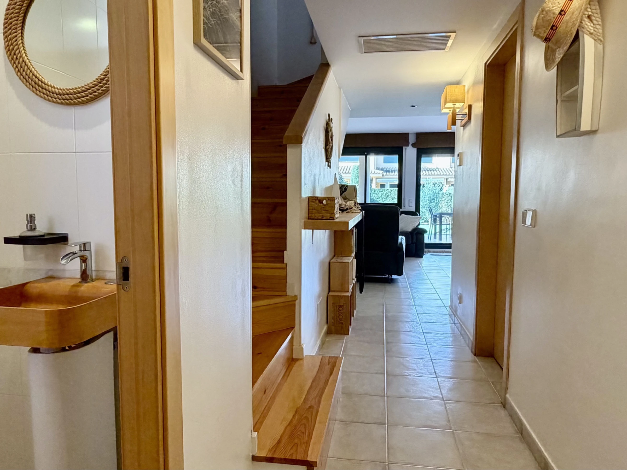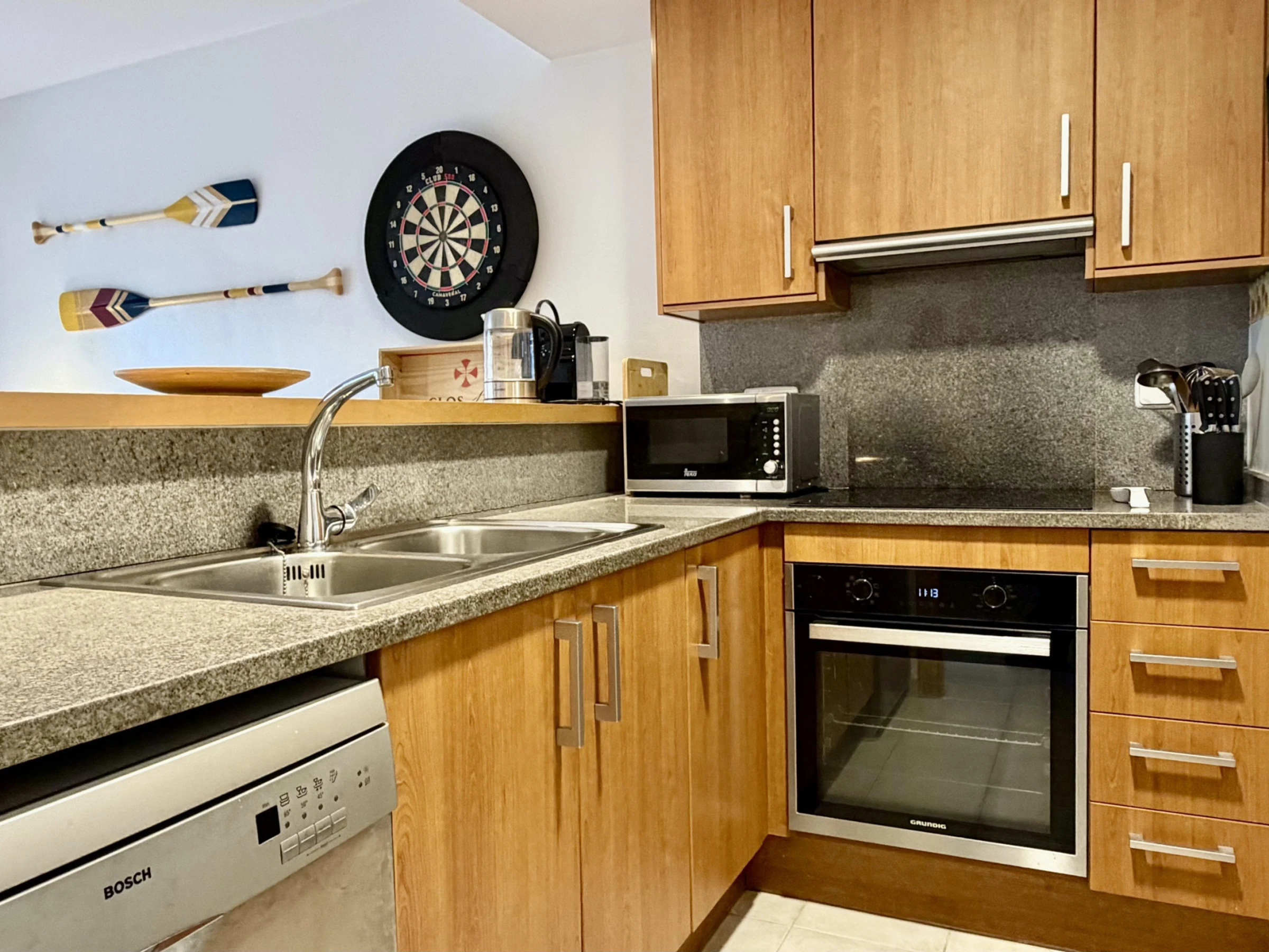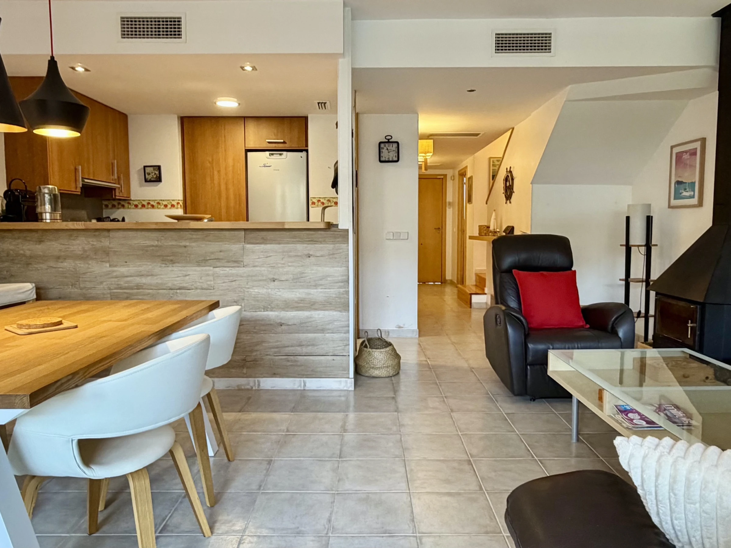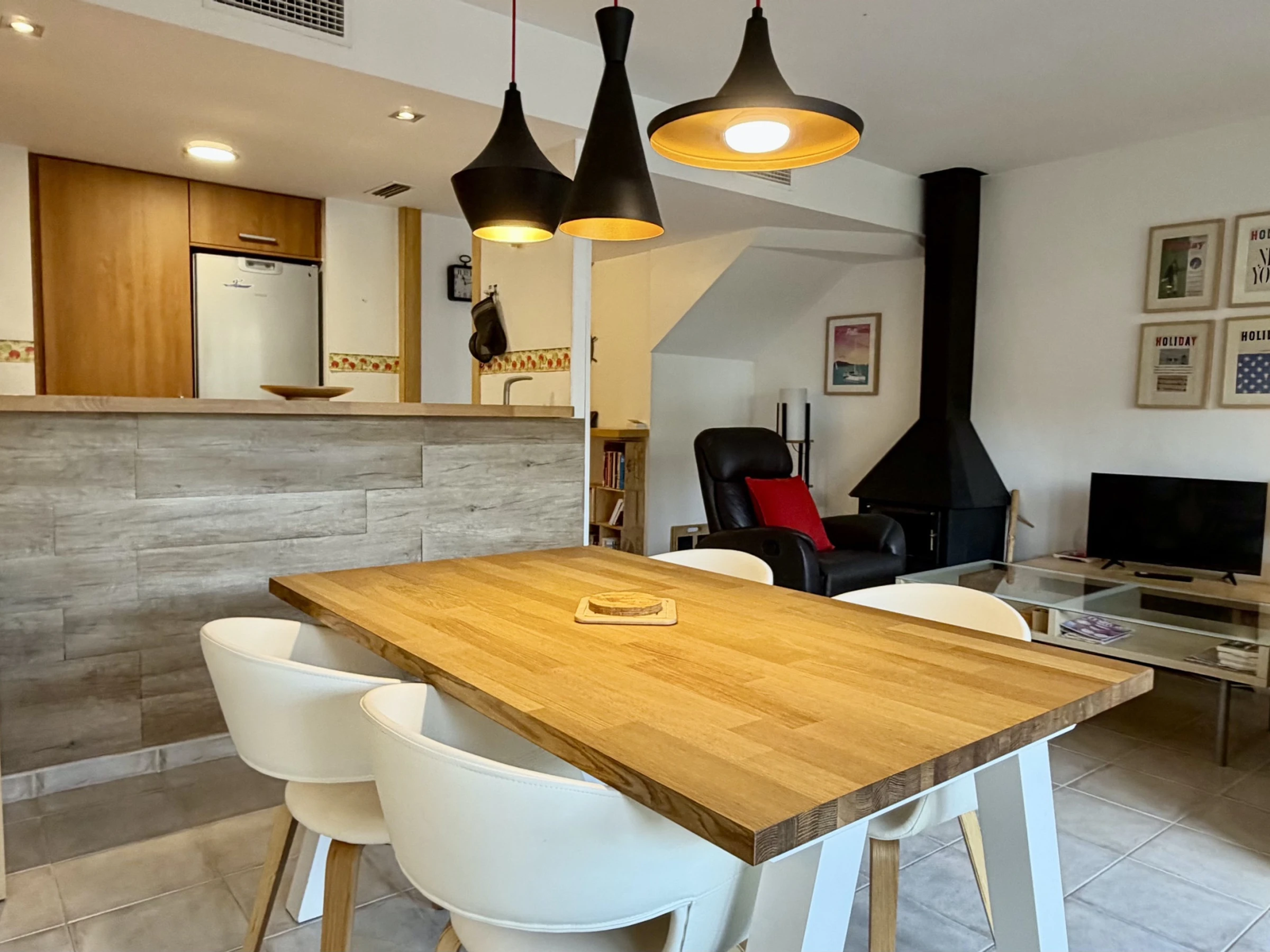 The interior stands out for its functionality and comfort. The American kitchen is fully equipped with state-of-the-art appliances, including fridge, oven, microwave, dishwasher and coffee machine. Additionally, it has a fireplace for cooler nights, iron and two televisions for family entertainment. It does NOT have a washing machine.