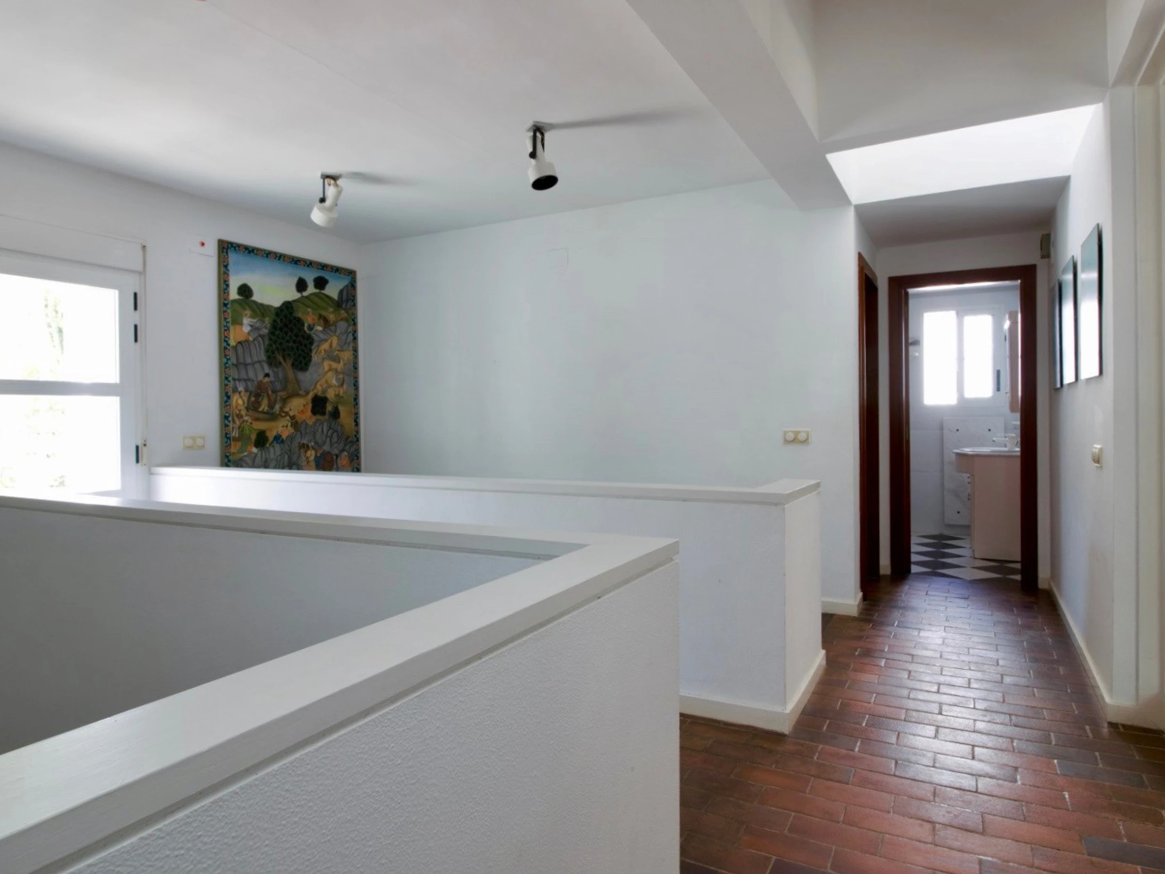 Spacious and beautiful modern-style estate on a fenced plot of 4,000m2 in a quiet location within the Montgó Natural Park. Large wooded garden with a variety of plants, palm trees, and lawn. Covered barbecue with cooking possibility. 14x5m swimming pool with Roman steps and diving board. From the house entrance, access is provided to the upper floor on one side, where you'll find a double bedroom (1.50m bed) with sea views and a bathroom with shower. A living room with TV/SAT and fireplace with access to the back garden.