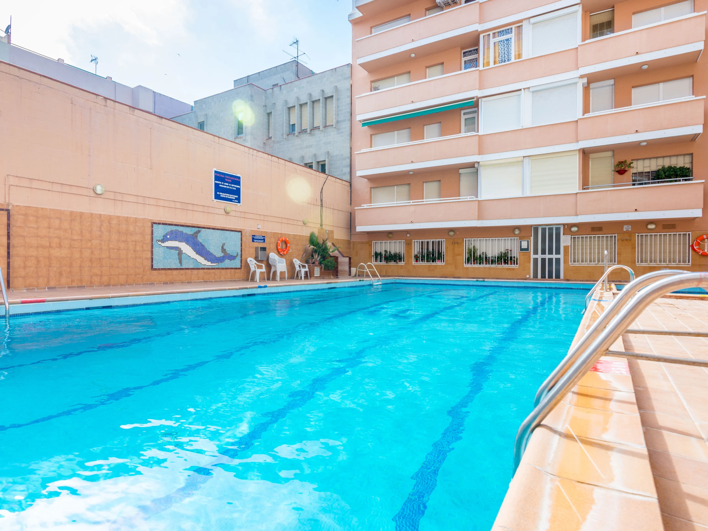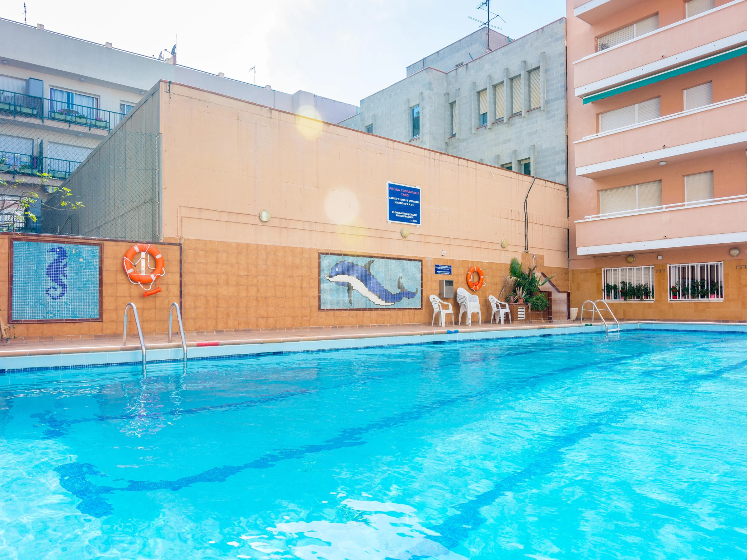 The accommodation is equipped with the following items: lift, washing machine, iron, internet (Wi-Fi), hair dryer, balcony, single boiler on gas, air conditioning in the living room, swimming pool communal+children's, 1 fan, 1 TV.