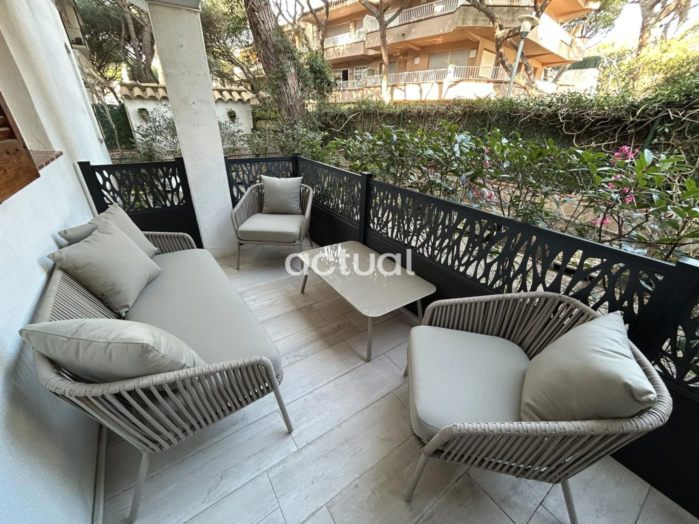 Apartment located in the Voramar complex about 50 m from the beach and approximately 100 m from the center of Playa de Aro. Ground floor, consisting of 2 bedrooms, one with a 160 cm double bed, shower, and WC, and 1 bedroom with 2 separate beds plus a bathroom with shower and WC, living-dining room with access to the porch and private garden. Communal pool. Parking included. Air conditioning. NO PETS ALLOWED. WiFi.