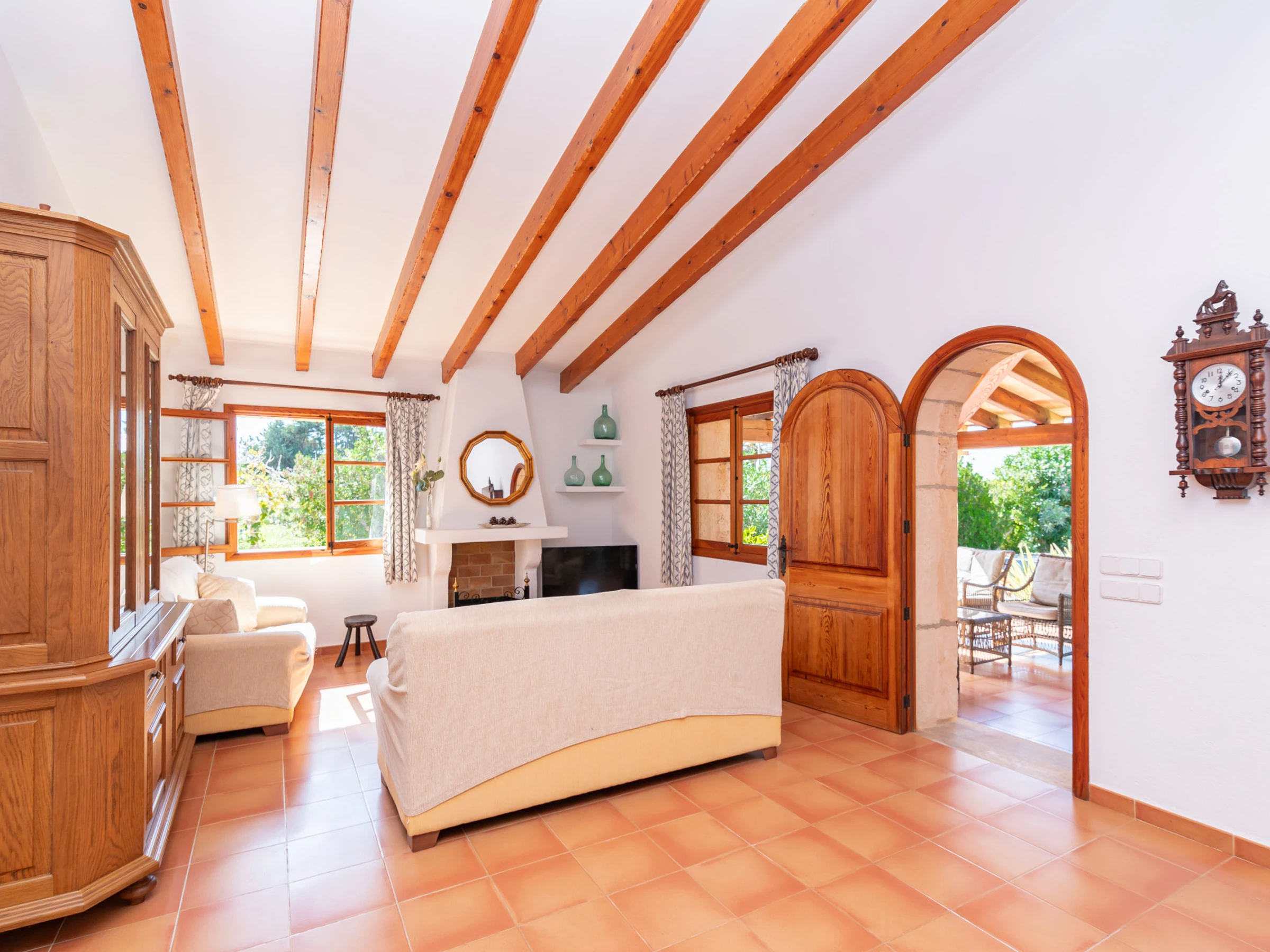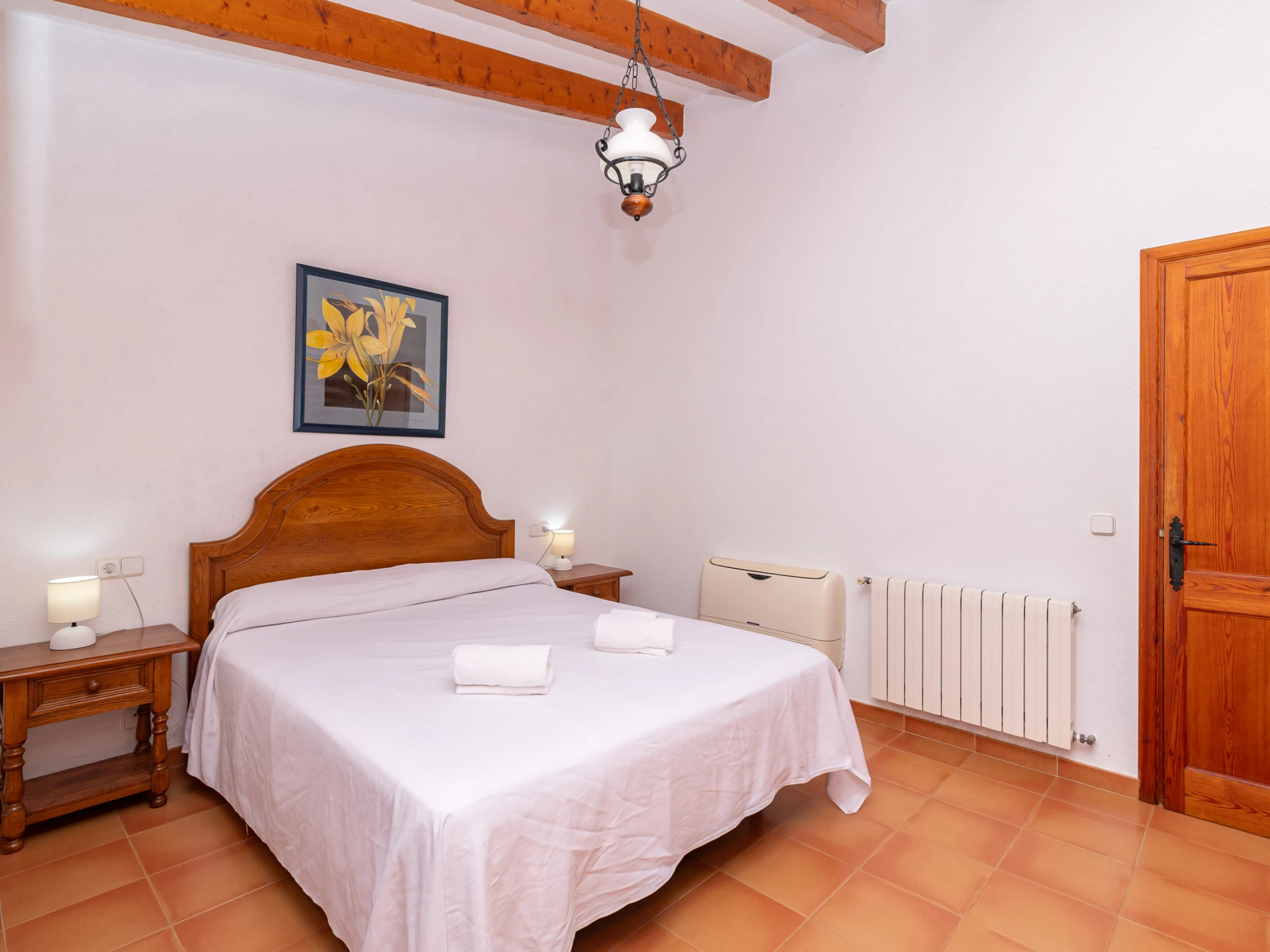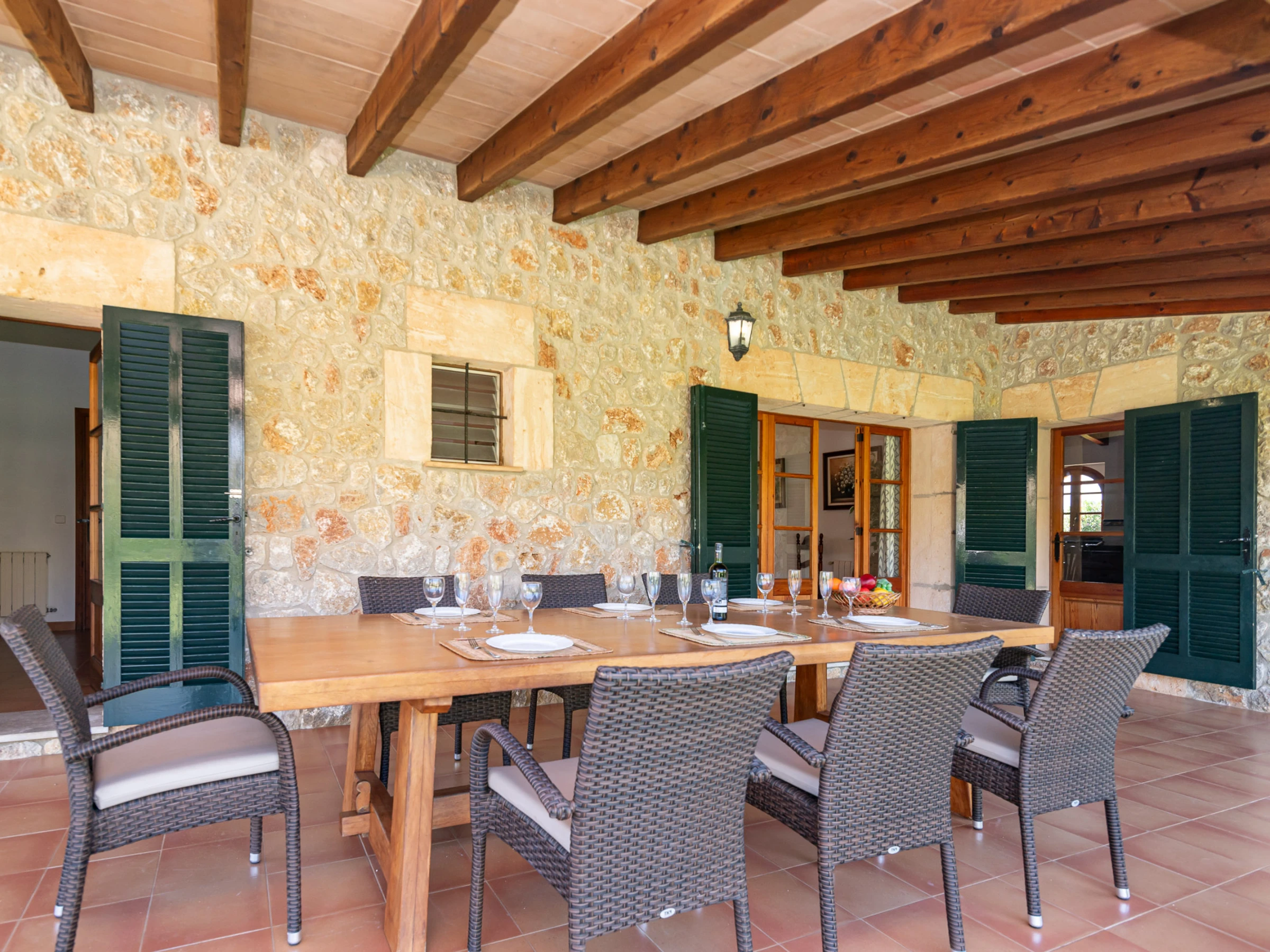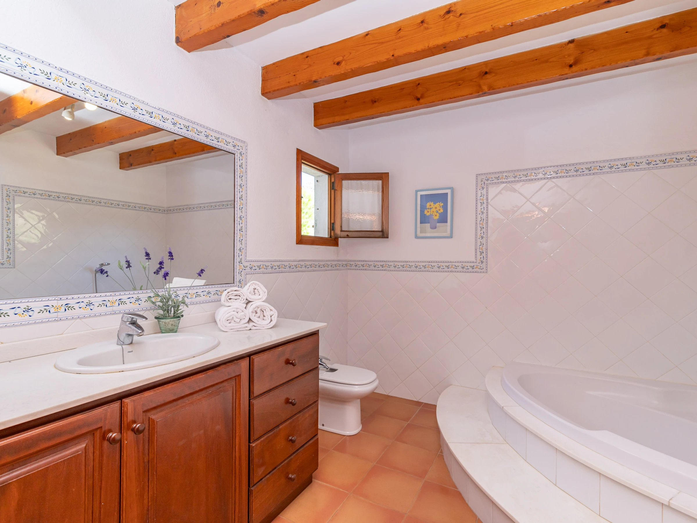 The villa combines the rustic atmosphere of Mallorcan farmhouses with modern amenities. Distributed on a single floor, it has a living-dining room with wooden beams, three bedrooms with built-in wardrobes and two bathrooms, one of them with an elevated oval bathtub. The fully equipped kitchen allows for preparing meals during the stay.