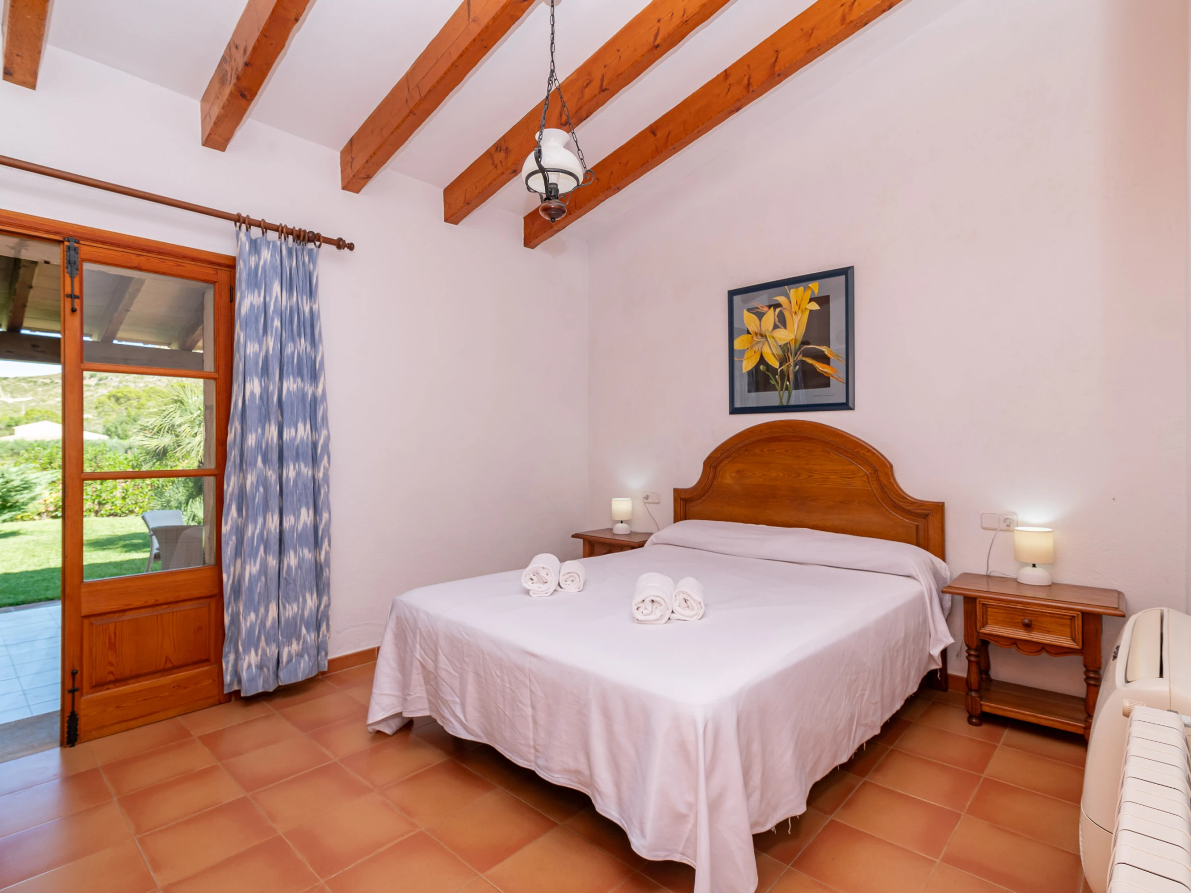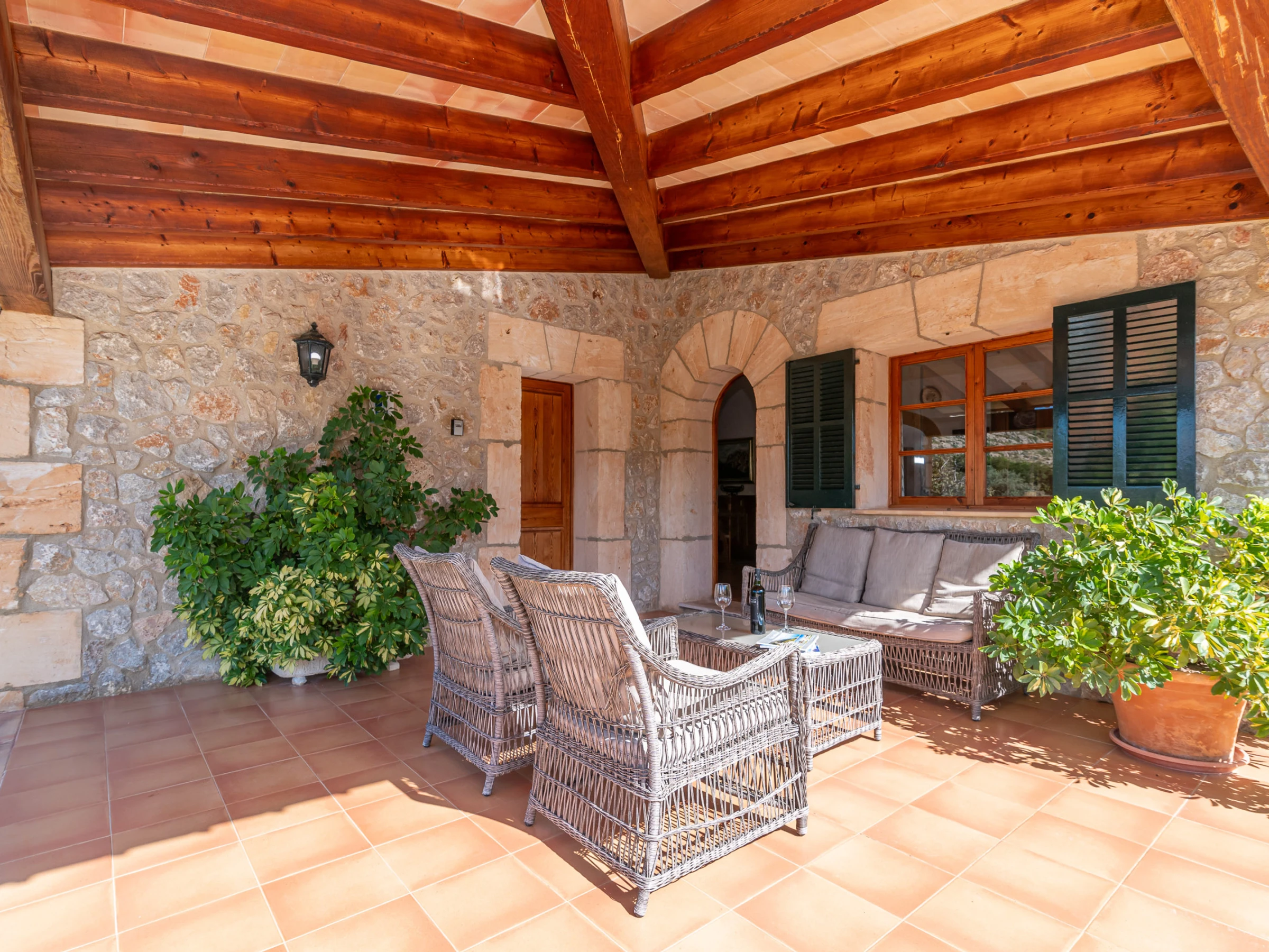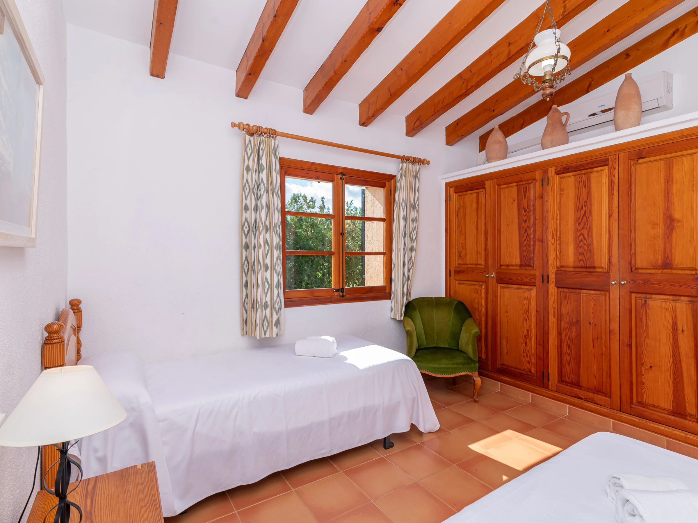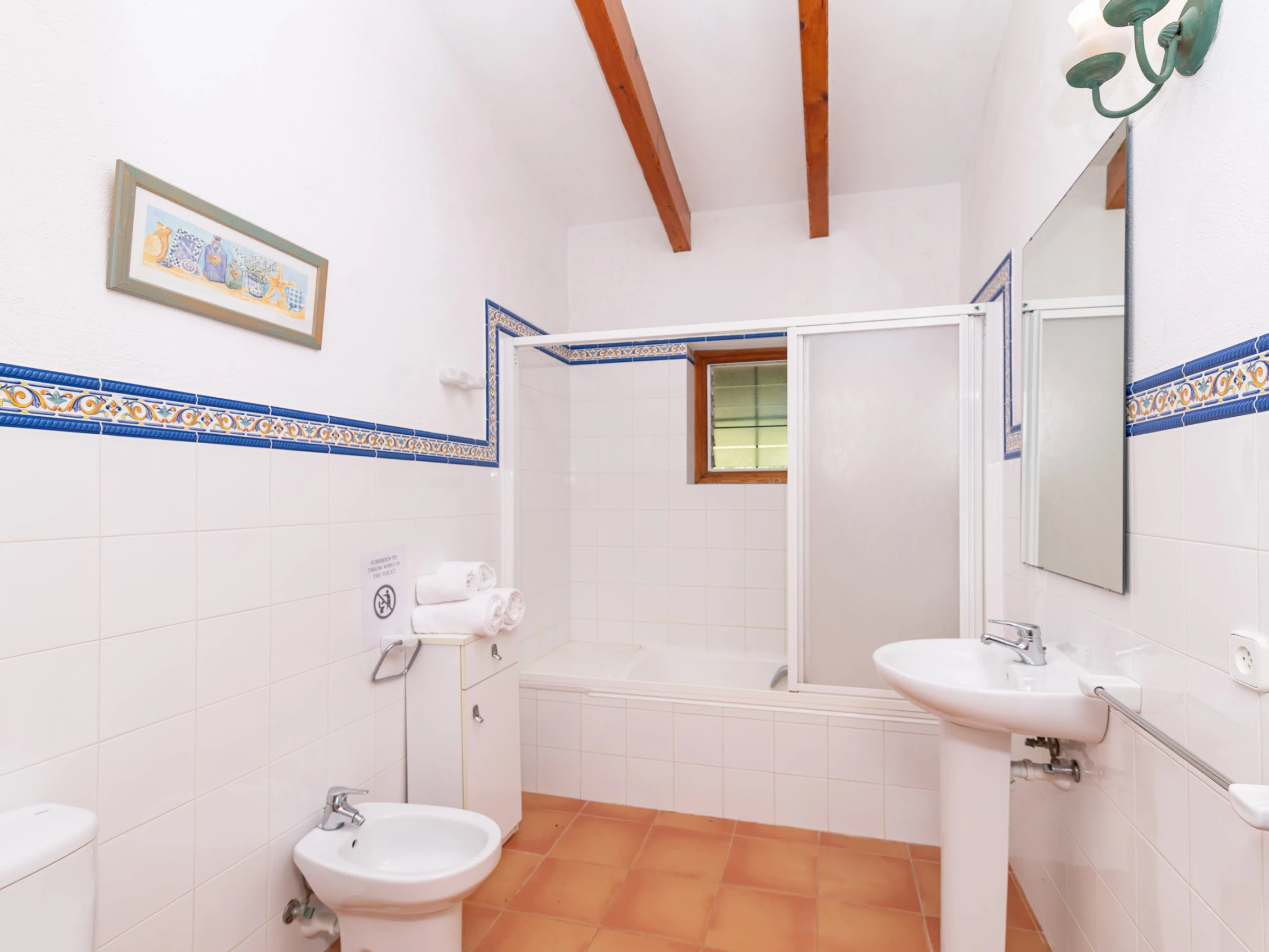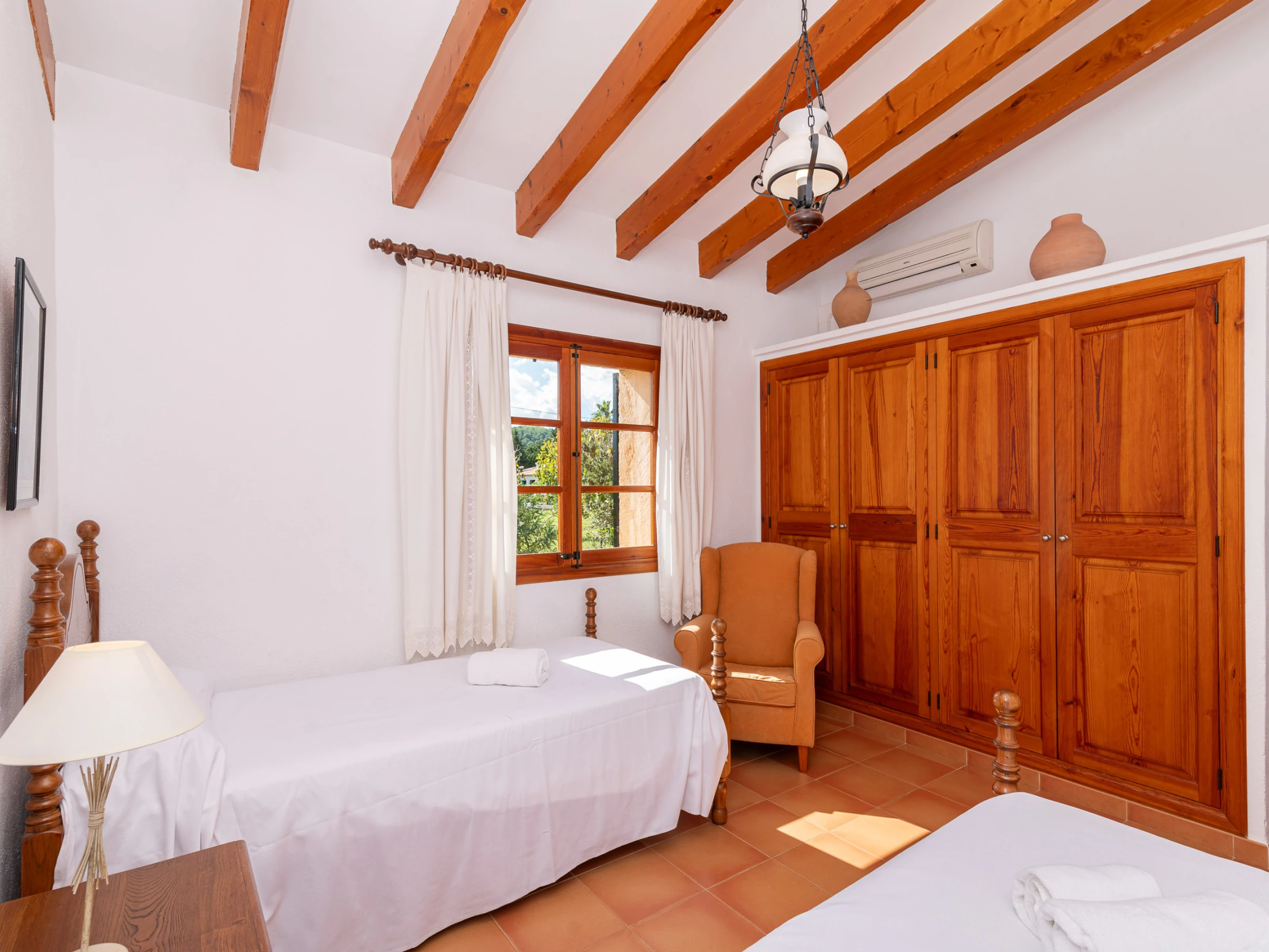 The villa combines the rustic atmosphere of Mallorcan farmhouses with modern amenities. Distributed on a single floor, it has a living-dining room with wooden beams, three bedrooms with built-in wardrobes and two bathrooms, one of them with an elevated oval bathtub. The fully equipped kitchen allows for preparing meals during the stay.