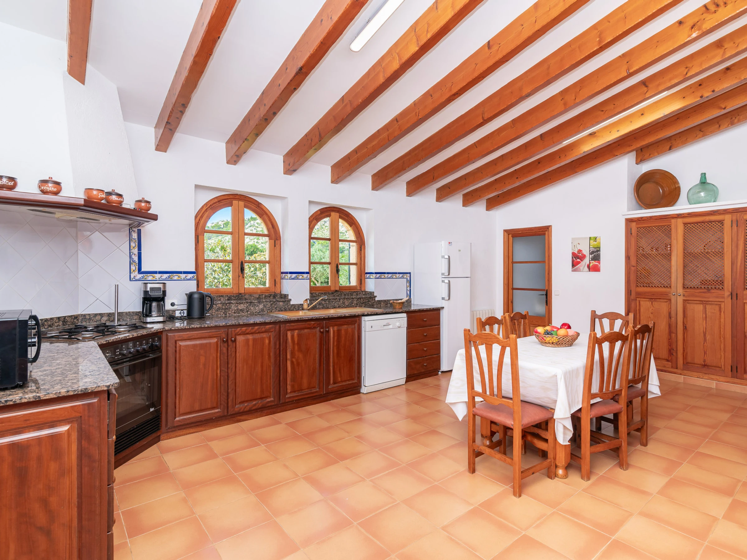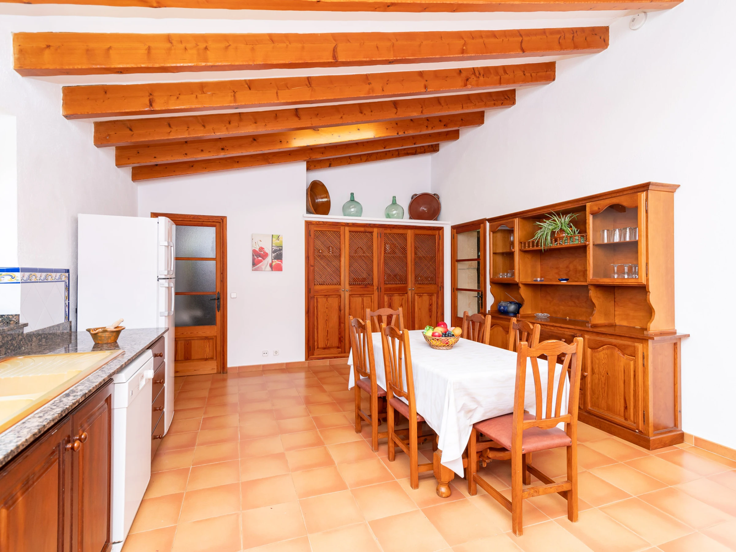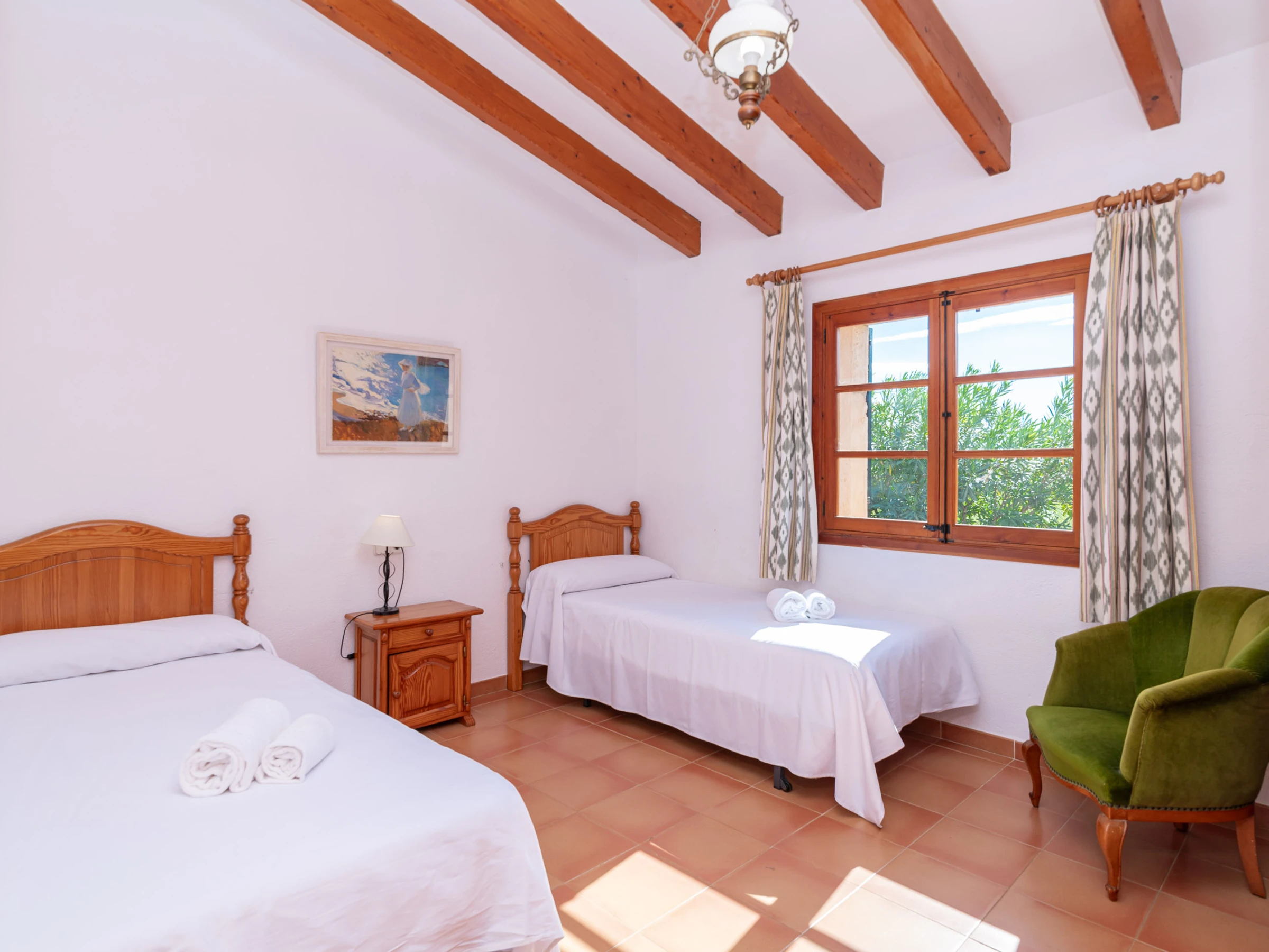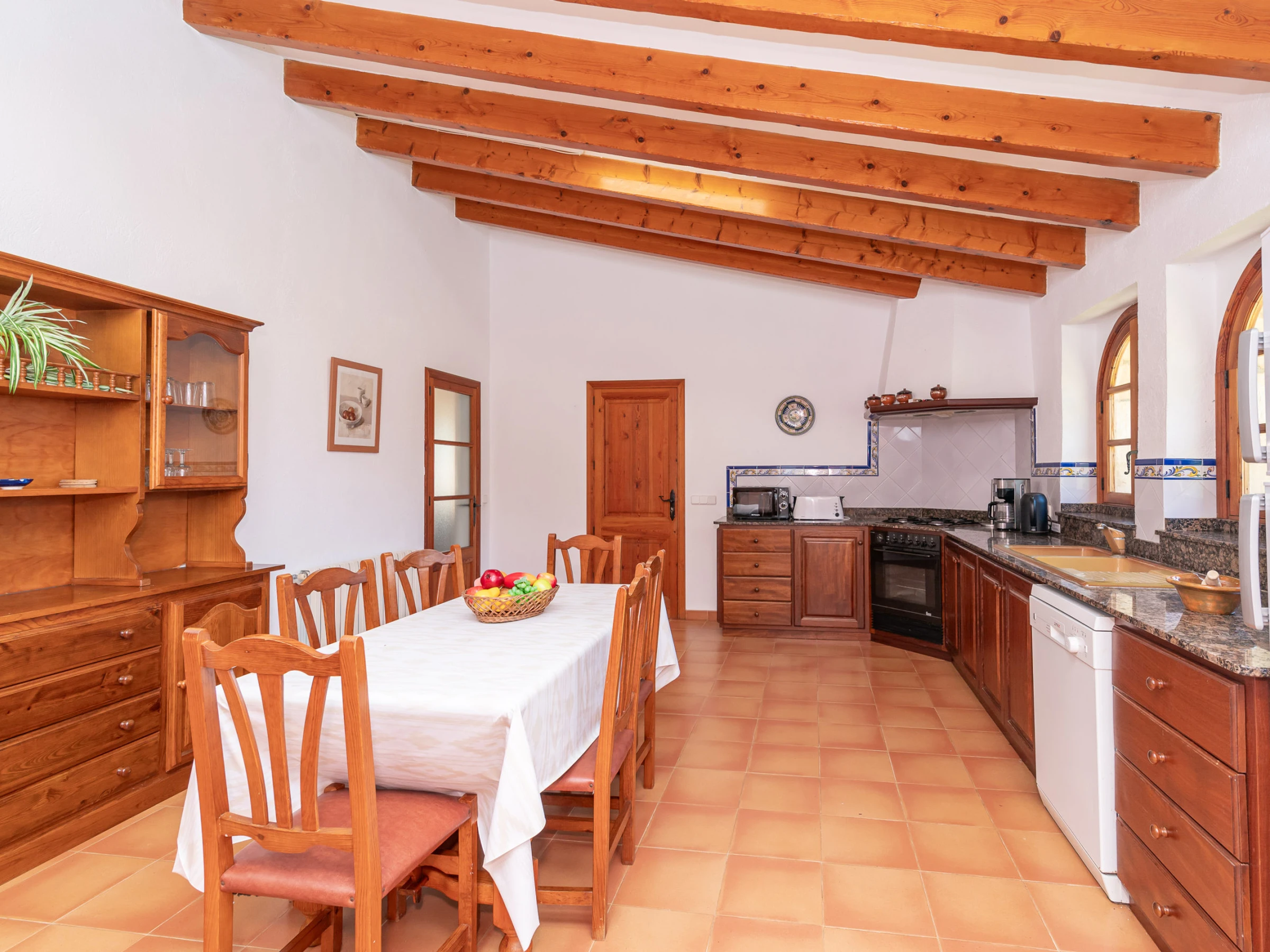 The villa combines the rustic atmosphere of Mallorcan farmhouses with modern amenities. Distributed on a single floor, it has a living-dining room with wooden beams, three bedrooms with built-in wardrobes and two bathrooms, one of them with an elevated oval bathtub. The fully equipped kitchen allows for preparing meals during the stay.