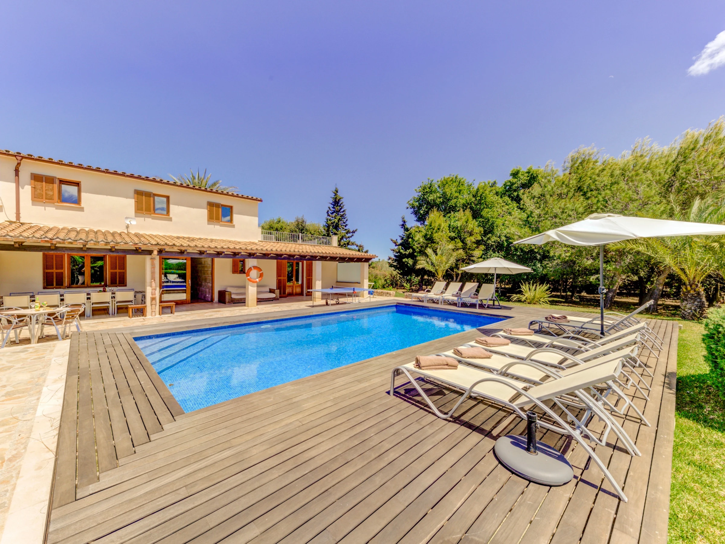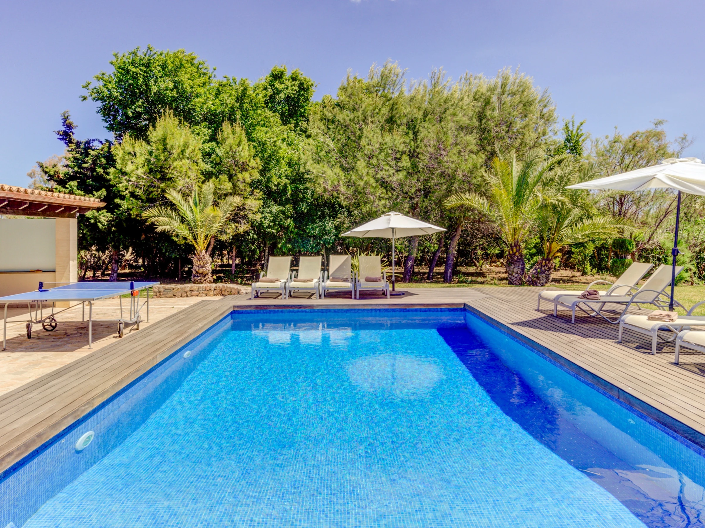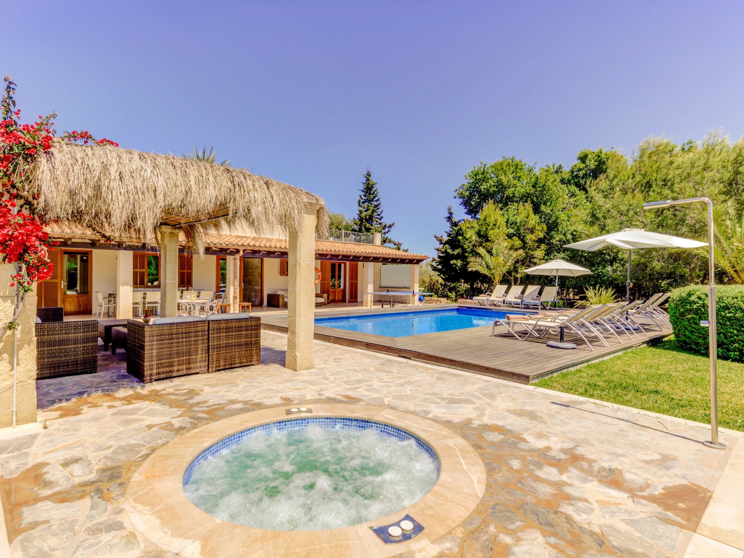 Outside, the well-maintained gardens stand out, with lawn areas next to the pool and a covered pergola with comfortable furniture for relaxing after a swim. There is also a jacuzzi (cold water) next to the pool, a terrace with a ping-pong table, and a barbecue, perfect for outdoor dinners while enjoying the landscape.