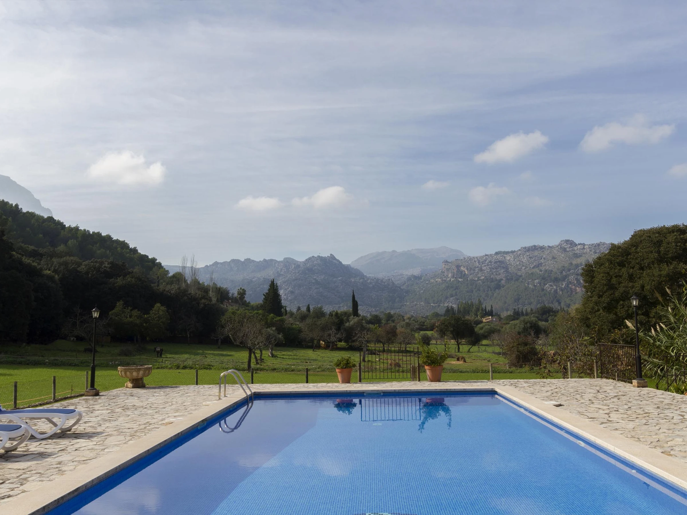The exterior of the property is very spacious, highlighting the large covered terrace, an ideal place to enjoy meals with family and friends or to relax in the shade during the sunniest hours. The views from the terrace and the large swimming pool are spectacular, the setting bucolic, with the mountains of the Sierra de Tramontana in the background and a leafy holm oak grove right at the foot of the garden.