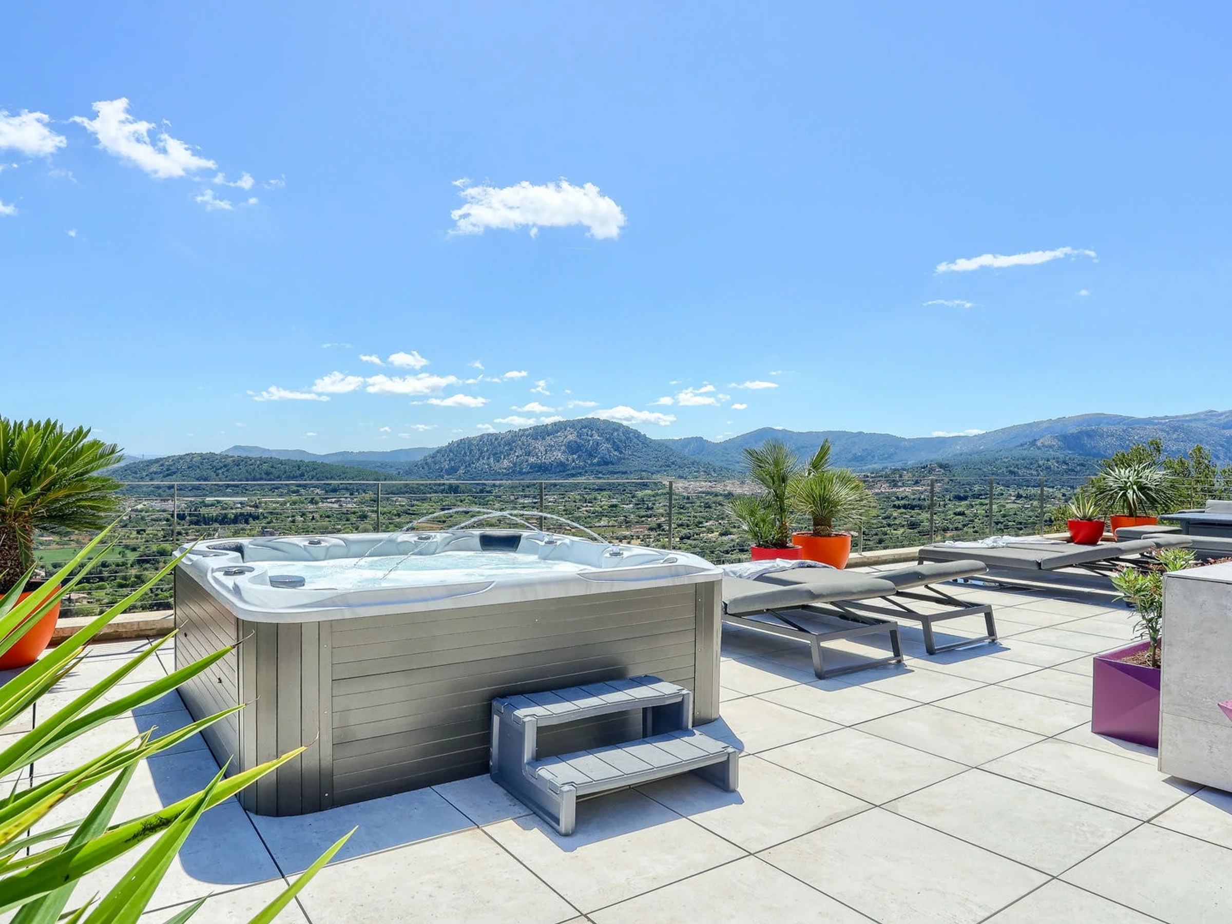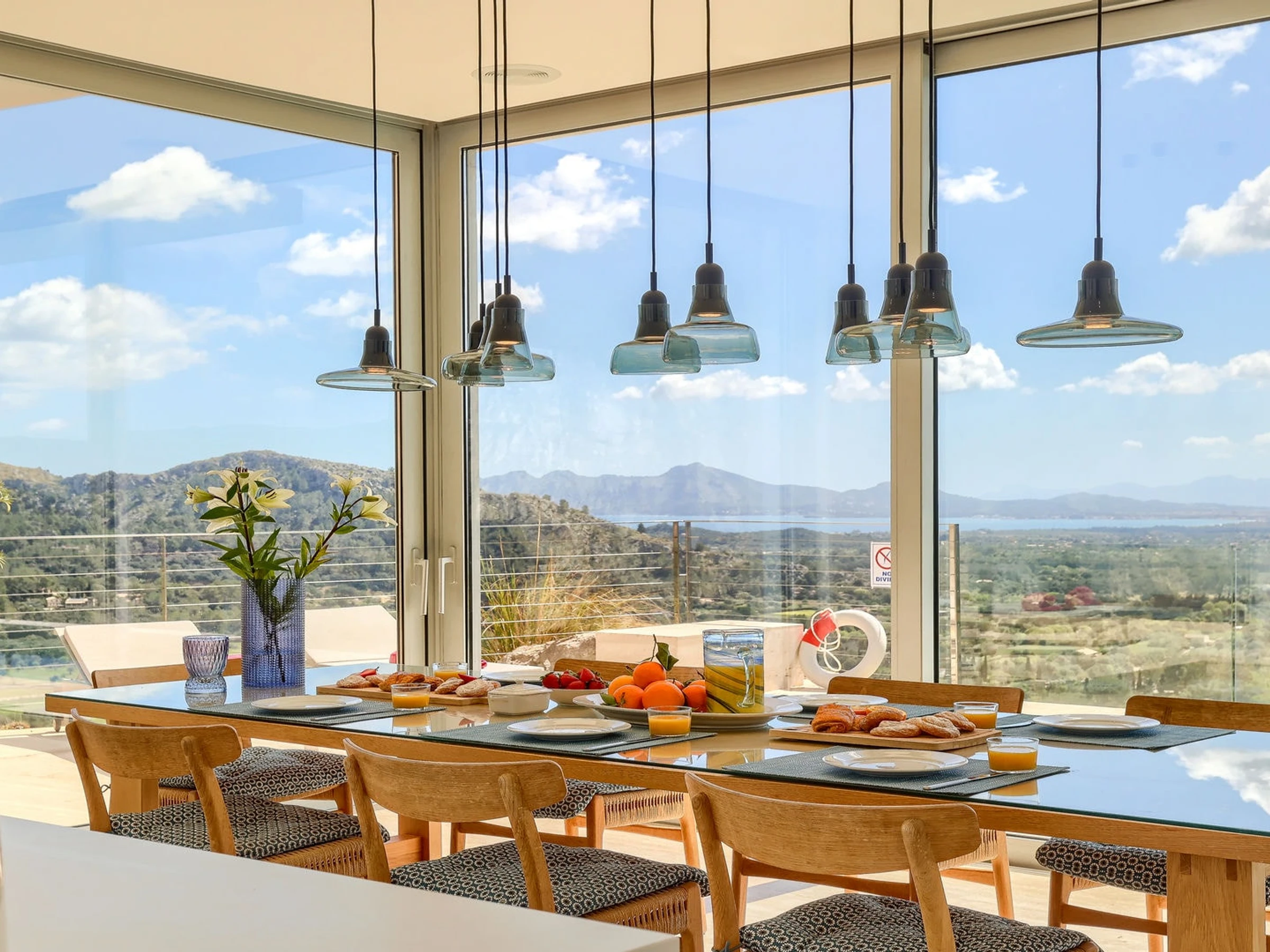 The luxury holiday villa has a huge amount of natural light and 360 degree views of the nearby beaches at Cala San Vicente, Puerto Pollensa and of Pollensa town.