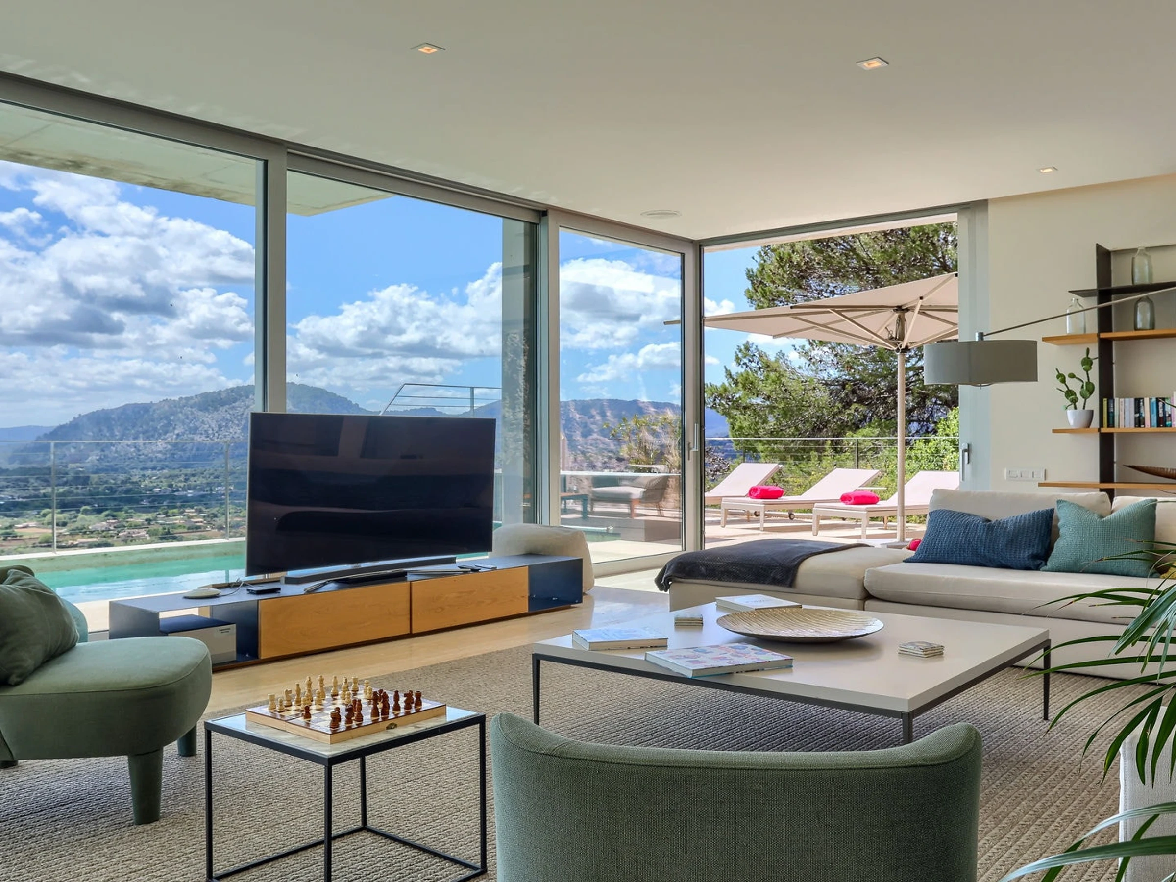 Sliding doors open to the pool and surrounding terrace with Bluetooth speakers and sun loungers