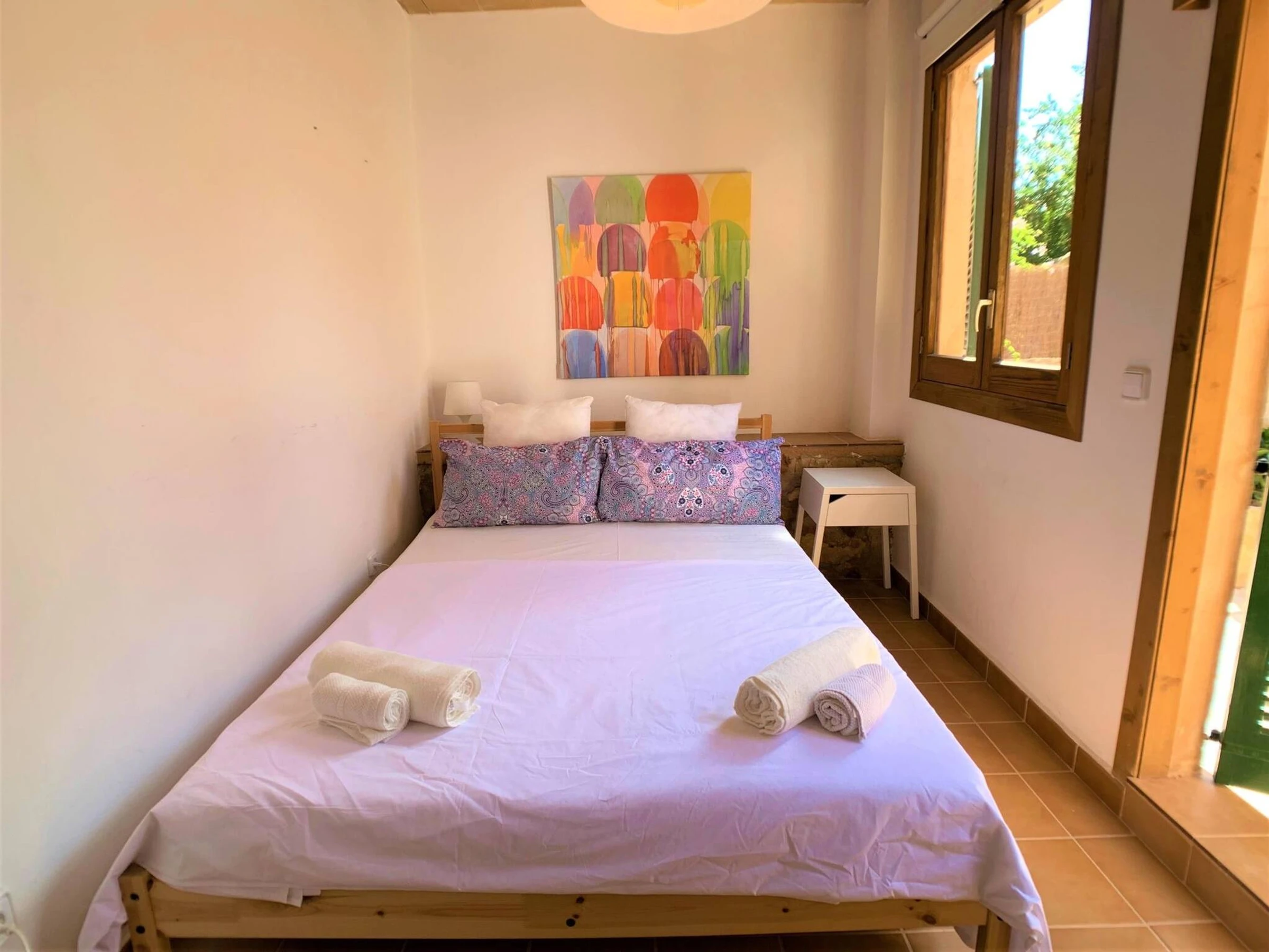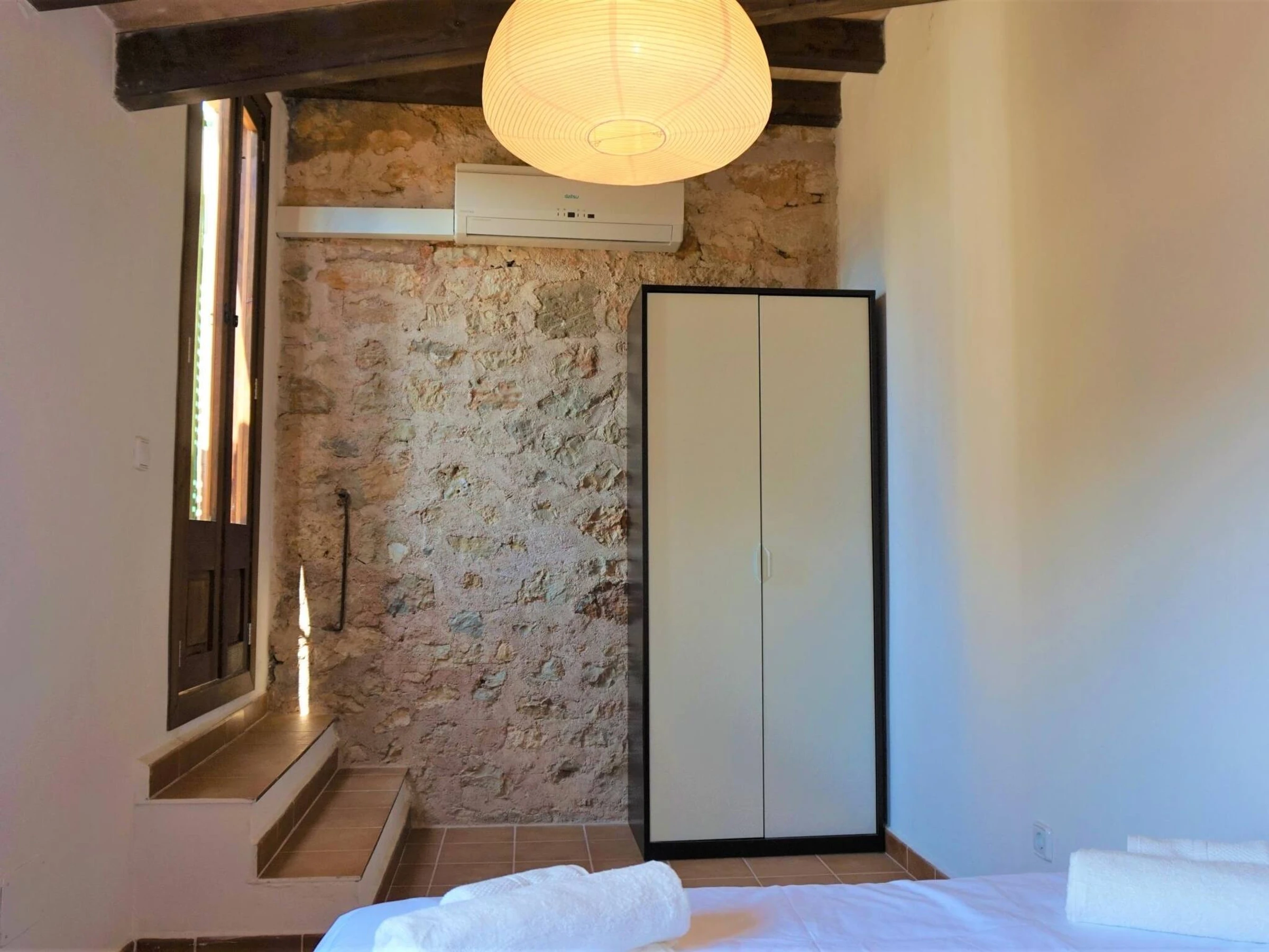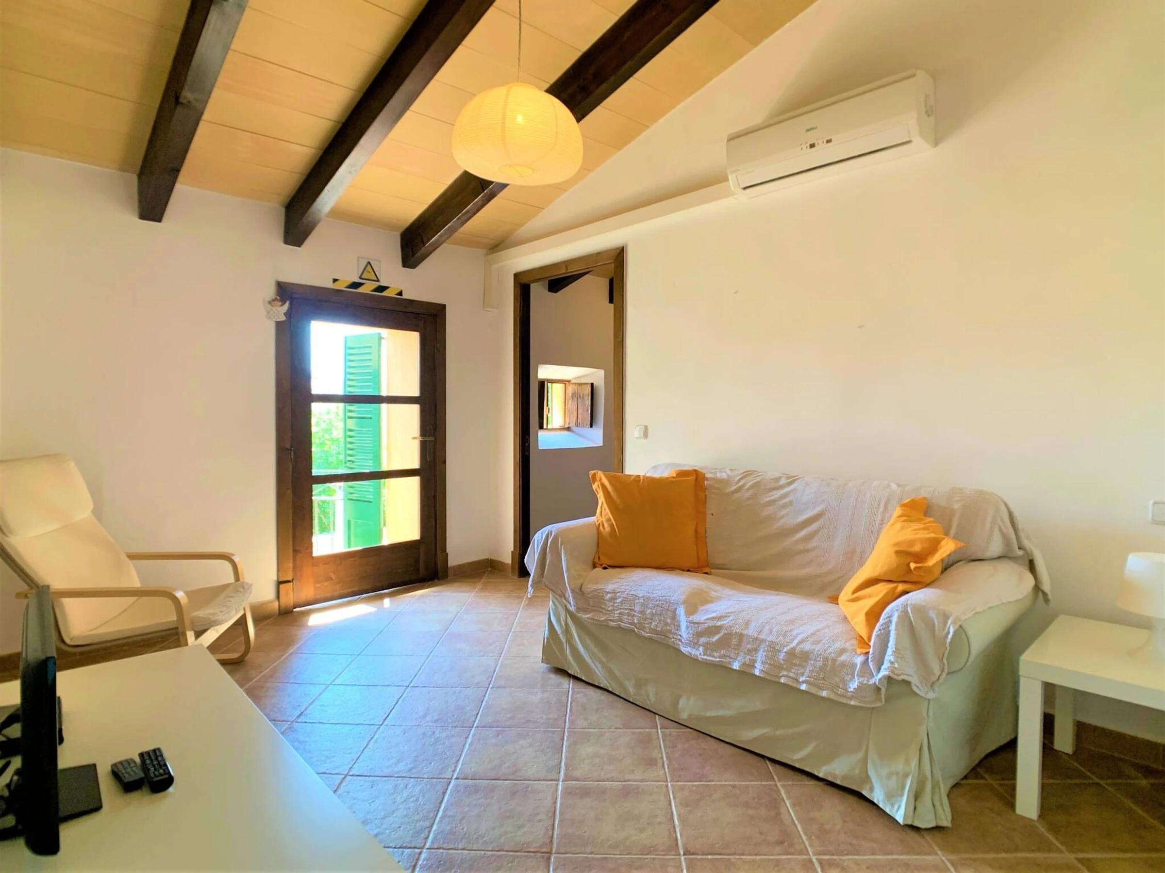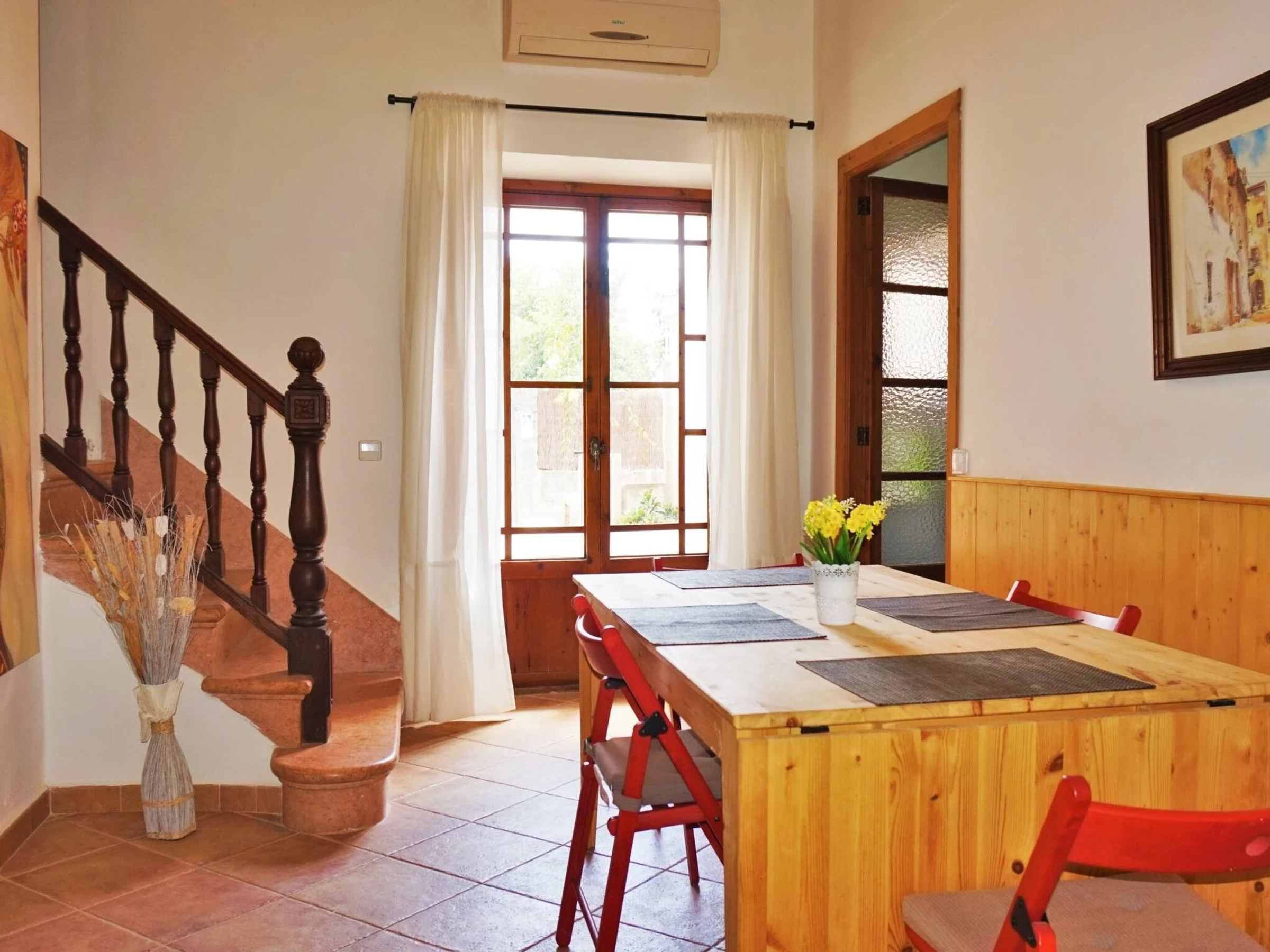 Can Torres is a Townhouse located in Porreres. The house has hot and cold A/C throughout. Sleeps up tp 10 adults. The dinning tables are extendable, so all guests can eat [hidden] house has a total of 5 double bedrooms. On the first floor you will find: Bedroom nº1 is a suite: has its own private sitting room and bathroom. Bedroom nº2 and nº3 have also a bathroom each and share a sitting room with a TV in it. the acces to bedroom nº3 is exterior, through a small balcony. On the gorund floor: Bedroom nº4 and bedroom nº5 (they share a the bathroom). The access to bedroom nº5 is exterior, through the main patio. All bedrooms have air conditioning (hot /cold).At the back of the house there is a stone floor patio with an outdoor fireplace, that can be used as a bbq, a dinning area, a solarium with sunlounges and a private pool. A gate separates the pool / solarium area from the rest of the patio to ensure children`s safety.
