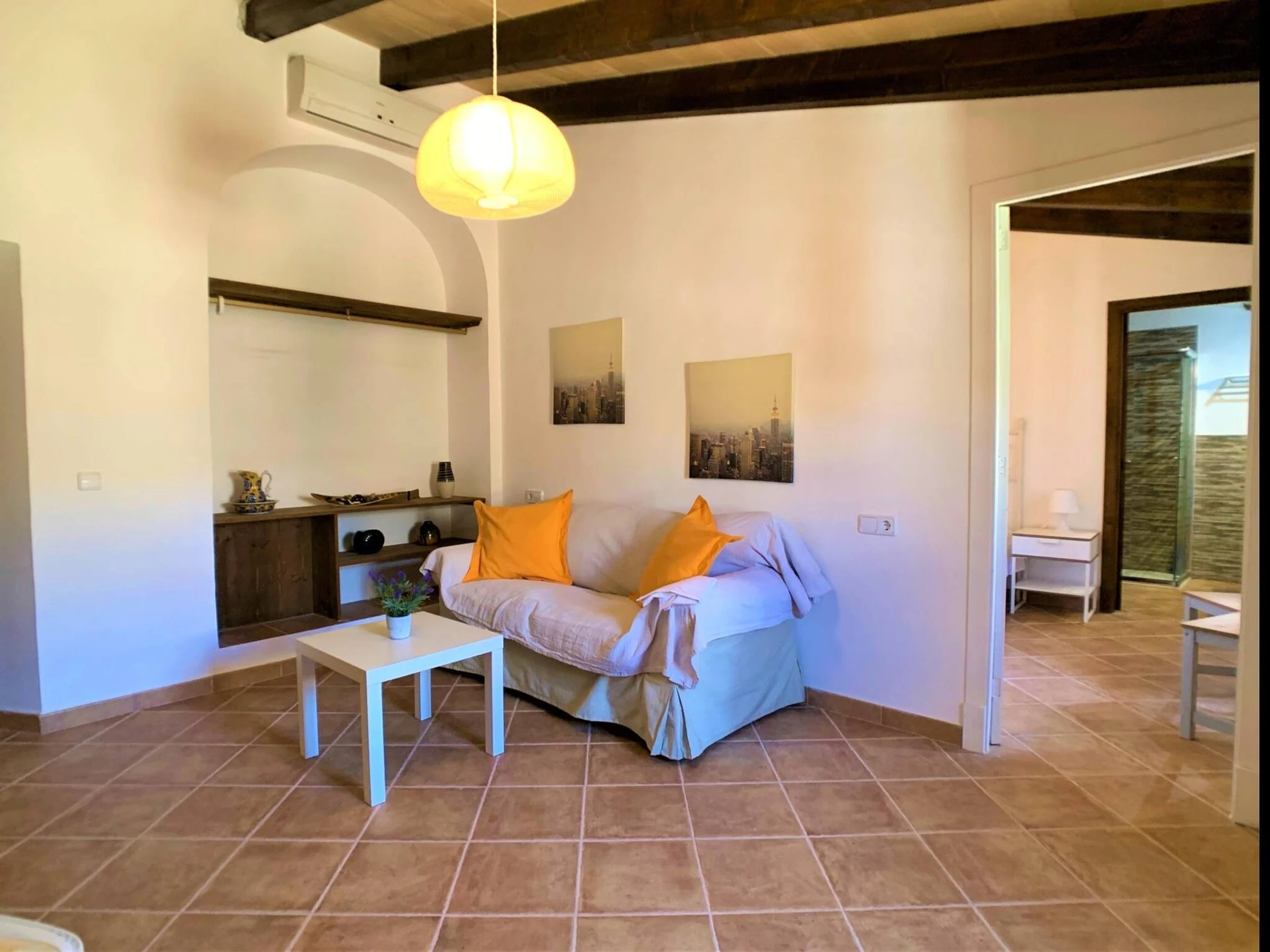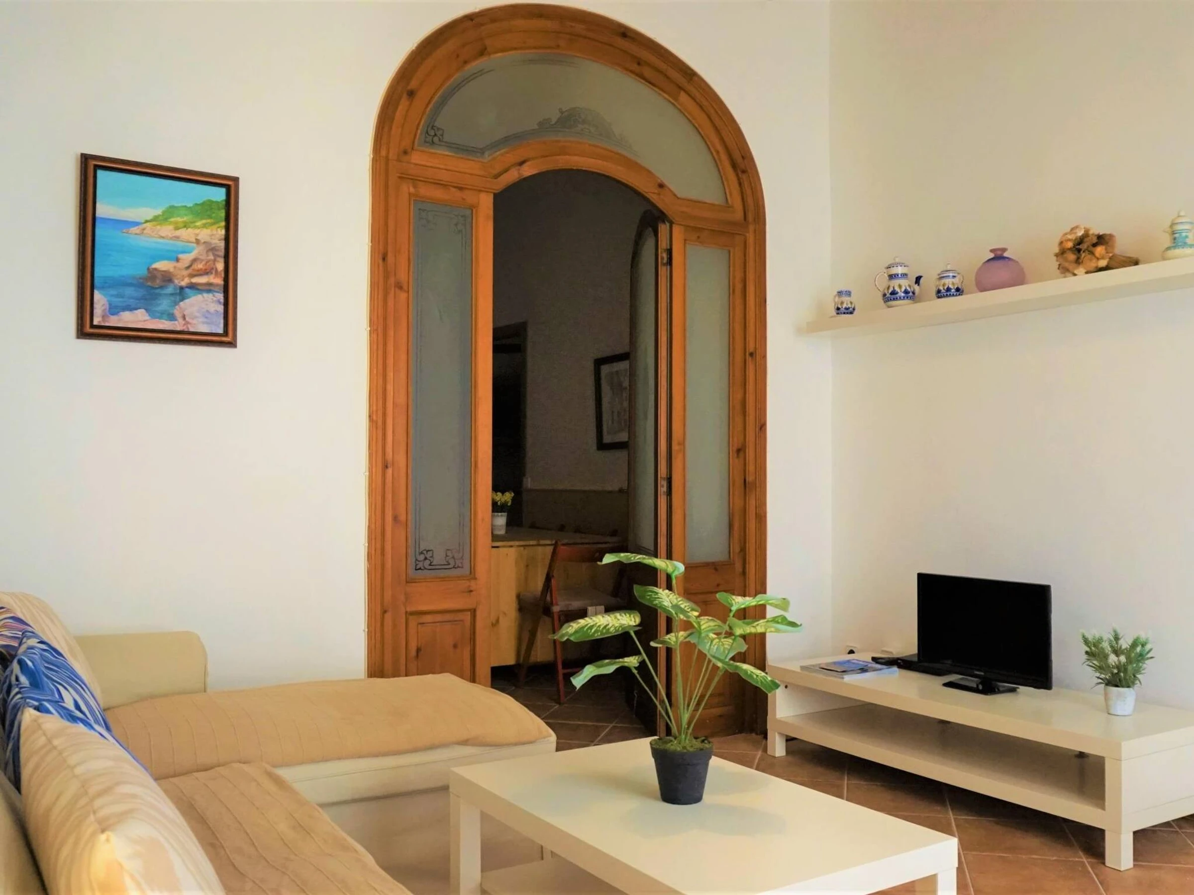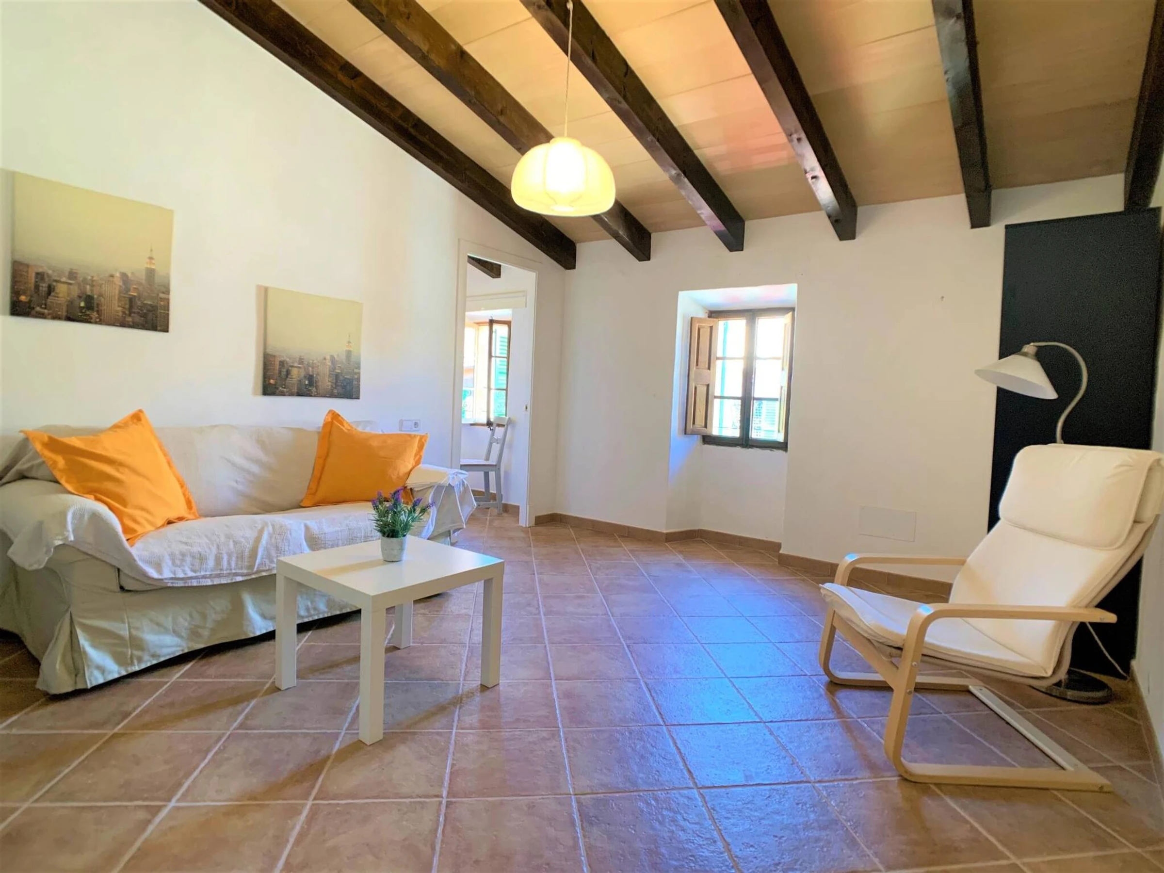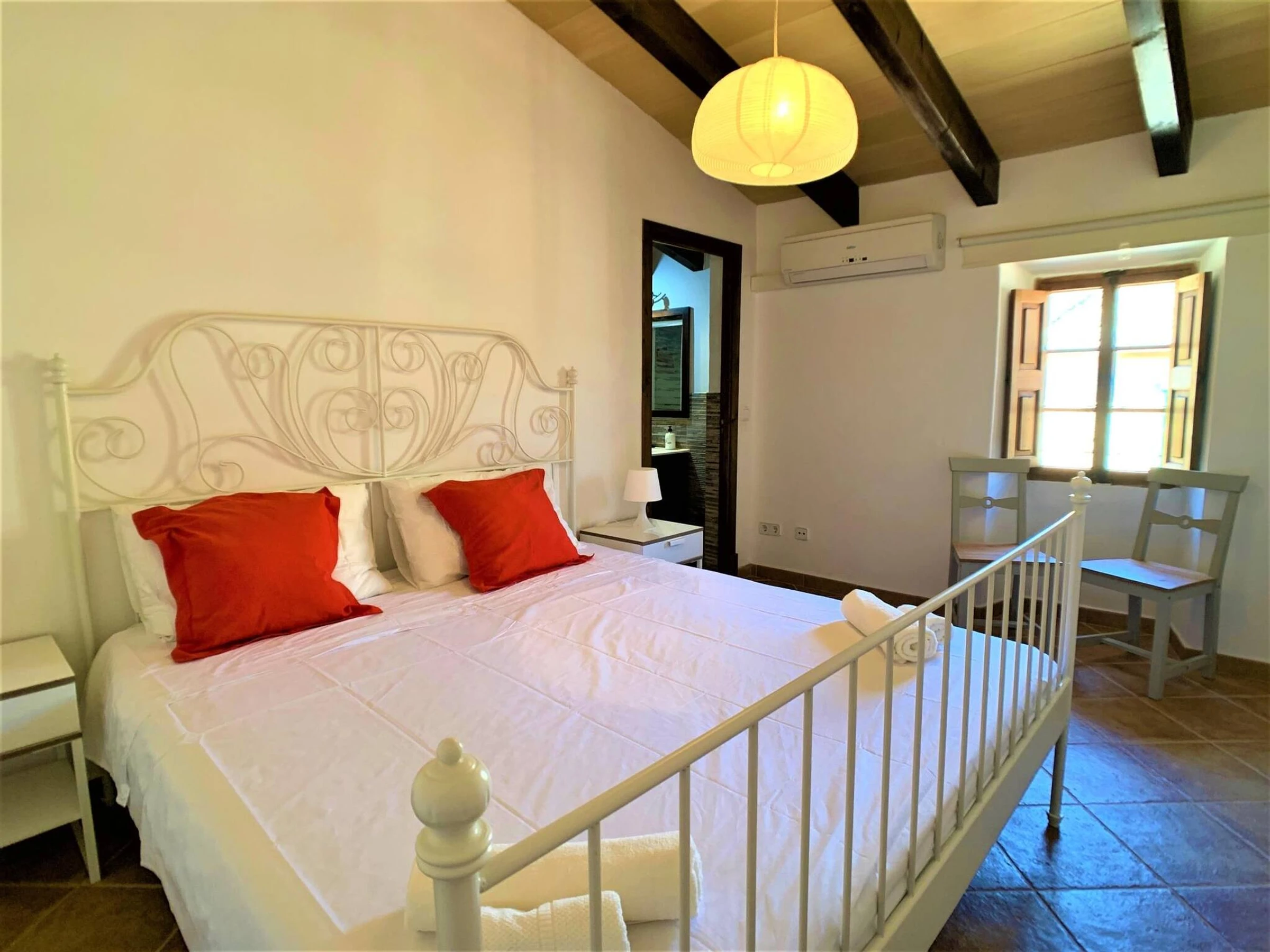 Can Torres is a Townhouse located in Porreres. The house has hot and cold A/C throughout. Sleeps up tp 10 adults. The dinning tables are extendable, so all guests can eat [hidden] house has a total of 5 double bedrooms. On the first floor you will find: Bedroom nº1 is a suite: has its own private sitting room and bathroom. Bedroom nº2 and nº3 have also a bathroom each and share a sitting room with a TV in it. the acces to bedroom nº3 is exterior, through a small balcony. On the gorund floor: Bedroom nº4 and bedroom nº5 (they share a the bathroom). The access to bedroom nº5 is exterior, through the main patio. All bedrooms have air conditioning (hot /cold).At the back of the house there is a stone floor patio with an outdoor fireplace, that can be used as a bbq, a dinning area, a solarium with sunlounges and a private pool. A gate separates the pool / solarium area from the rest of the patio to ensure children`s safety.