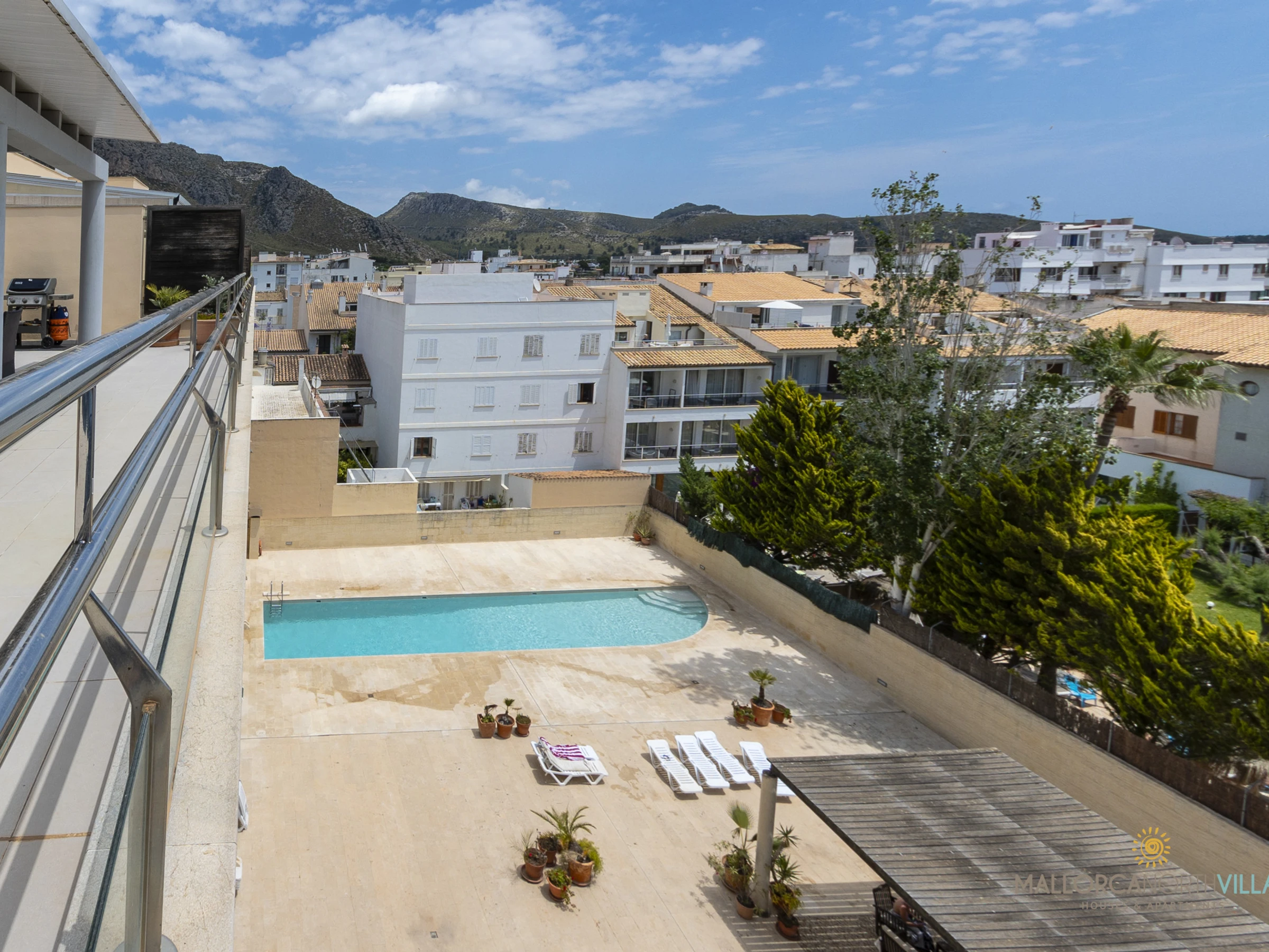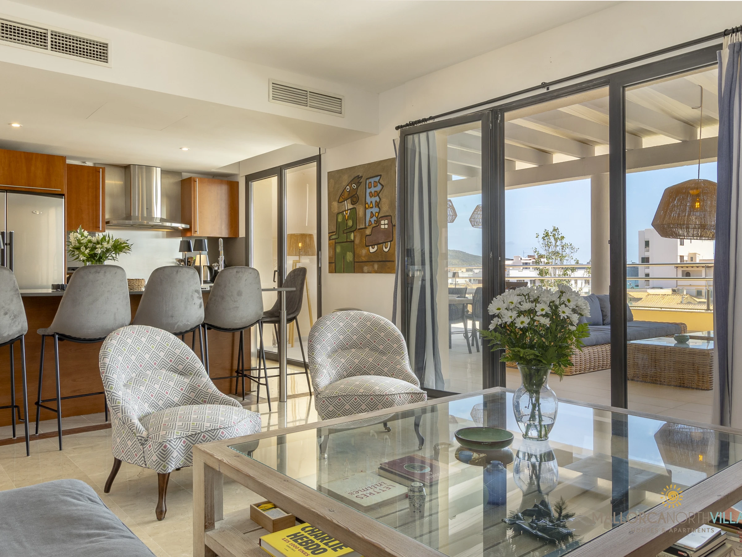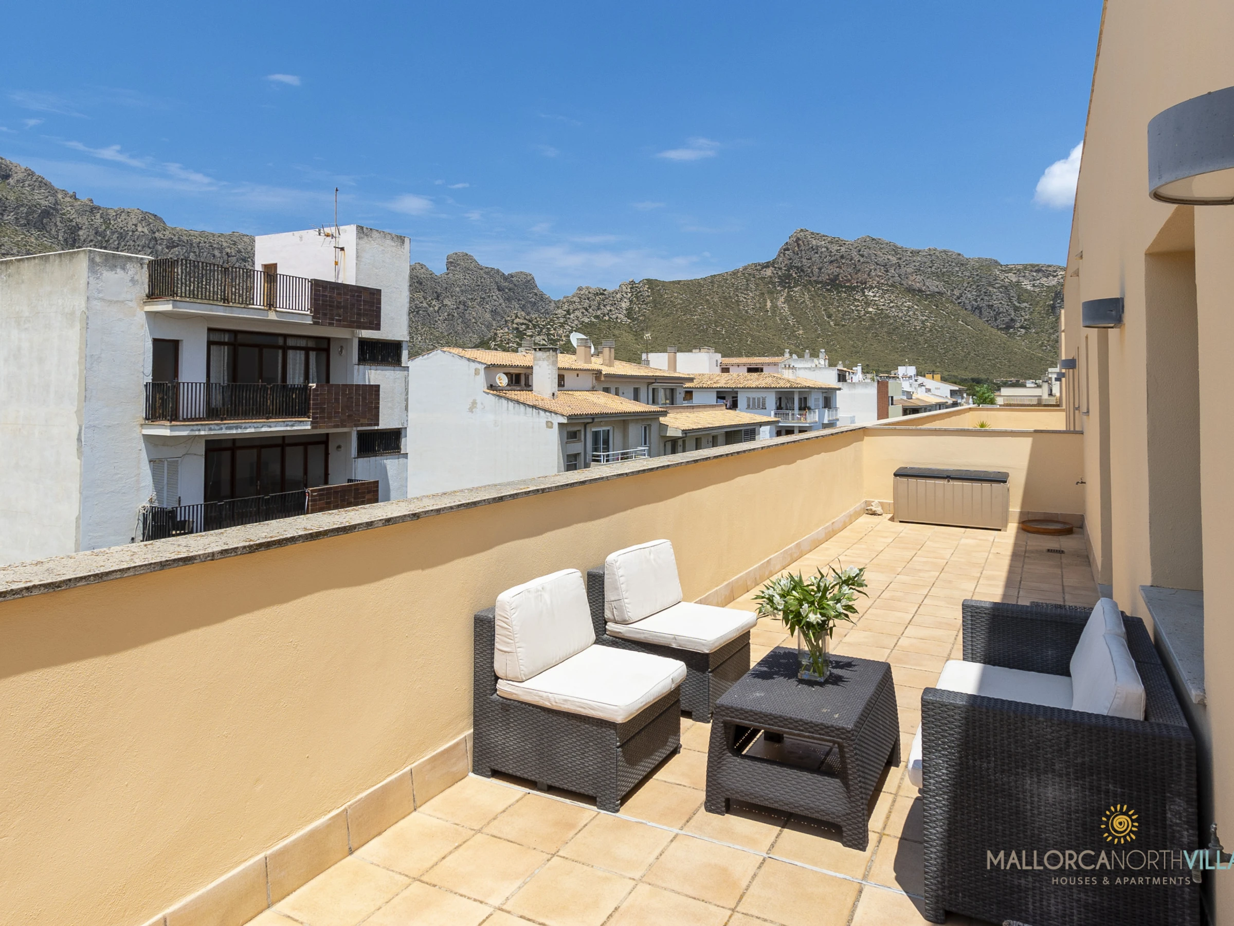 Enjoy the most authentic face of Puerto de Pollensa in this spectacular penthouse, perfect for winter holidays, Christmas in Mallorca, long stays or cycling and hiking getaways. Located in the heart of the town, a few steps from the square, the beach and restaurants, it combines a privileged location, comfort and impressive views of the mountains and partial view of the Mediterranean Sea.