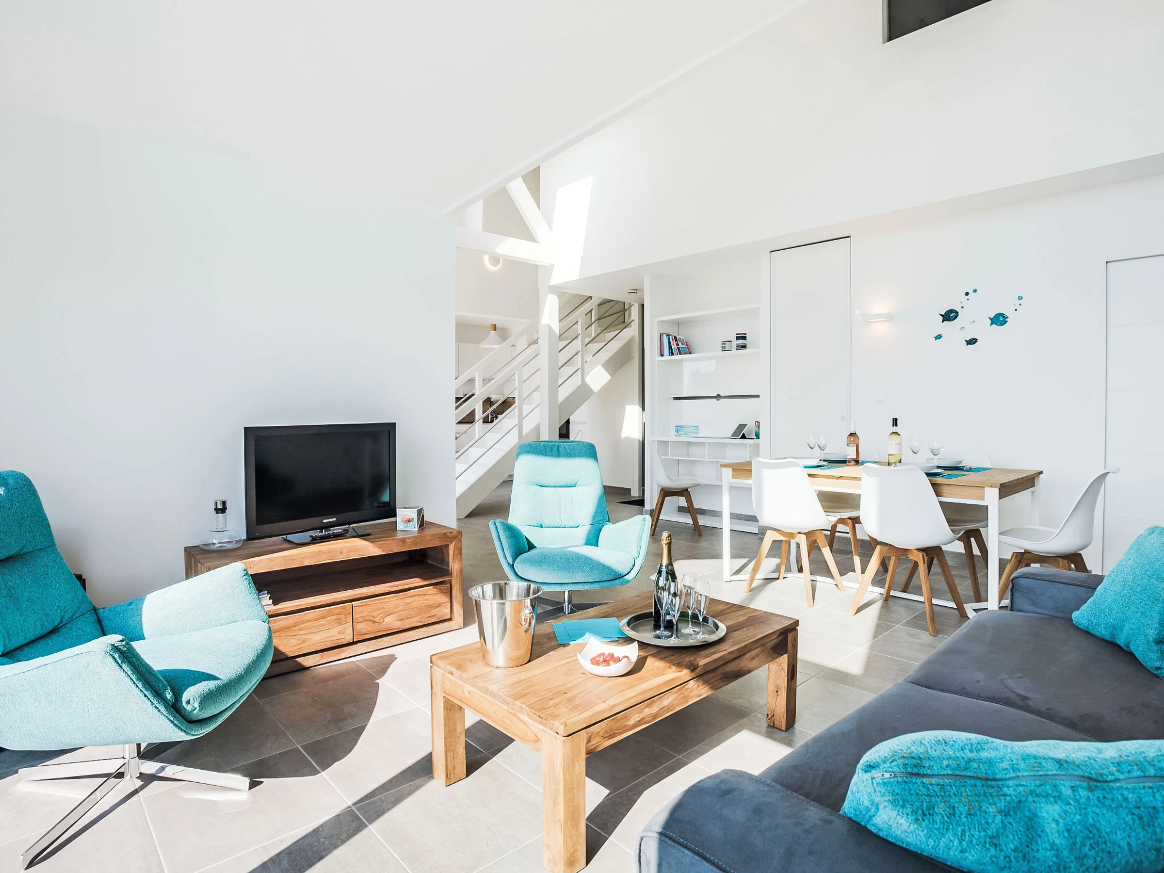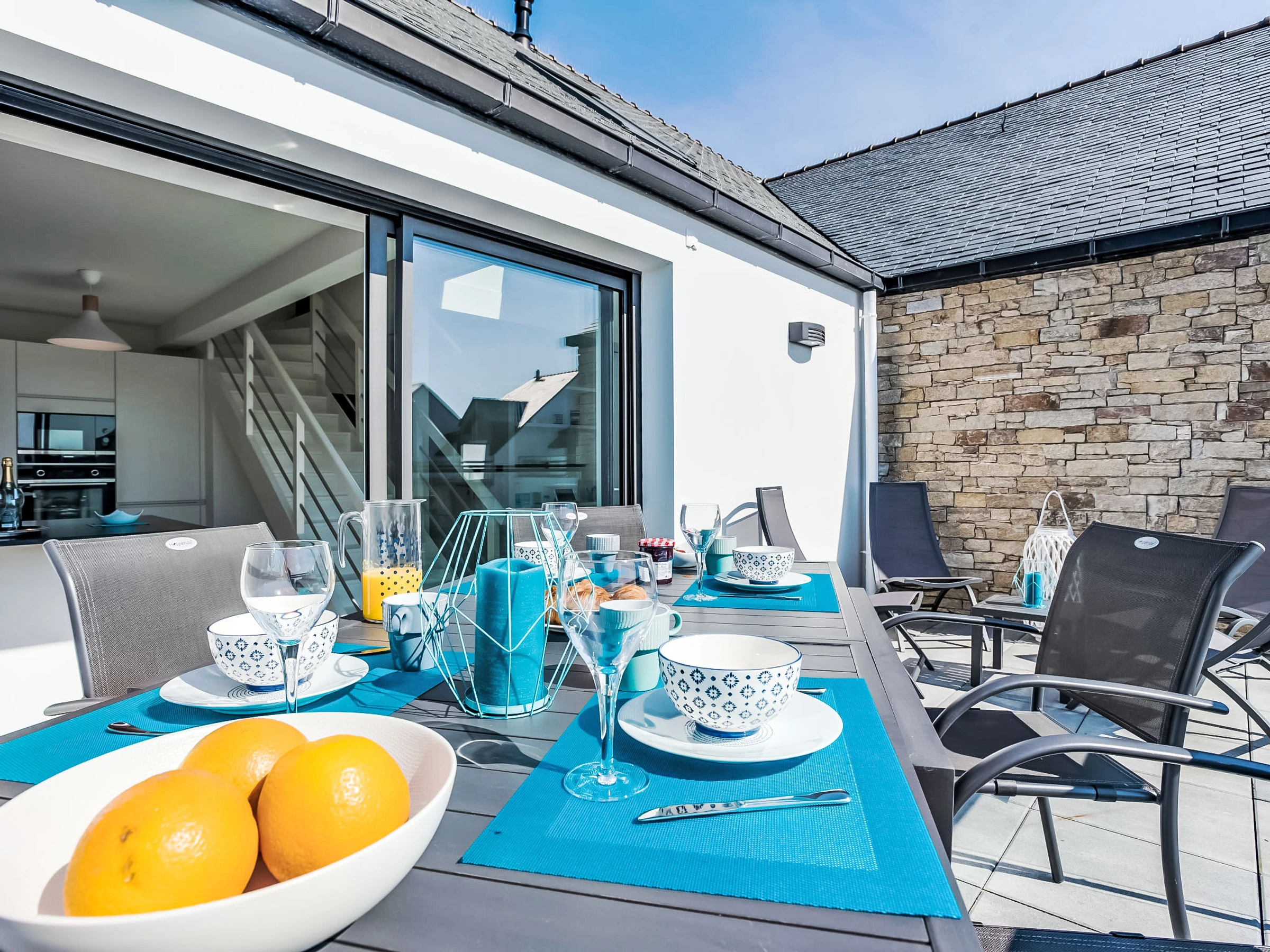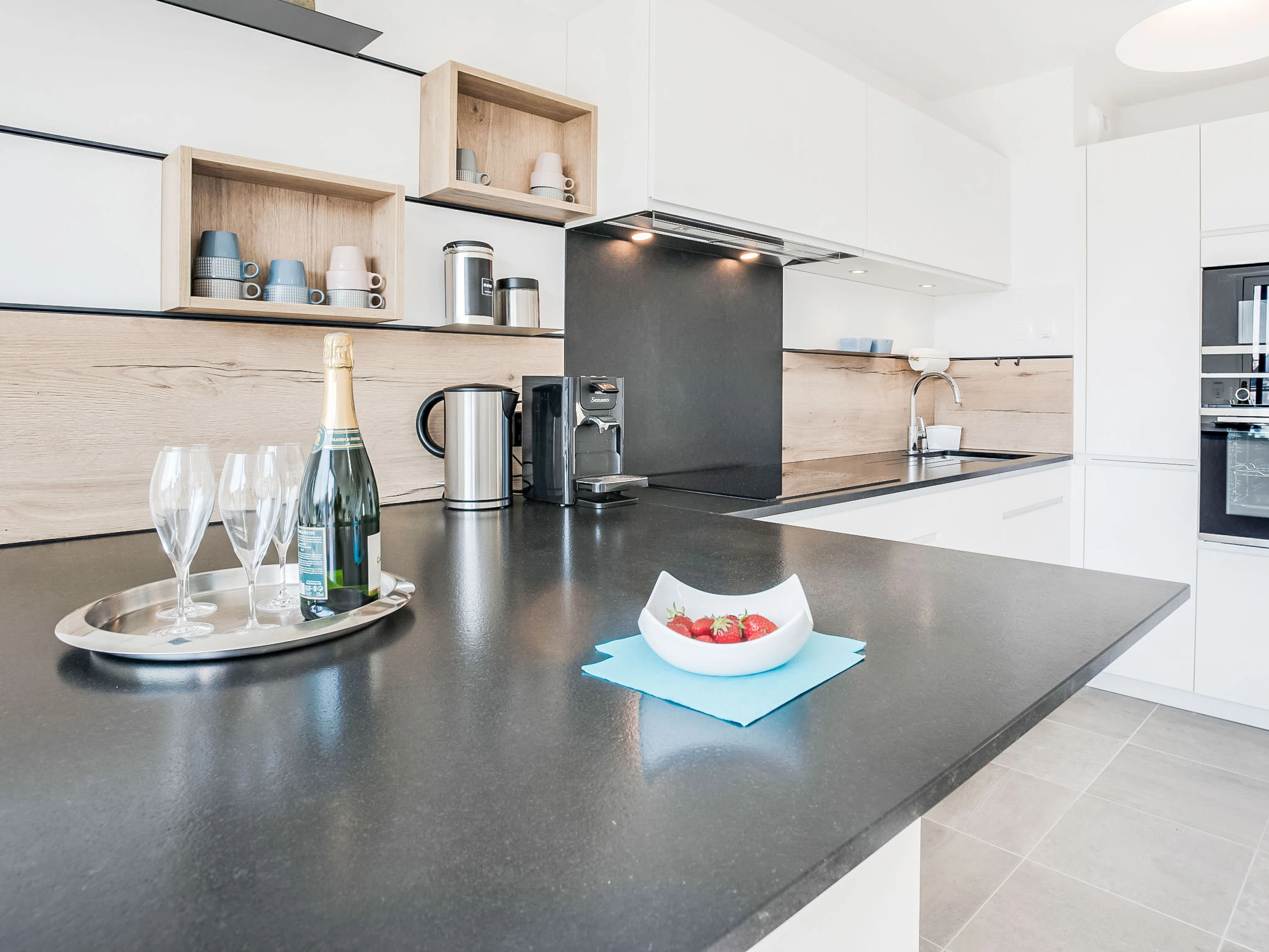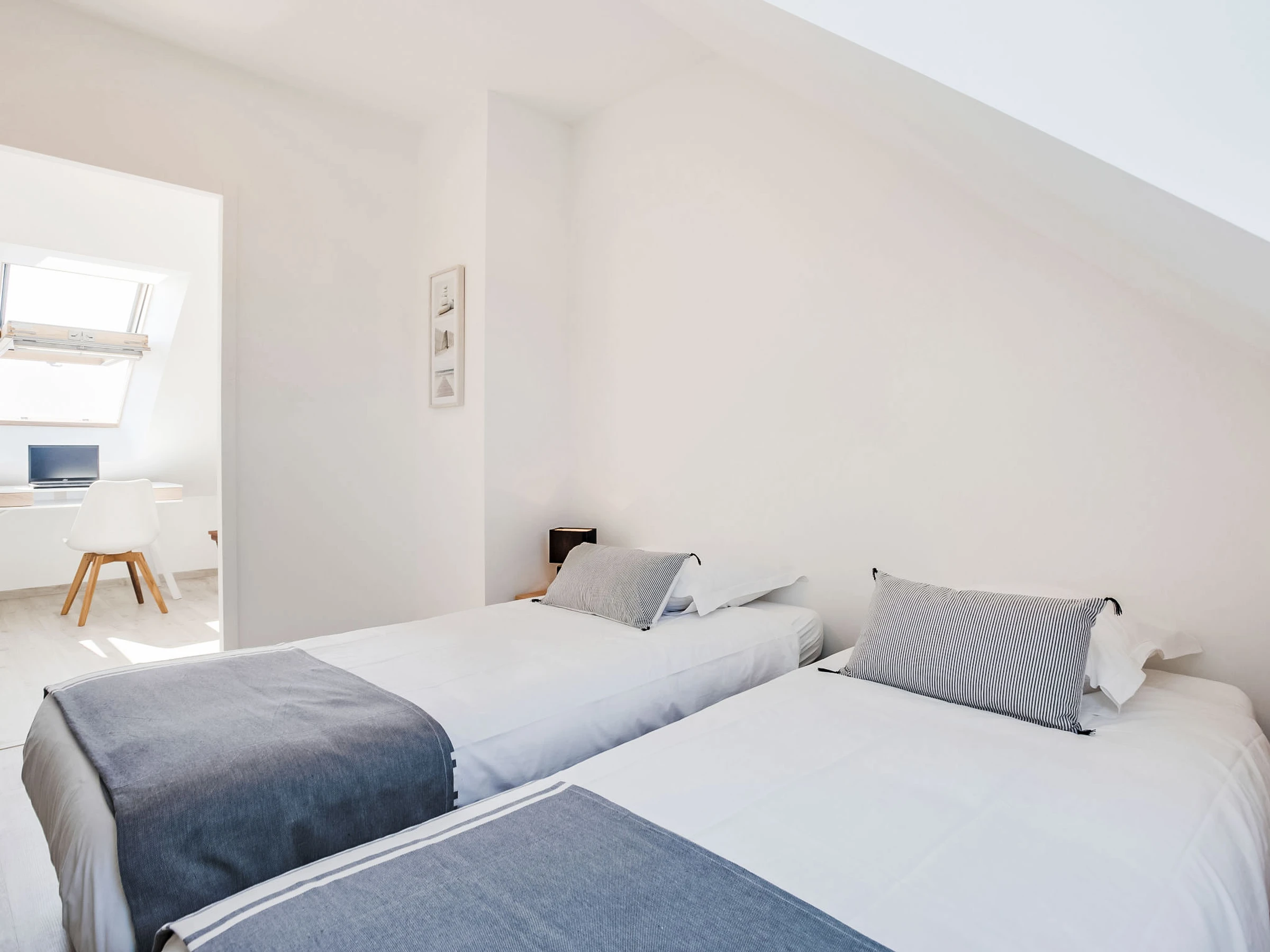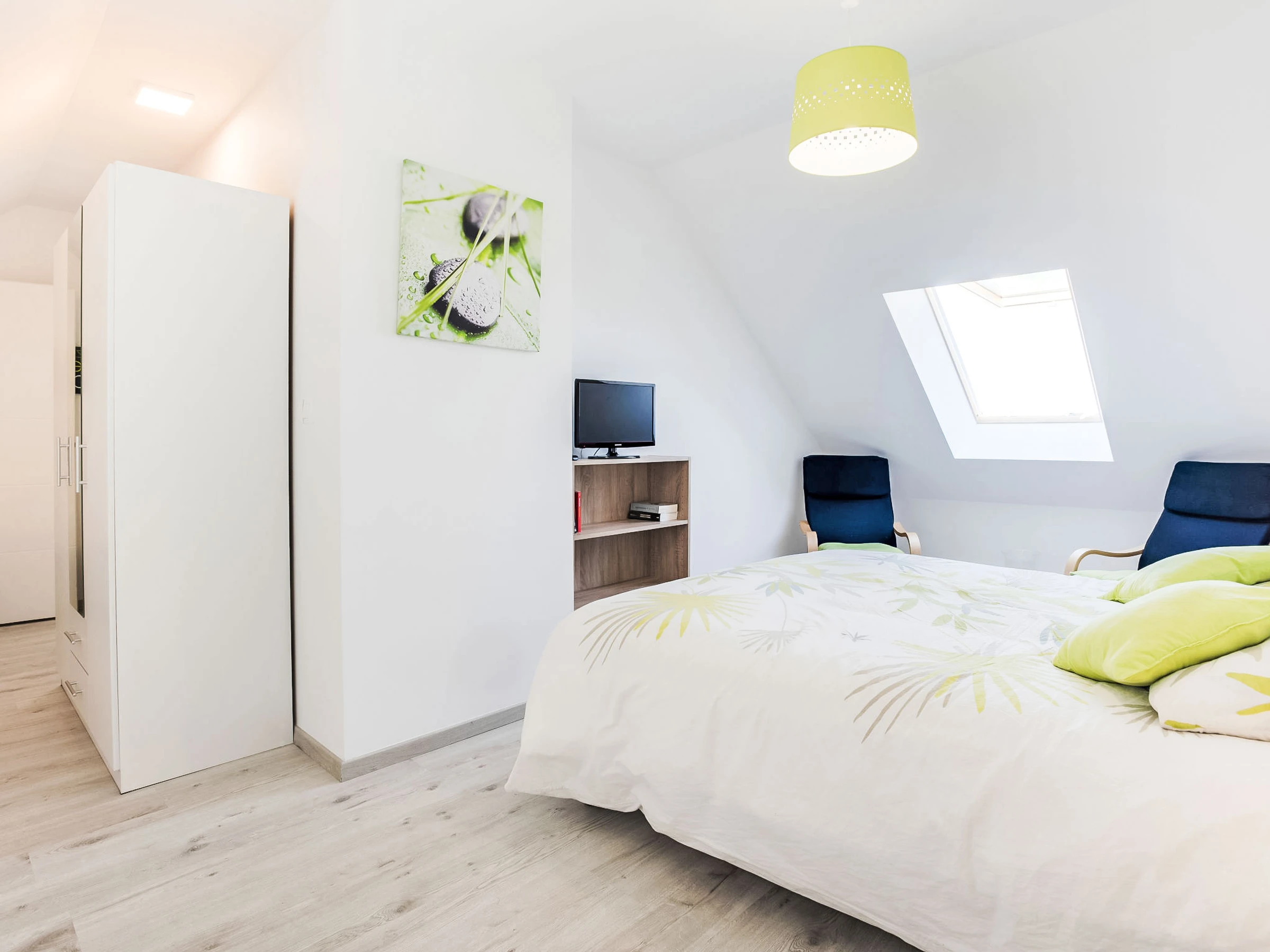 3-room apartment 100 m2 on 2 levels on 3rd floor. Beautiful and modern furnishings: living/dining room with TV (flat screen). Exit to the balcony. Open kitchen (oven, dishwasher, 3 induction hot plates, microwave, freezer, electric coffee machine, Capsules for coffee machine (Senseo) extra). Exit to the terrace. Shower, sep. WC. Gas heating. Upper floor: 1 room with 1 french bed (1 x 160 cm, length 200 cm), shower/WC. 1 room with 2 beds (80 cm, length 200 cm). Large terrace 15 m2. Terrace furniture. Partial view of the sea. Facilities: washing machine, dryer, hair dryer. Internet (WiFi, free). Parking space n 25, garage (1 car). Please note: smoke alarm. [hidden]