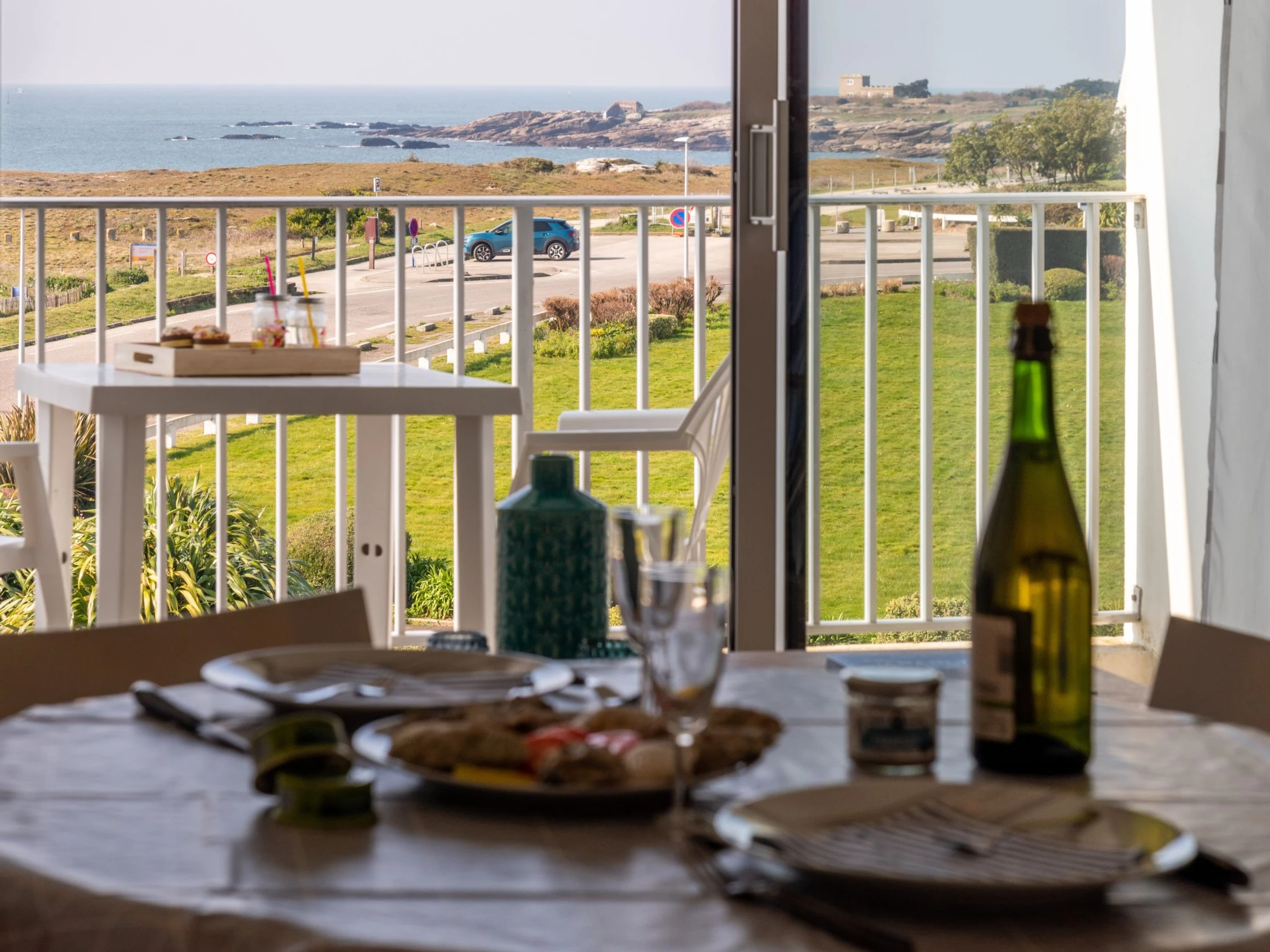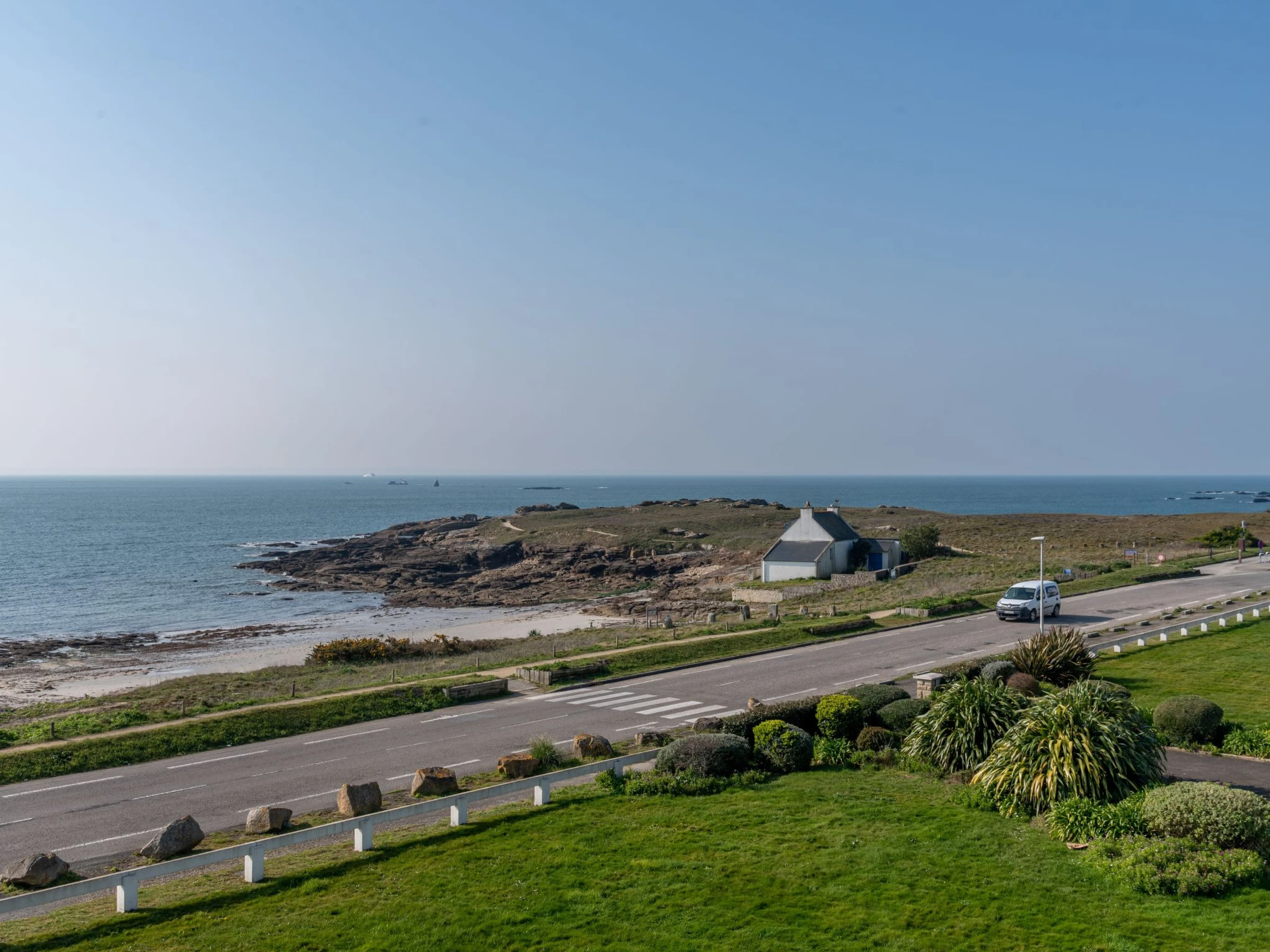 Quiberon: Small residence "Les Trois Iles", 2 storeys. In the resort 2 km from the centre of Quiberon, in a quiet position, 20 m from the sea, 30 m from the beach. Parking. Shop 1.5 km, grocery 2 km, supermarket 2.4 km, restaurant 2 km, bus stop 200 m, railway station "Quiberon" 2.5 km, ferry "Port Maria" 2.5 km, sandy beach "Plage du Conguel" 600 m, thermal baths "Thalassothérapie de Quiberon" 200 m. Marina 3 km, golf course (9 hole) 500 m, sailing school 3 km. Nearby attractions: Presqu'ile de Quiberon et côte sauvage 3 km, Gare maritime les iles Houat, Hoedic. 3 km, Les alignements de Carnac 26 km, Auray et le port de St Goustan 33 km, Vannes 48 km, Lorient 63 km. The keys‘ handover takes place by the agency in Quiberon, 2 km.
