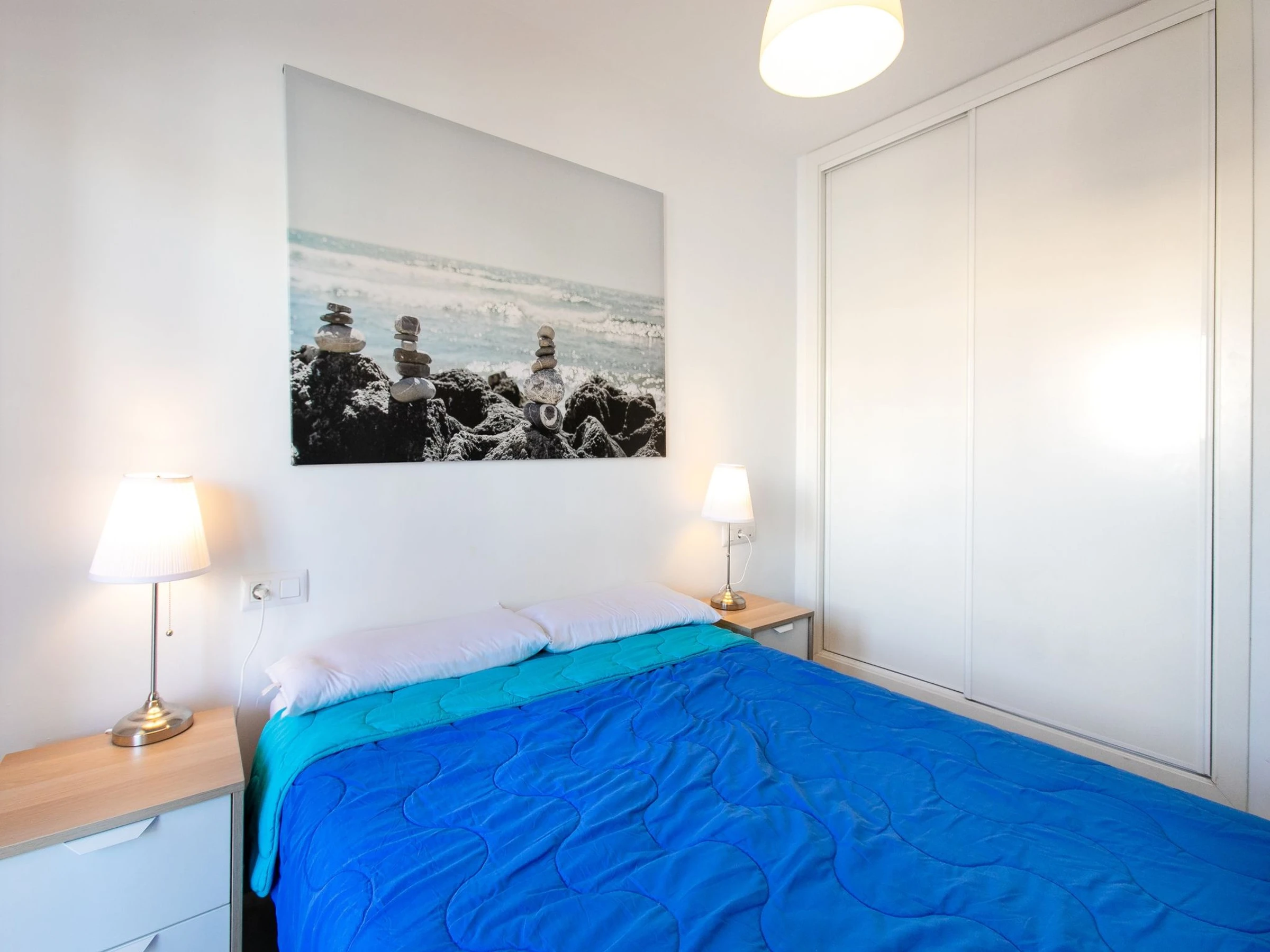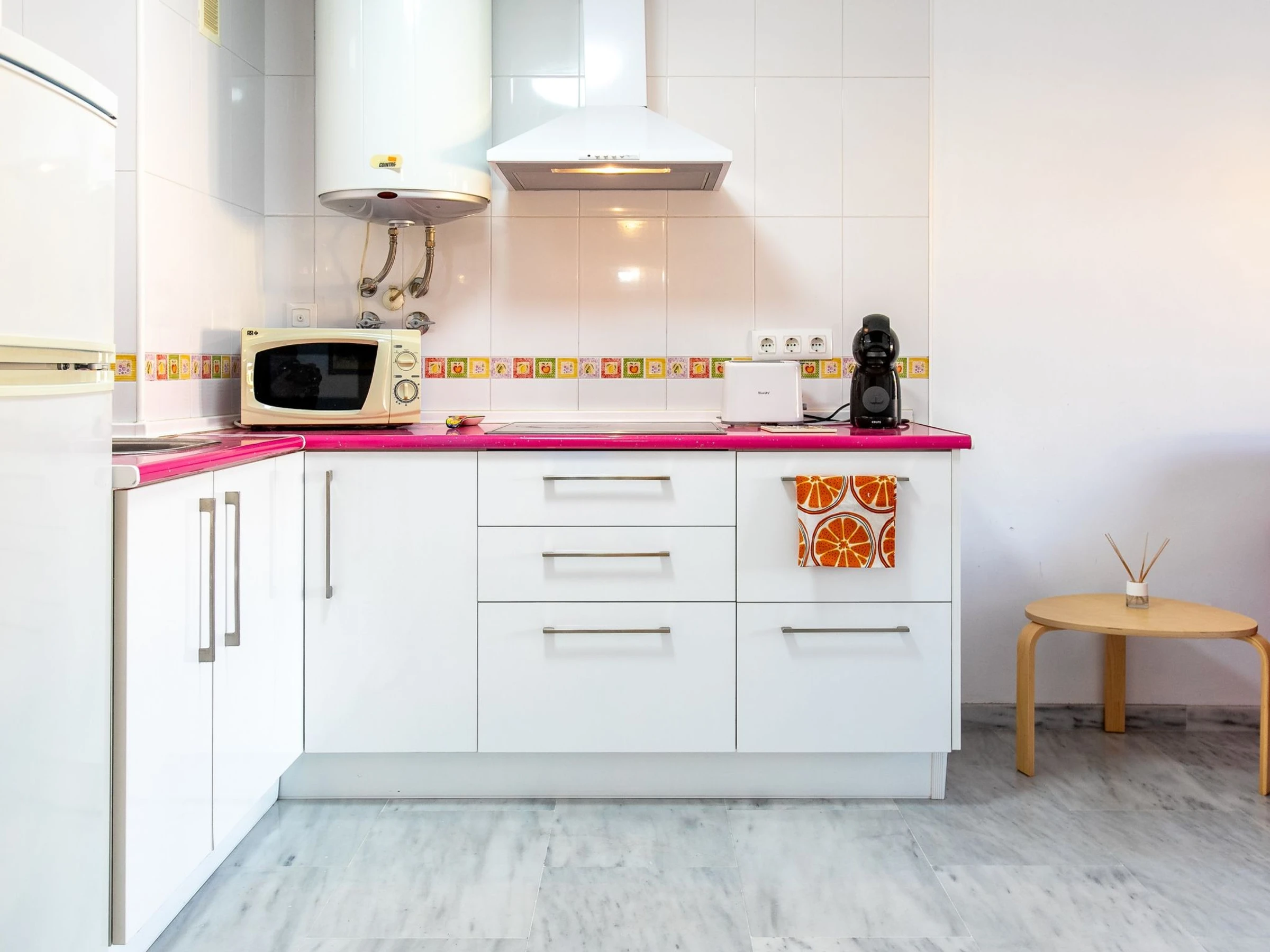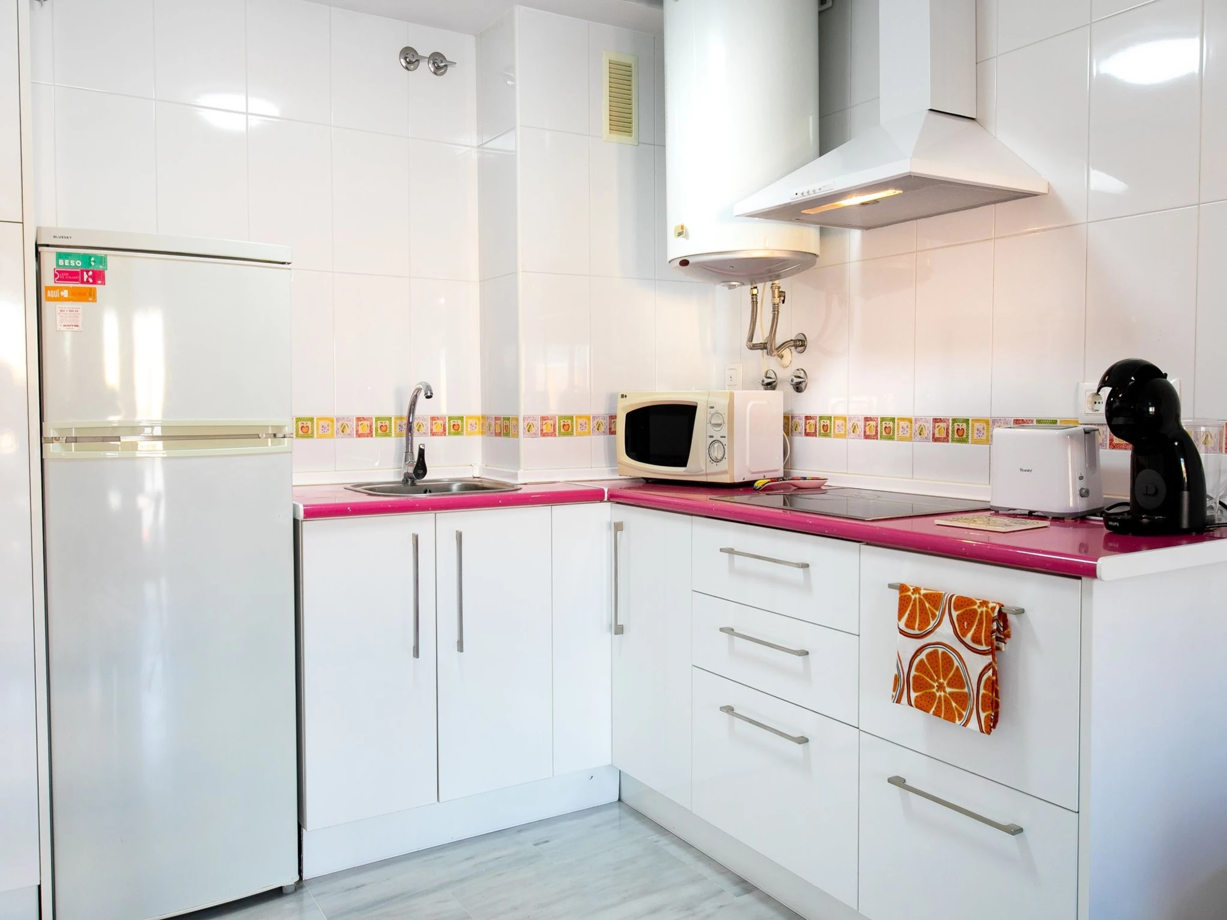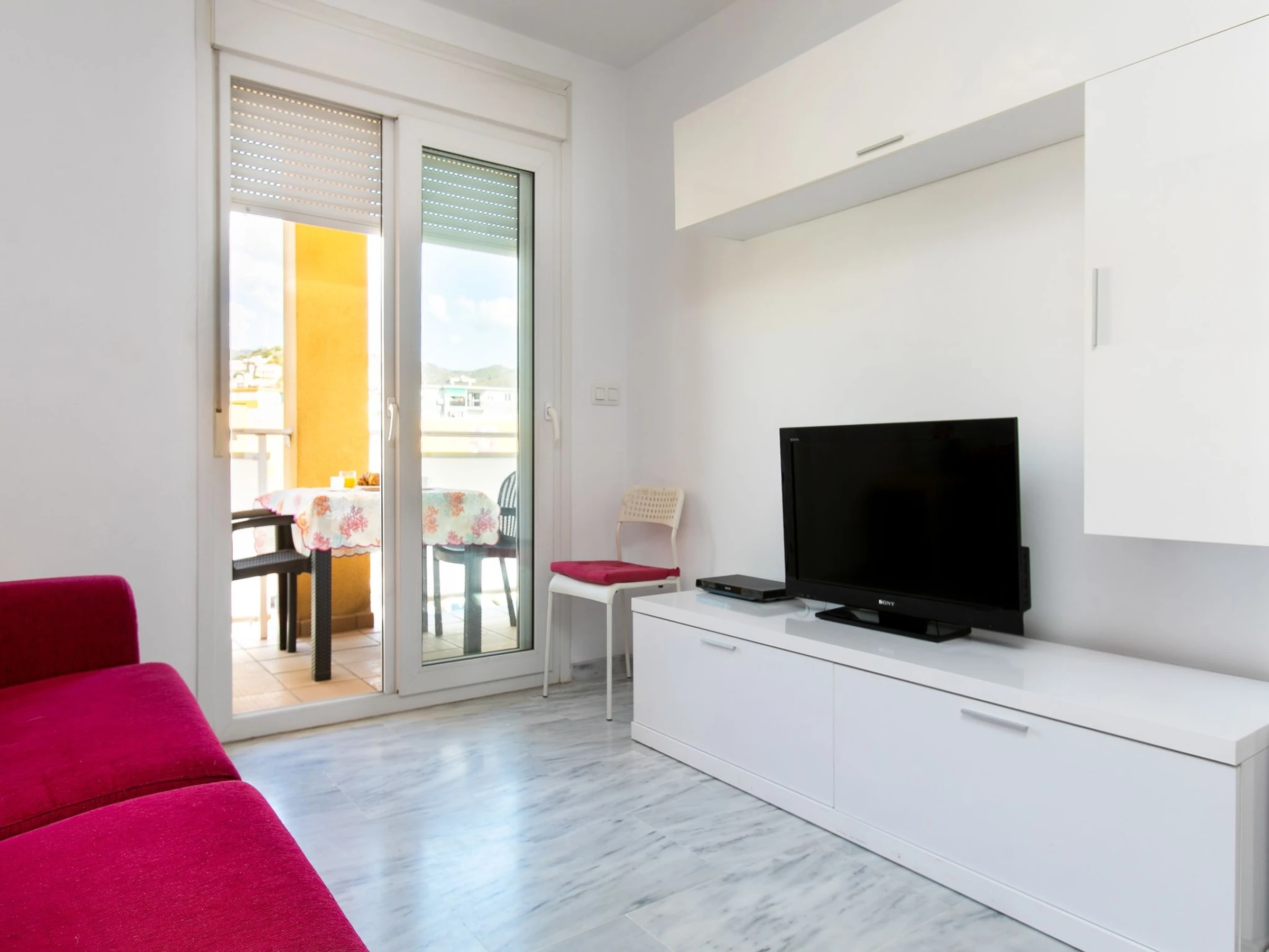 "Sunny apartment", 2-room apartment 45 m2. Beautiful and cosy furnishings: living/dining room with 1 sofabed (140 cm, length 190 cm), digital TV, air conditioning and forced-air heating. Exit to the terrace. 1 room with 1 french bed (1 x 140 cm, length 190 cm), air conditioning and forced-air heating. Exit to the terrace. Open kitchen (3 ceramic glass hob hotplates, toaster, kettle, microwave, freezer, electric coffee machine). Shower/WC. Boiler (100 litres). Small terrace. Terrace furniture. View of the town. Facilities: washing machine, iron, hair dryer. Internet (WiFi, free). Please note: maximum 1 small pet/ dog allowed. TV only ES. [hidden] // Reg. Nr.: ESFCTU0000290250009229970000000000000000[hidden]9