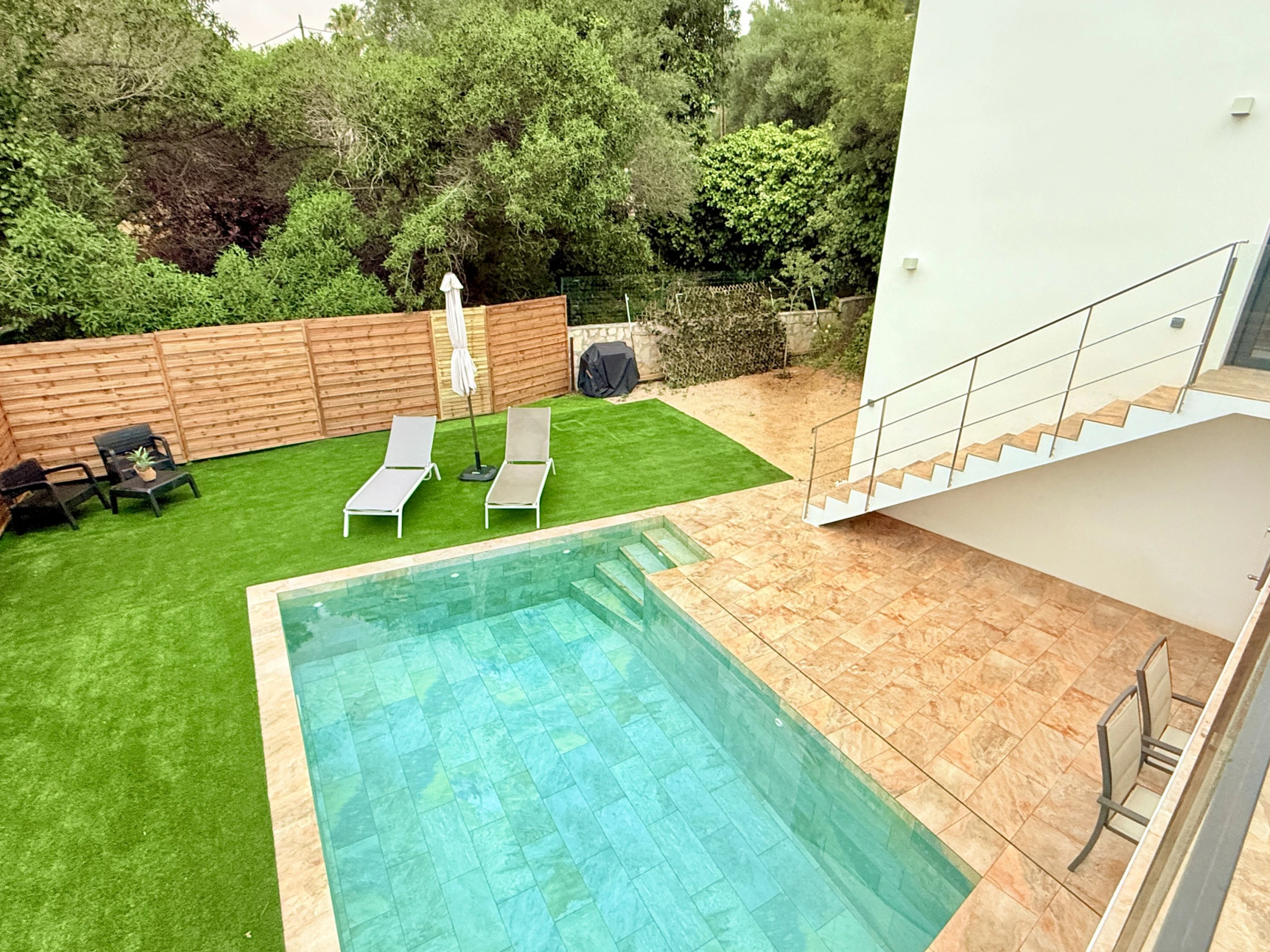 From the terrace, stairs lead to the private pool and garden, where privacy and tranquility are guaranteed. Here you can enjoy the Mediterranean sun or relax in the shade, immerse yourself in the crystal-clear water or simply disconnect with the sound of the sea breeze. A corner designed so that each moment is pure pleasure.