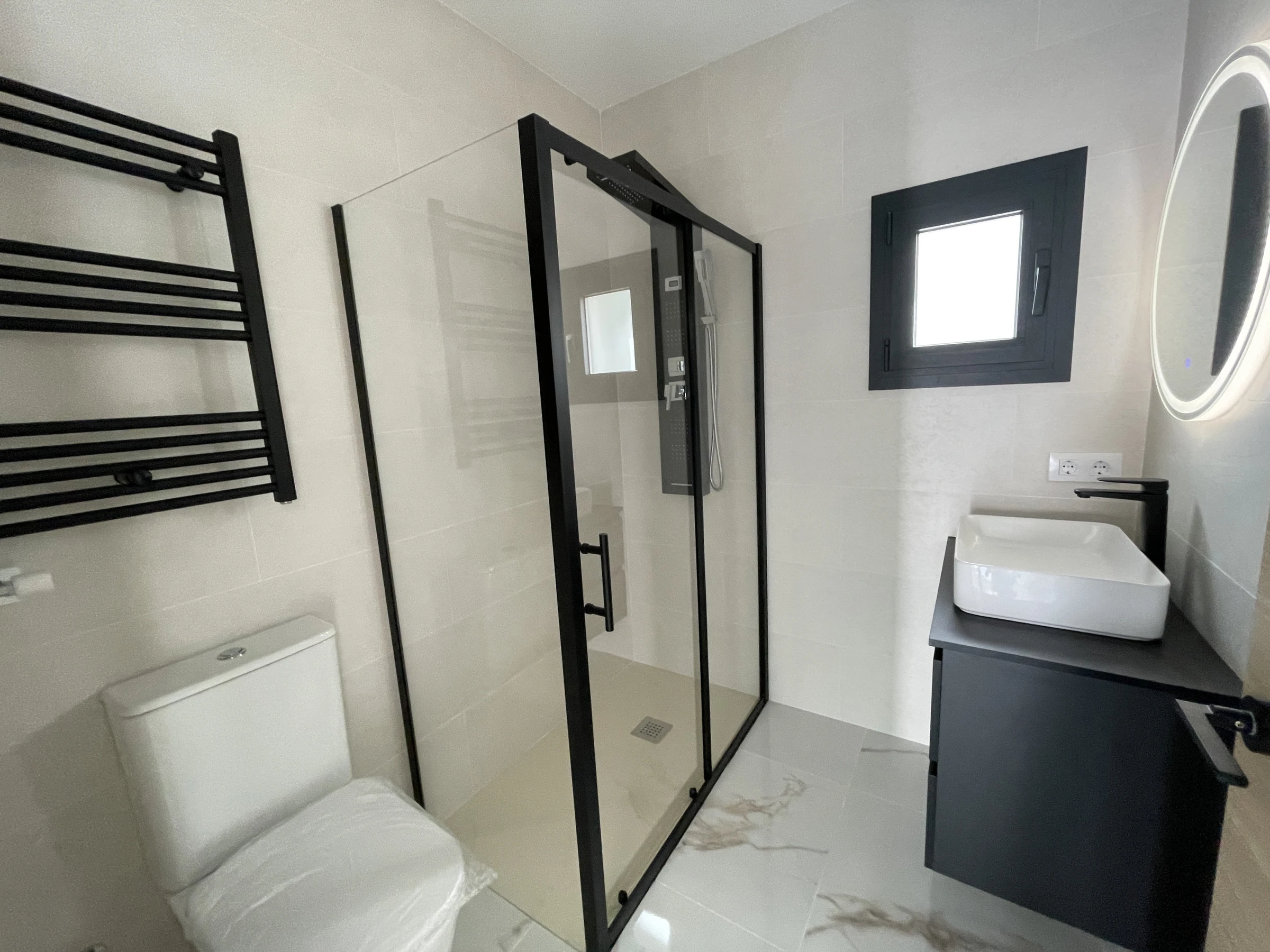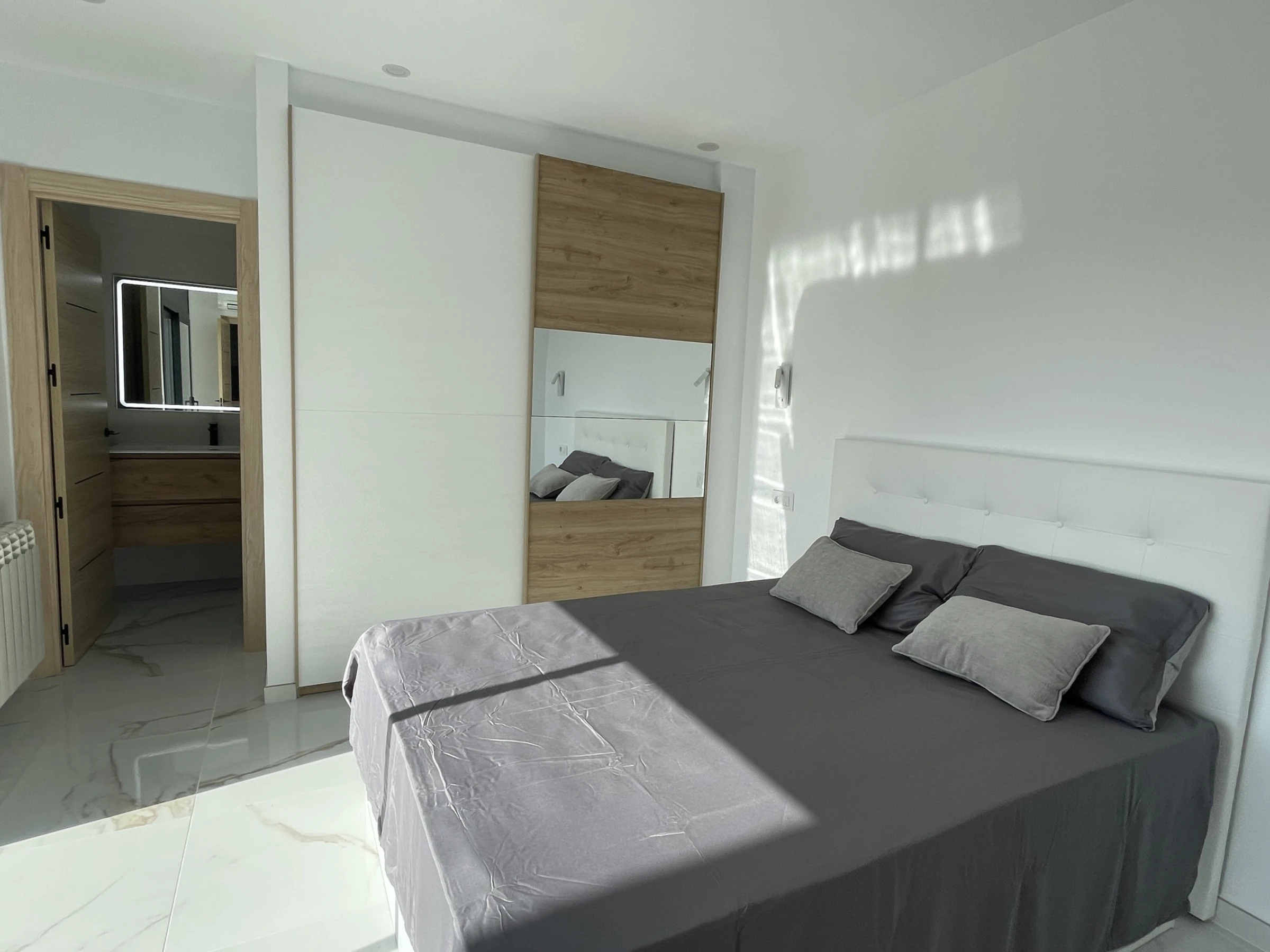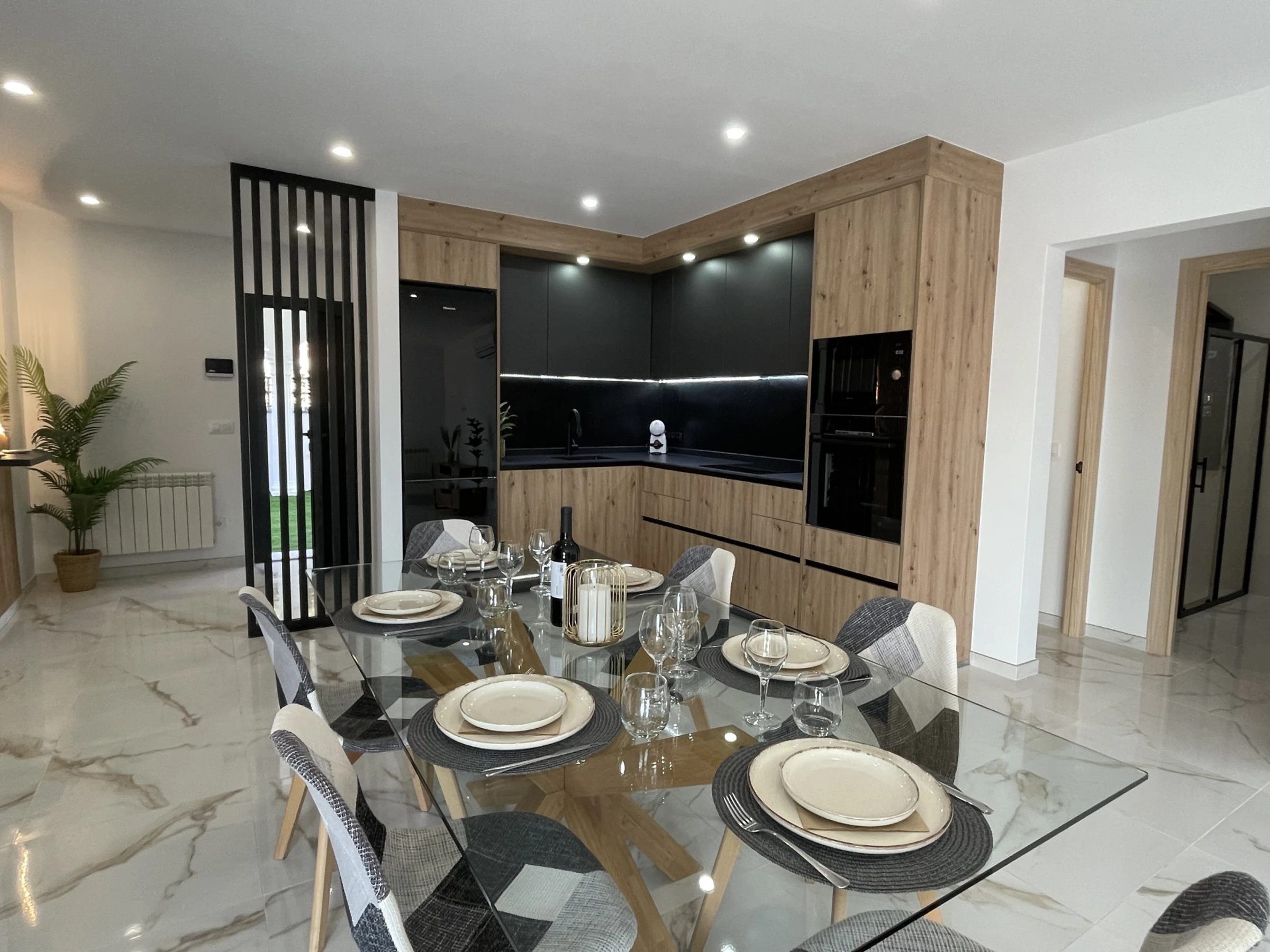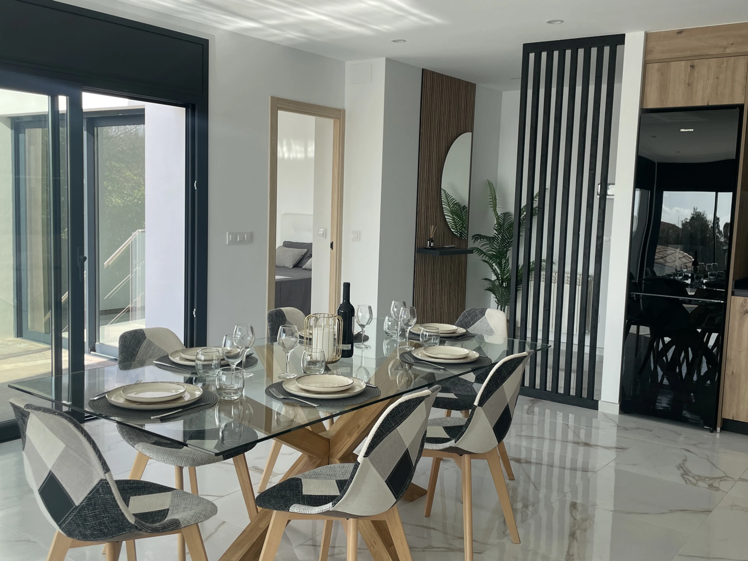 Distributed on a single floor without stairs, this villa has been designed to offer maximum comfort. The spacious living room, flooded with natural light, opens to a modern kitchen fully equipped with dishwasher, coffee maker, toaster, kettle, and all the necessary kitchenware. The connection with the outdoor terrace is fluid and harmonious, creating a perfect space to enjoy dinners outdoors while the sun sets behind the mountains.