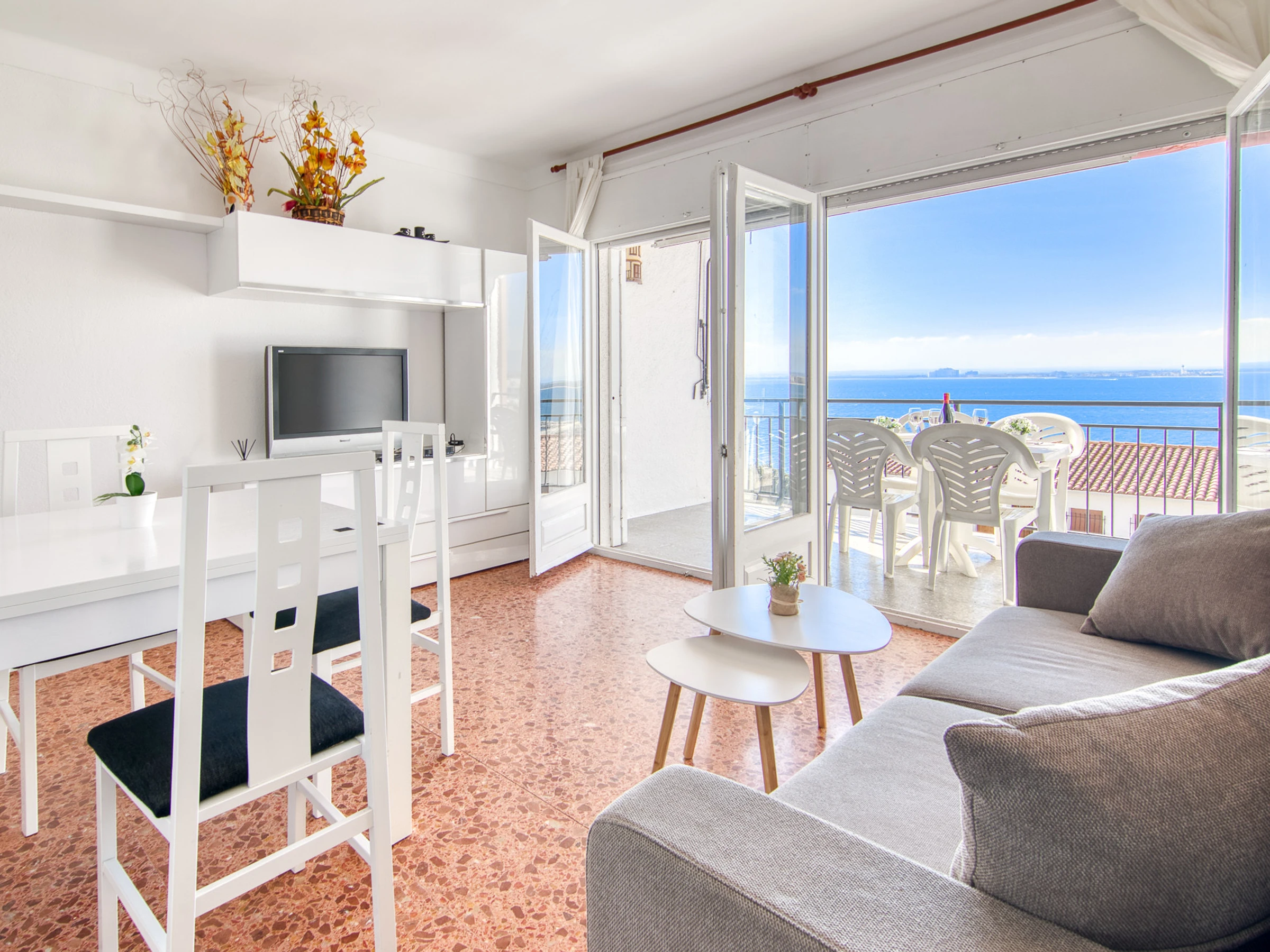 The apartment has charming terrace furniture and an 8 m² terrace, perfect for enjoying the views and the Mediterranean climate. It also has satellite television for your comfort.